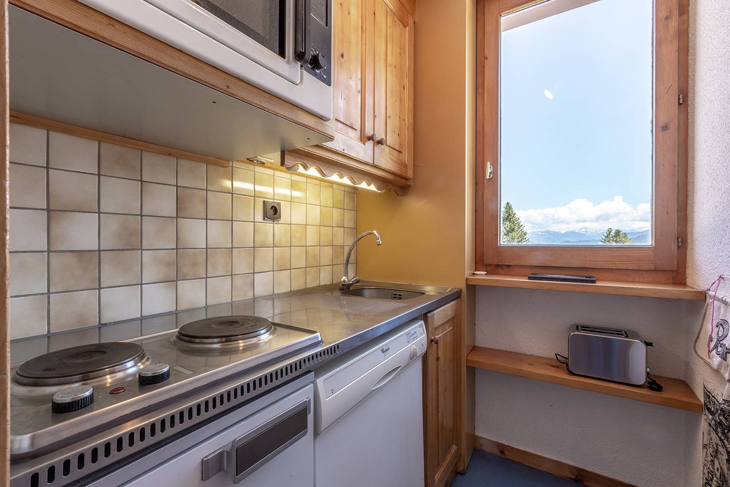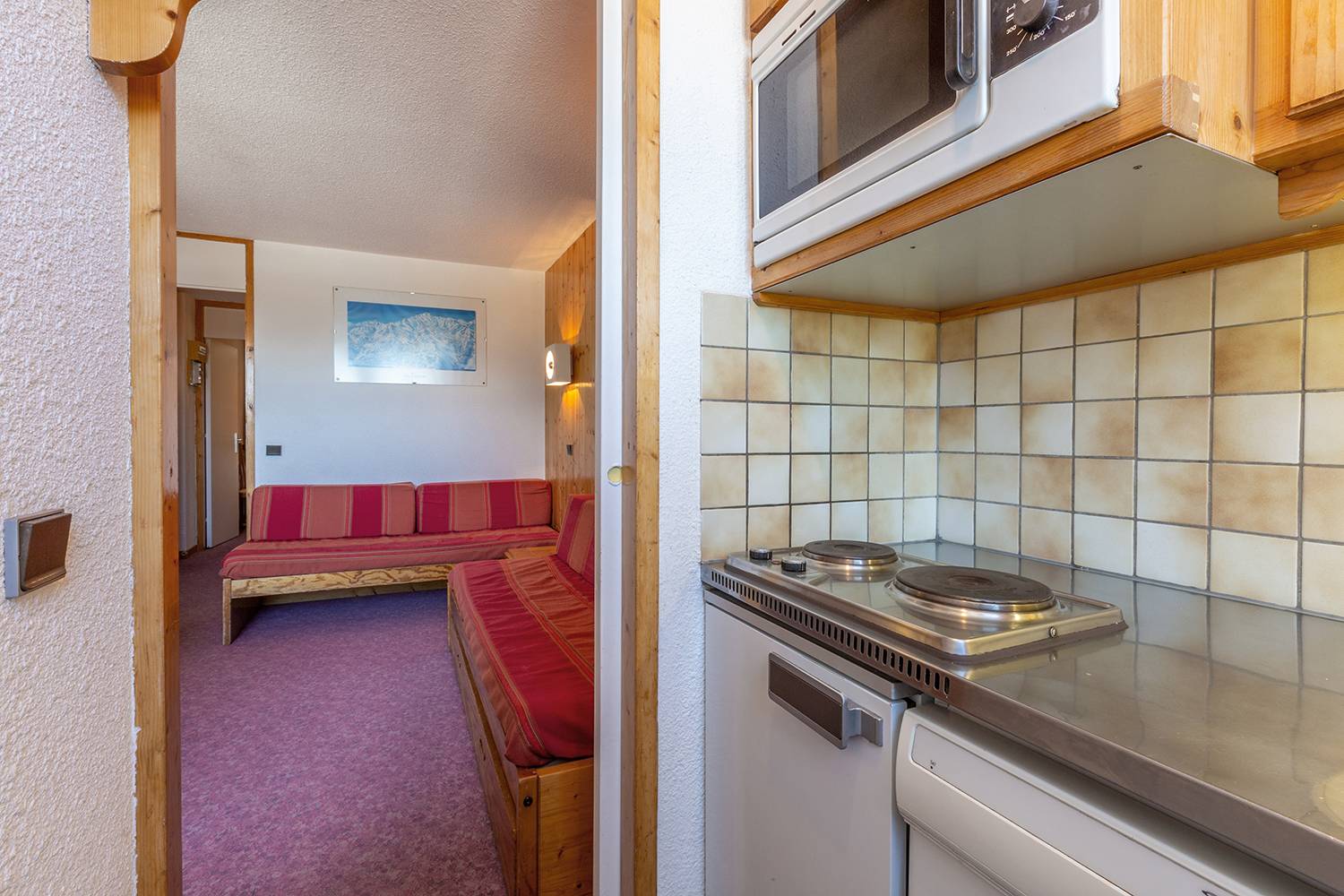 The lounge is equipped with 2 single beds and a trundle bed (80x190), a TV, and a balcony. The bedroom features 2 single beds (80x190). The kitchen is fitted with a glass hob, a dishwasher, oven, fridge, toaster, kettle and coffee maker. The bathroom and toilets are separate. WIFI. Ski loker and lift in the residence. 2nd floor. BED LINEN AND TOWELS NOT INCLUDED.