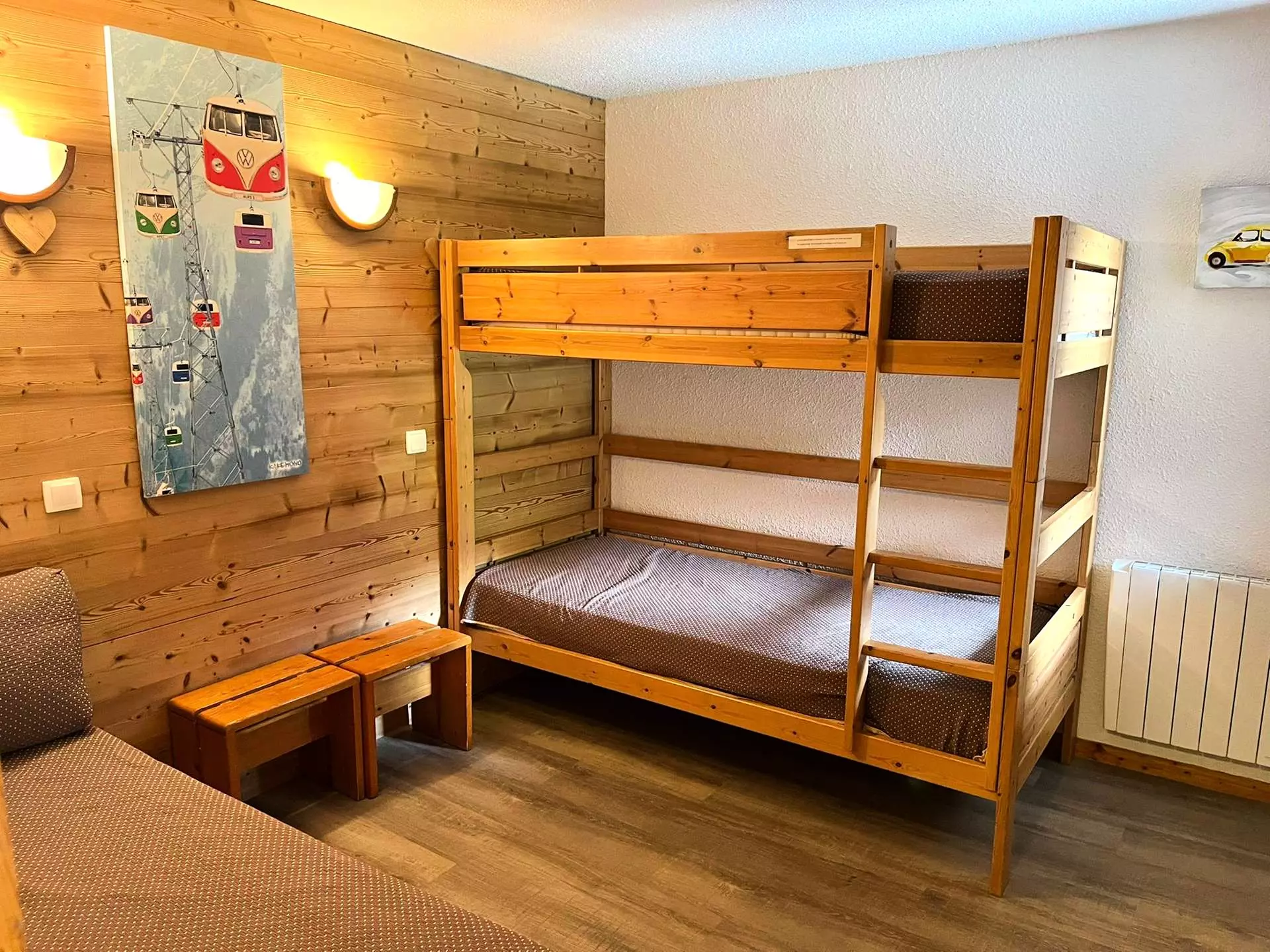 It has a large bedroom with bunk beds (90 cm) and a bench and a trundle bed.