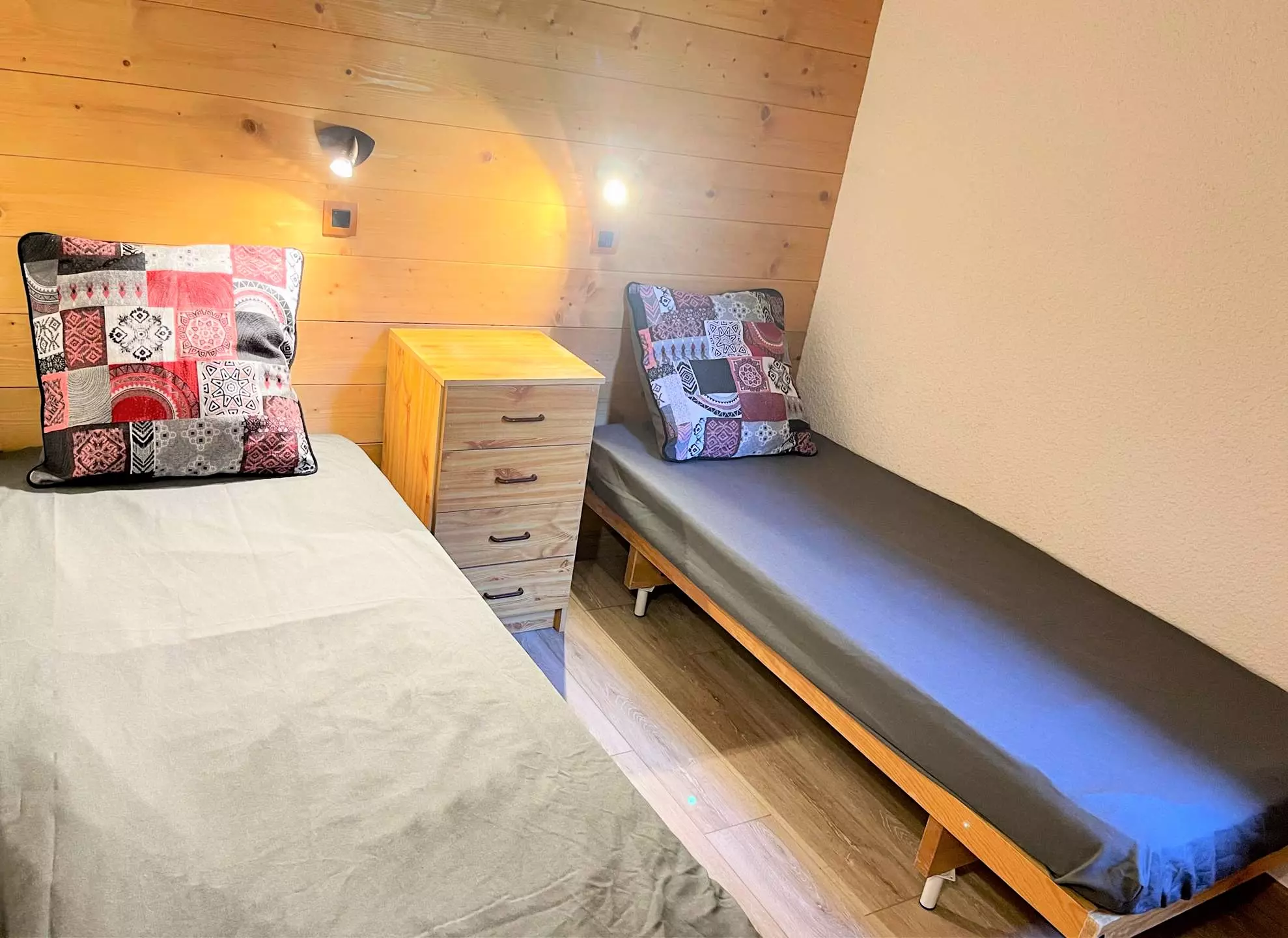 The living room is equipped with 3 single beds (90 cm). The bedroom has 2 single beds (90 cm). All beds are equipped with duvets.