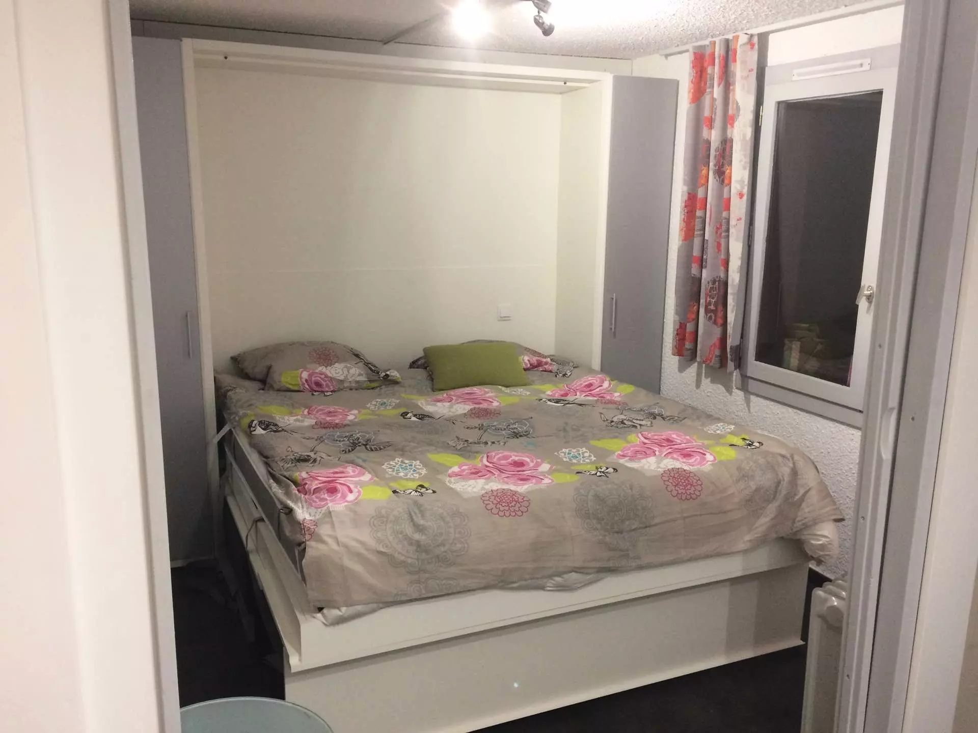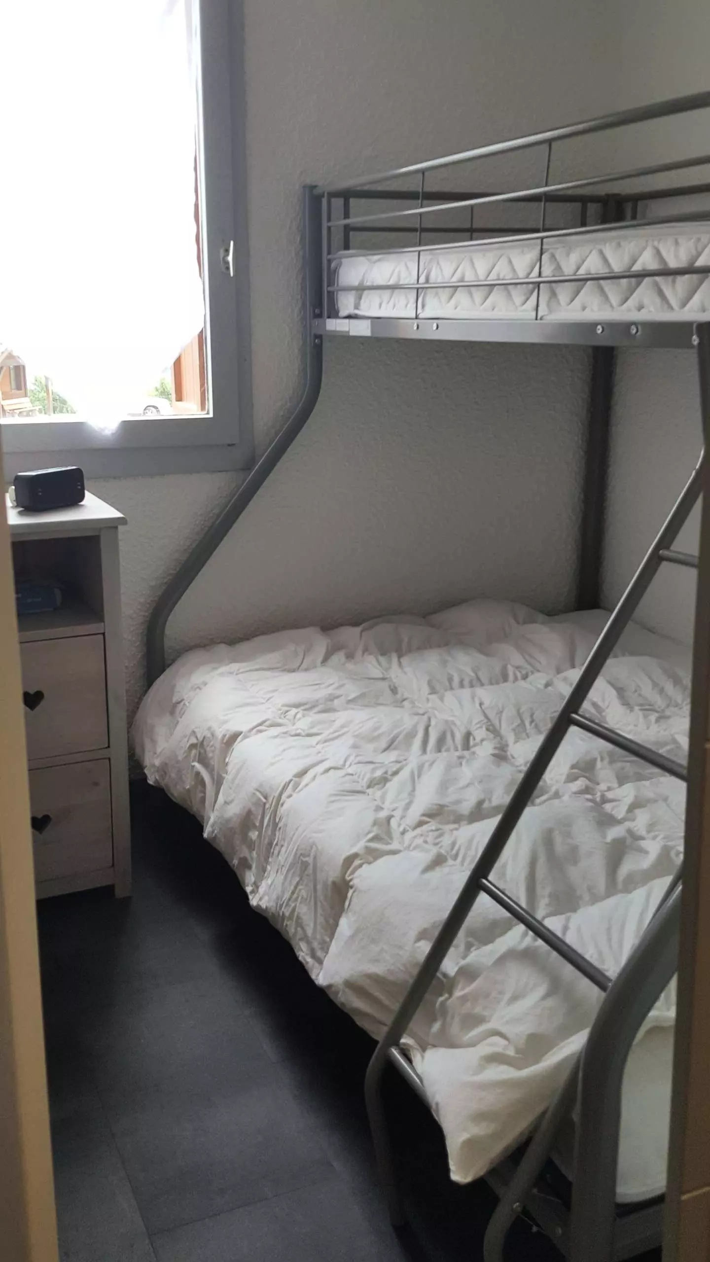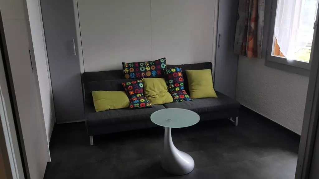 The living room is furnished with a movable partition and a double bed. The bedroom has a set of bunk beds (single bed on top and double bed on the bottom). Duvets are provided with all beds.