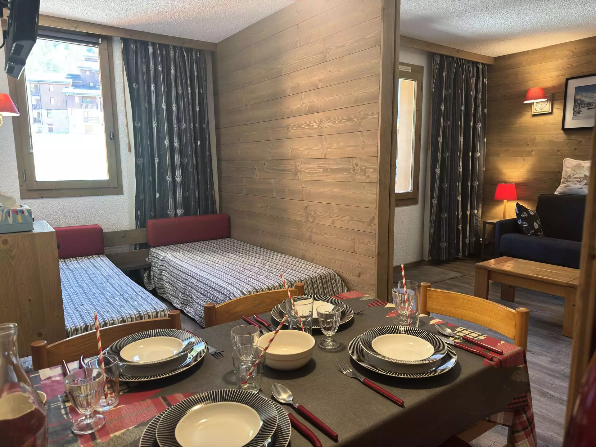 The living room is furnished with two single beds and a sofa that converts into a double bed.