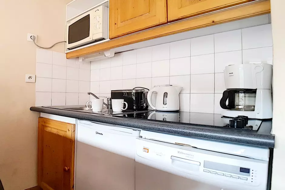 Kitchen equipped with 4 ceramic hobs, oven, microwave, refrigerator, dishwasher, kettle, coffee maker and toaster.