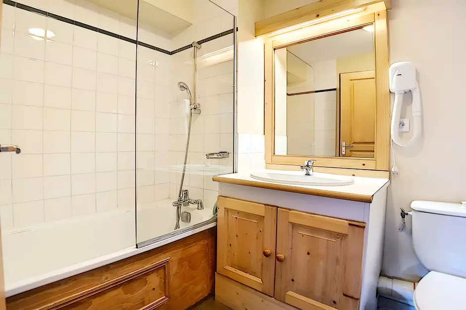 Bathroom with bathtub, wall-mounted hairdryer and WC.
