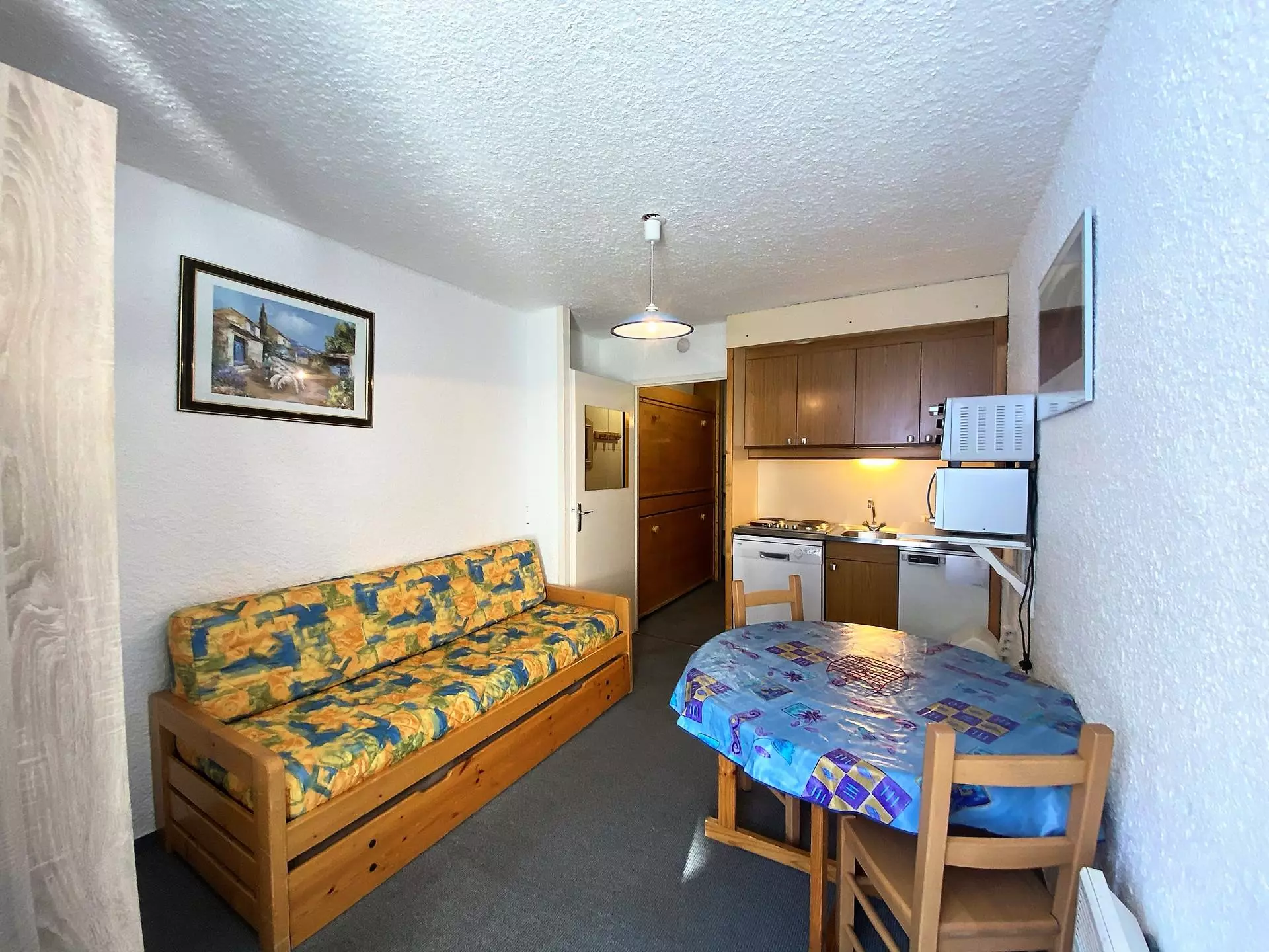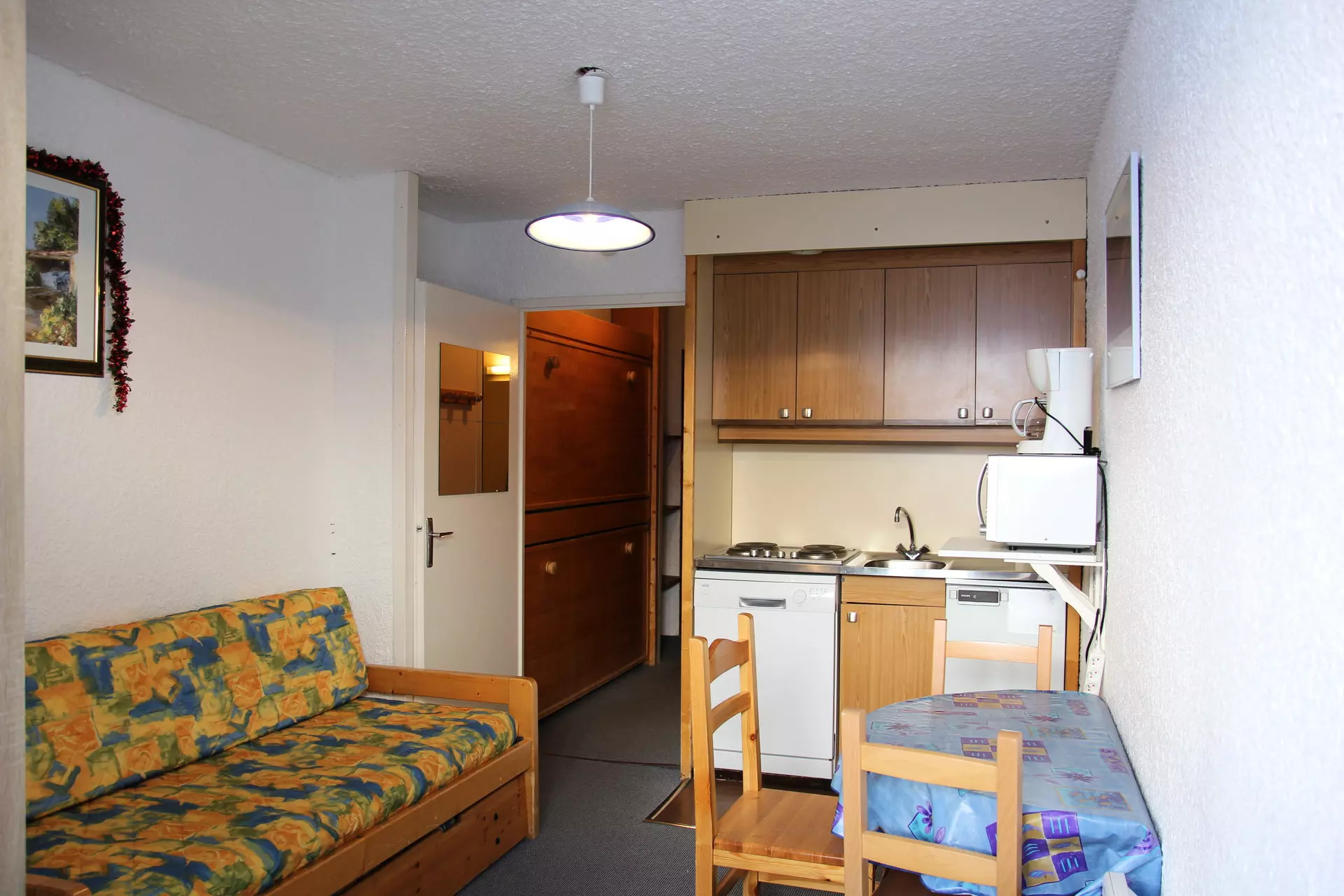 The kitchen, open to the main room, is equipped with an oven, refrigerator, dishwasher, hotplates and a dining area.