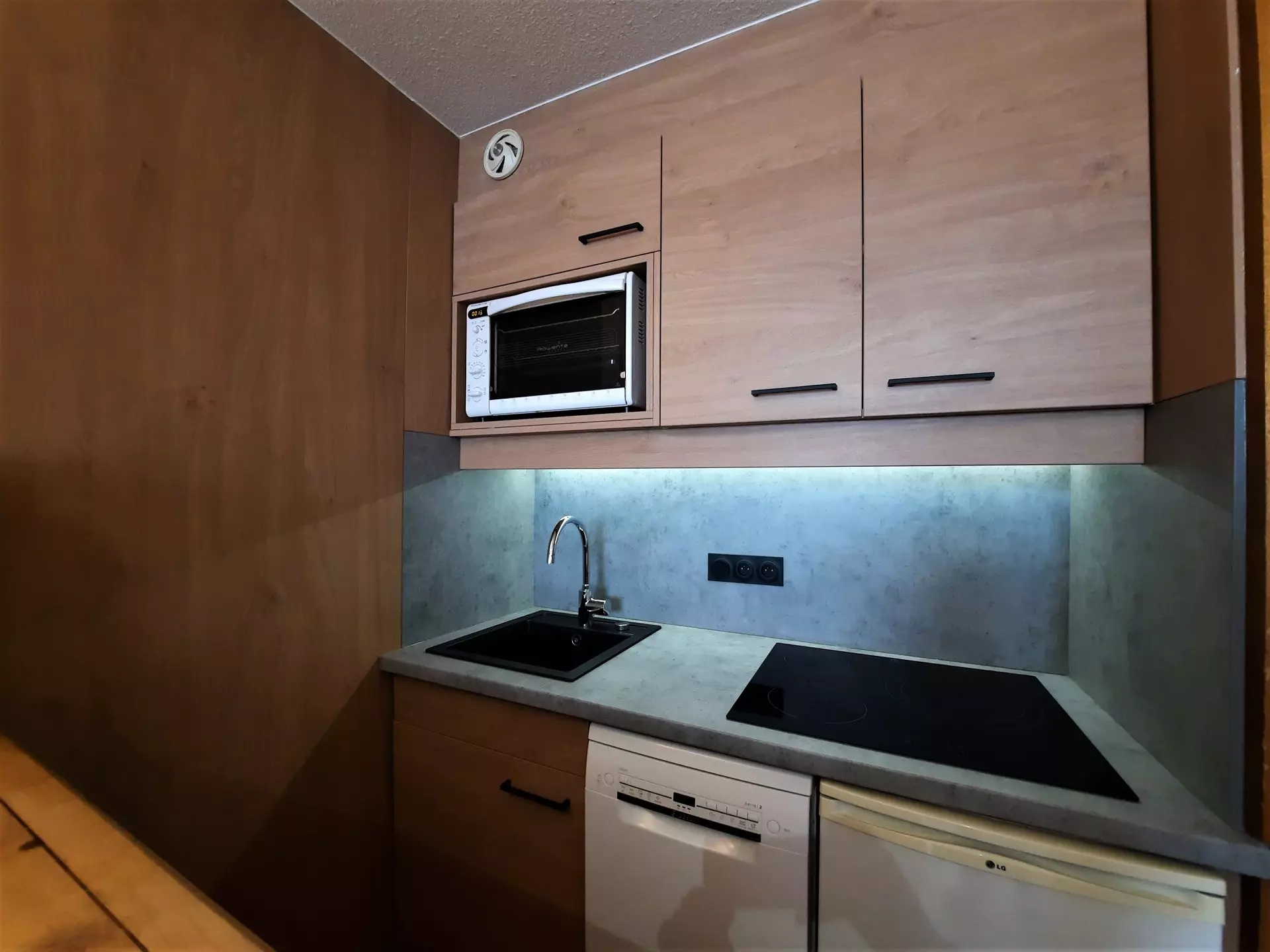 ceramic hob (x4), mini-oven, microwave, refrigerator (5L ice cube tray), dishwasher, coffee maker, kettle, toaster, raclette machine