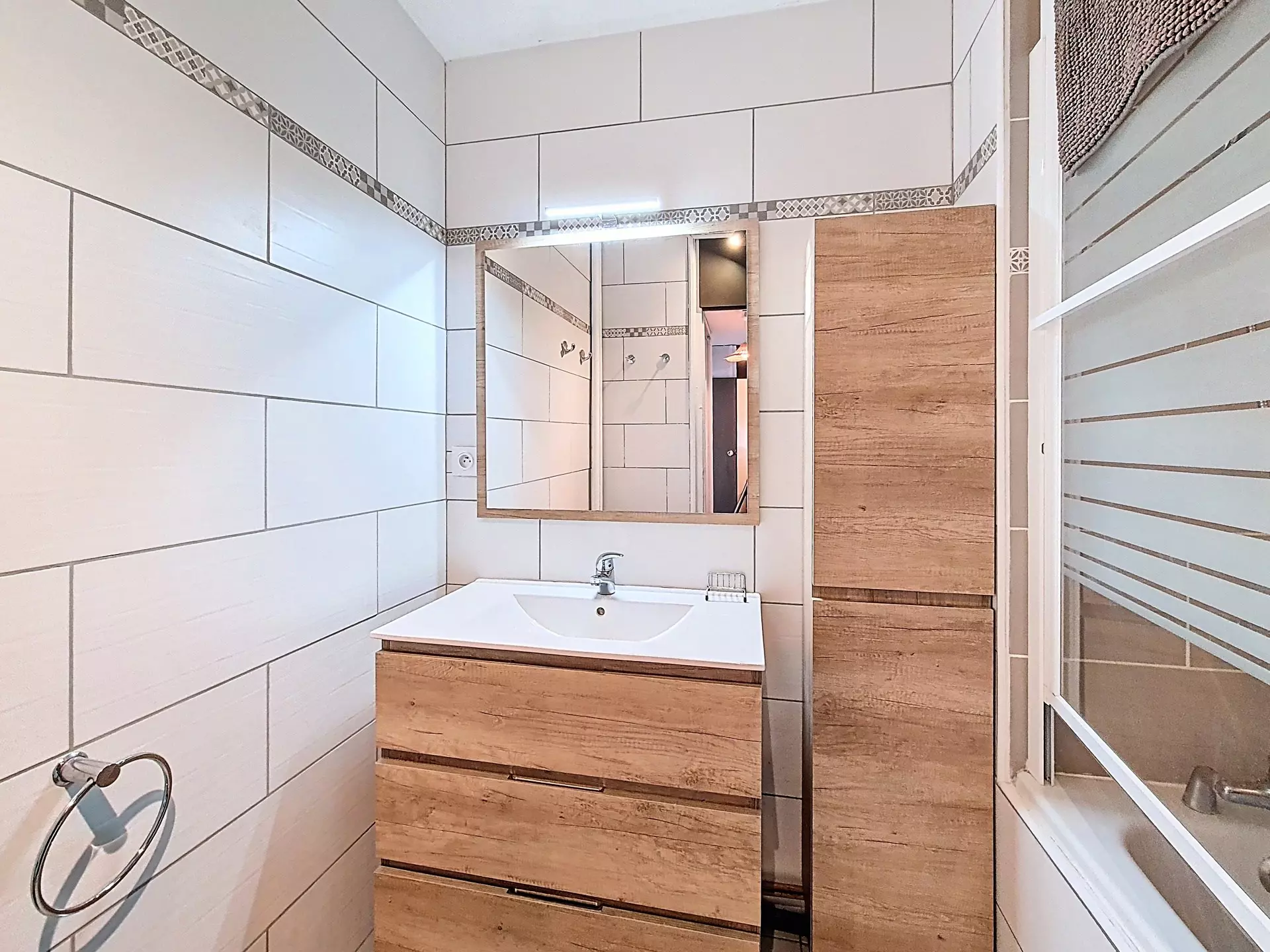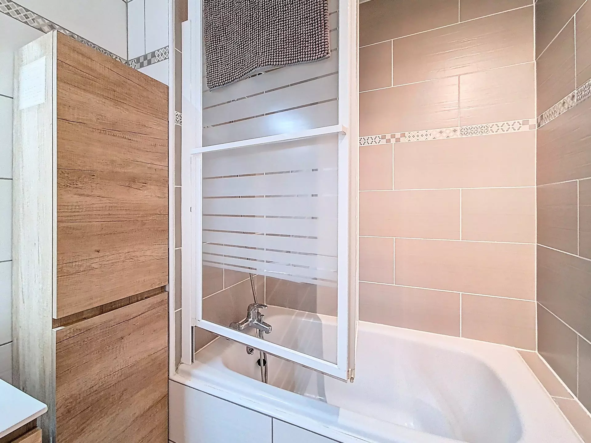 Renovated bathroom with bathtub.