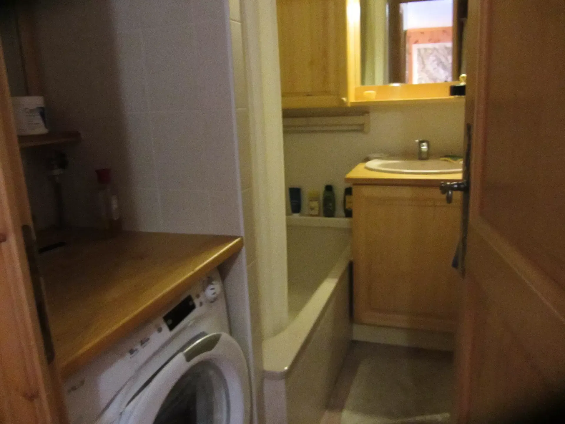 A bathroom with a bathtub, vanity unit and washing machine.