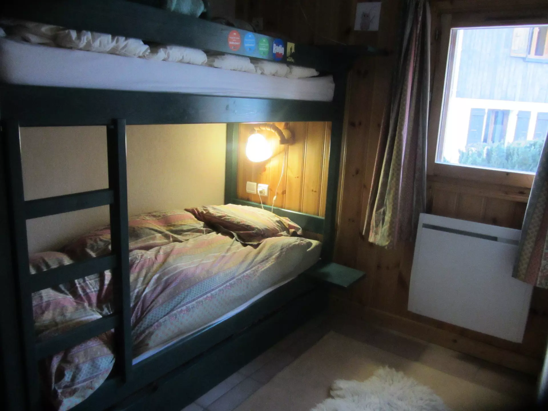 A room with bunk beds and a pull-out bed.