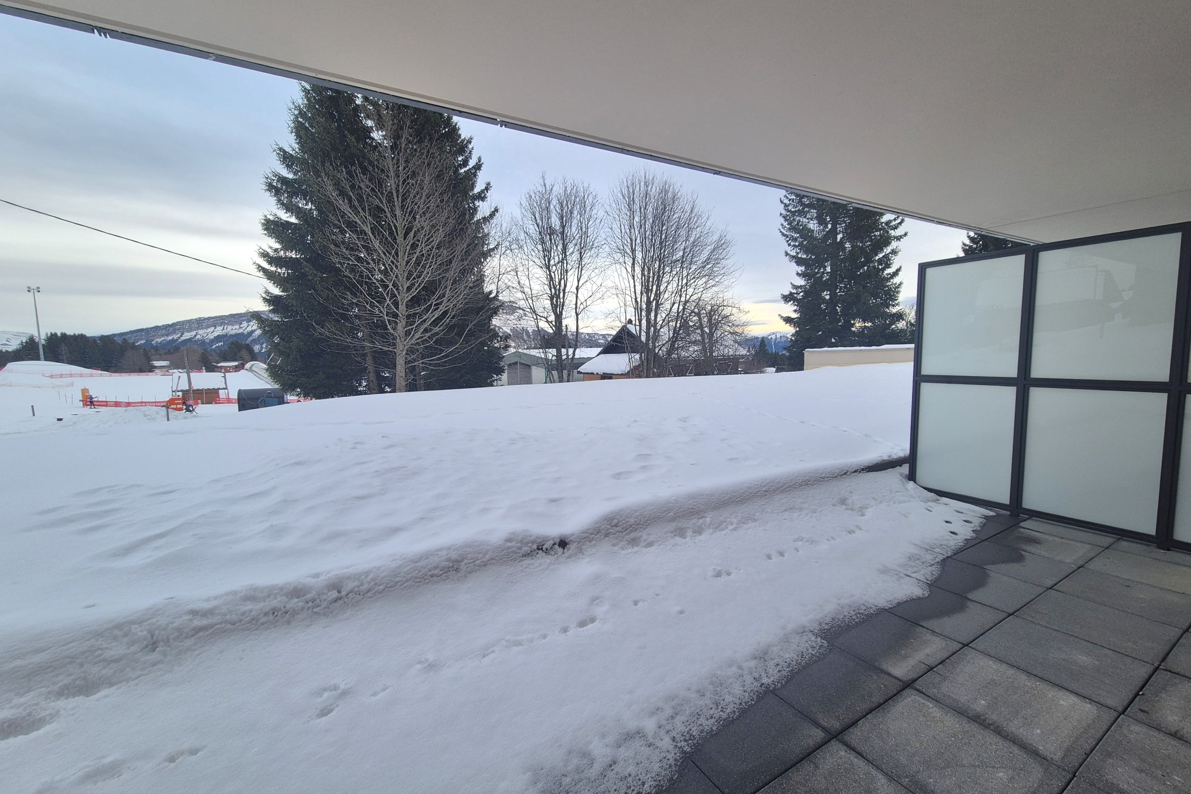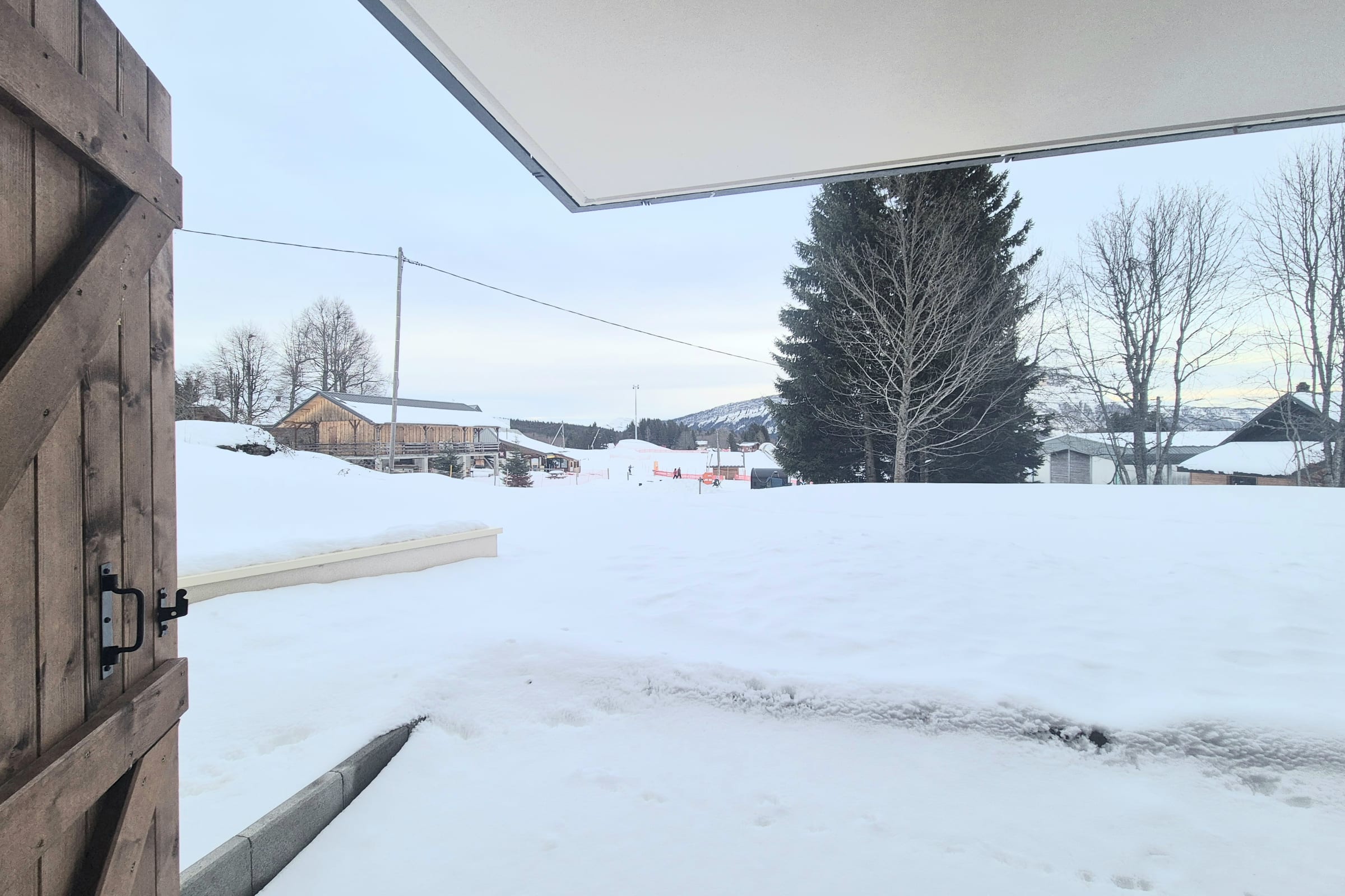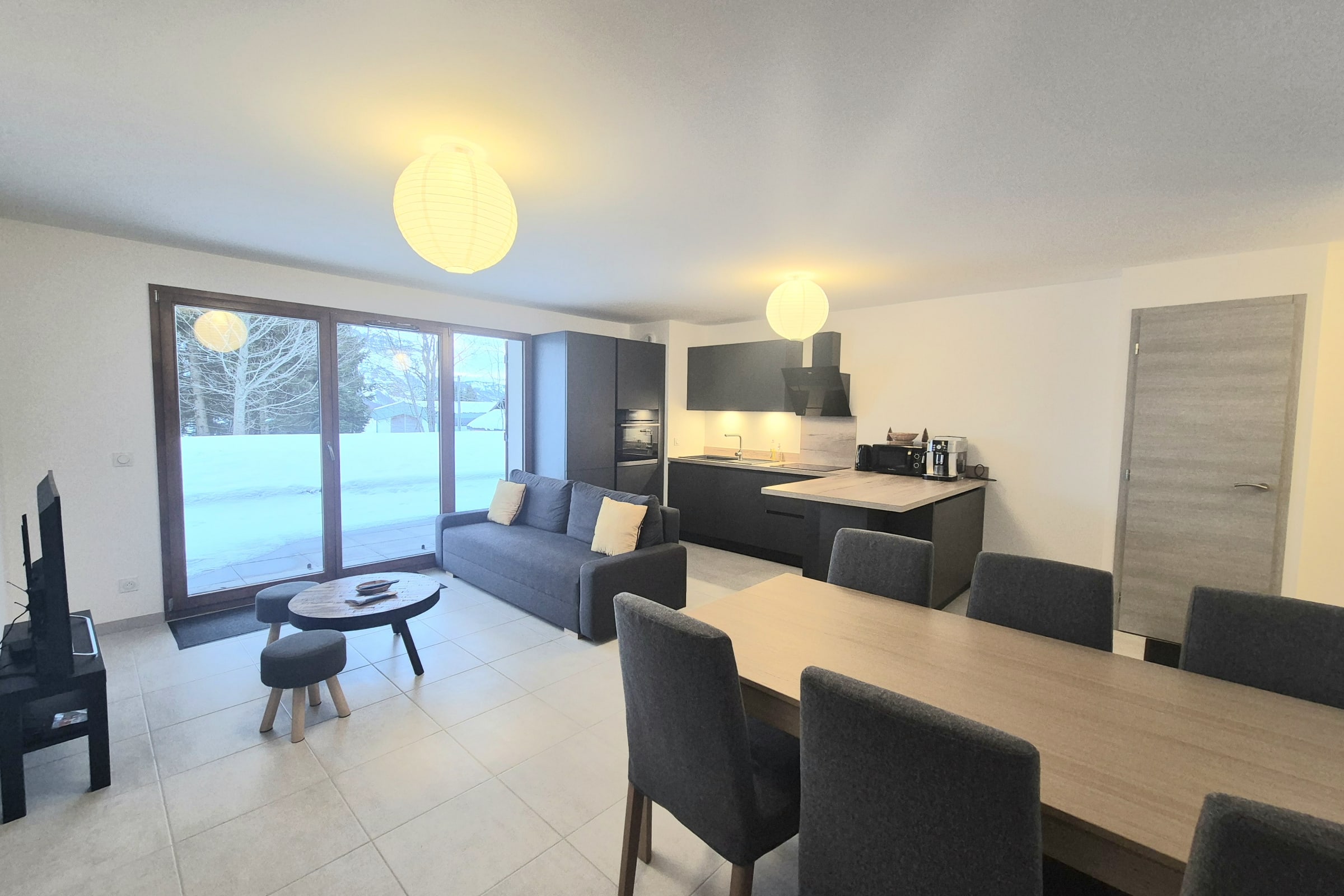 Salon lumineux : espace convivial avec TV et grande baie vitrée donnant accès à une terrasse exposée Est, offrant une belle luminosité naturelle et une vue dégagée sur le jardin d’enfants et les pistes.