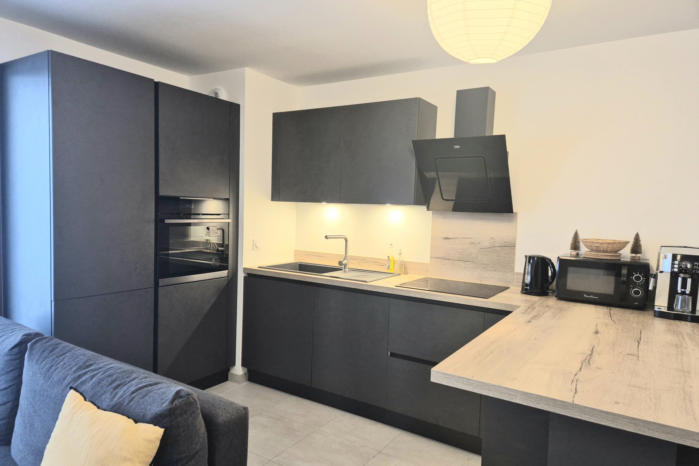 Cuisine ouverte : moderne et fonctionnelle, entièrement équipée avec lave-vaisselle, plaque de cuisson, four, grand réfrigérateur avec congélateur, machine à café et grille-pain.