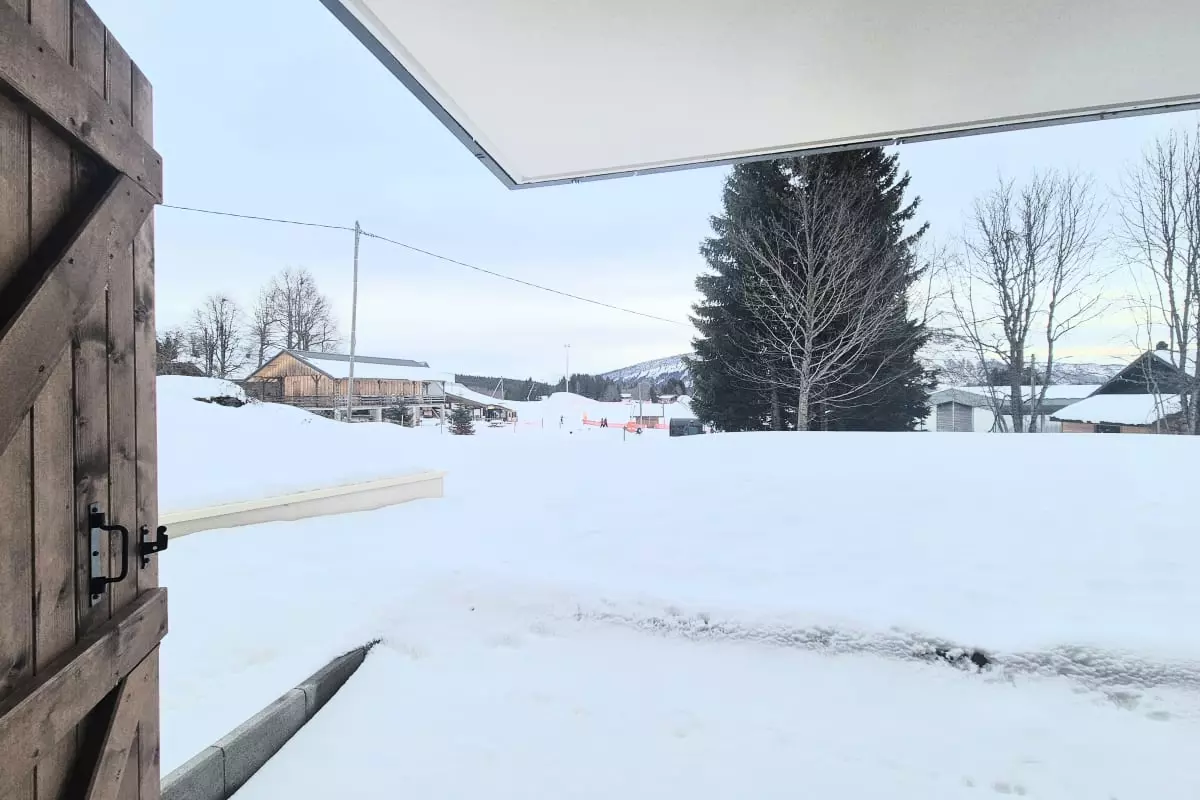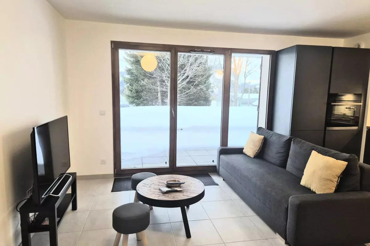 Bright living room: a convivial space with a TV and a large bay window giving access to an east-facing terrace, offering beautiful natural light and an unobstructed view of the children's garden and the slopes.