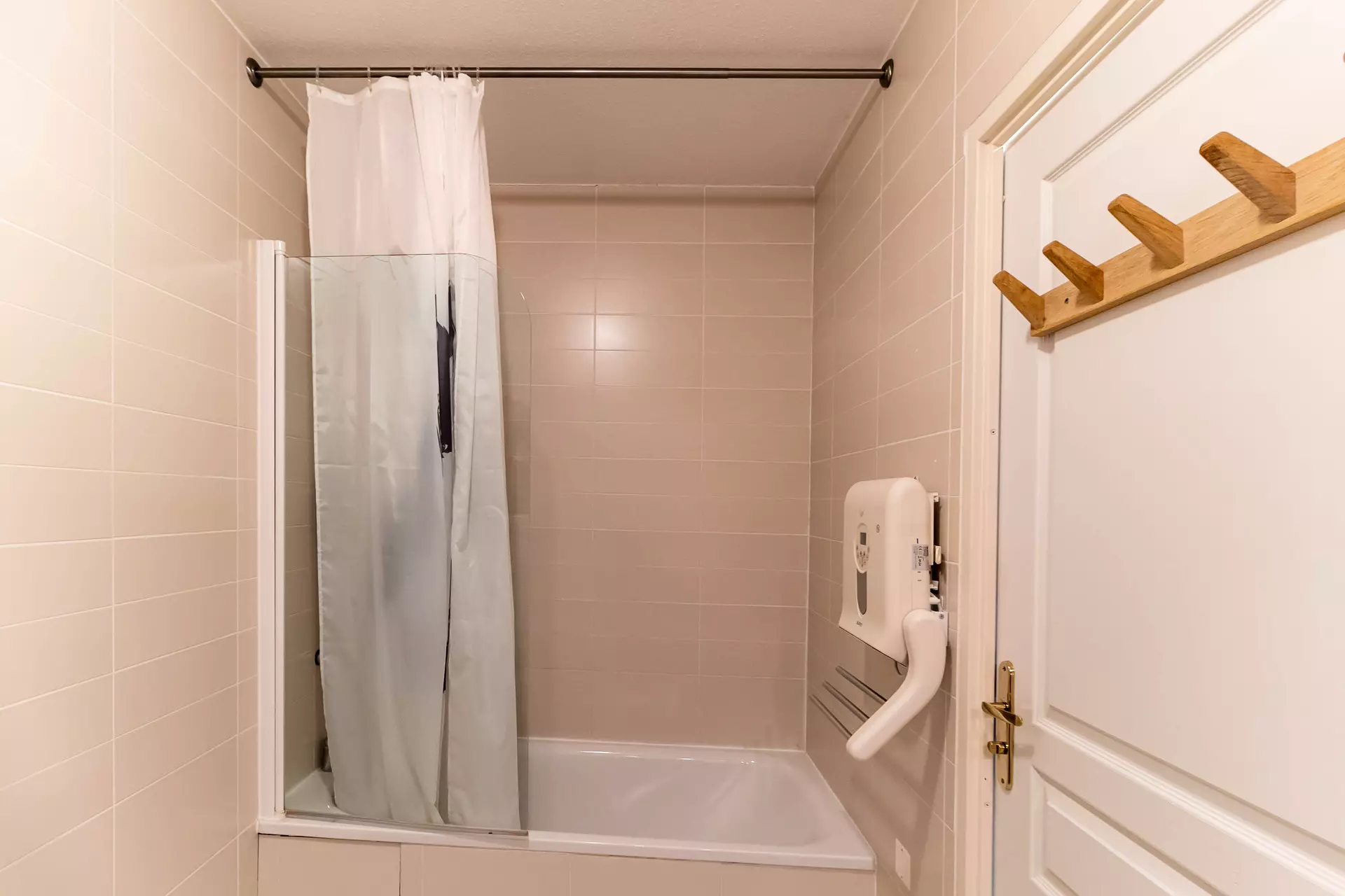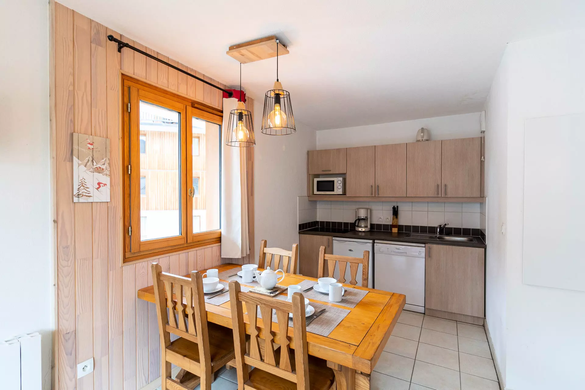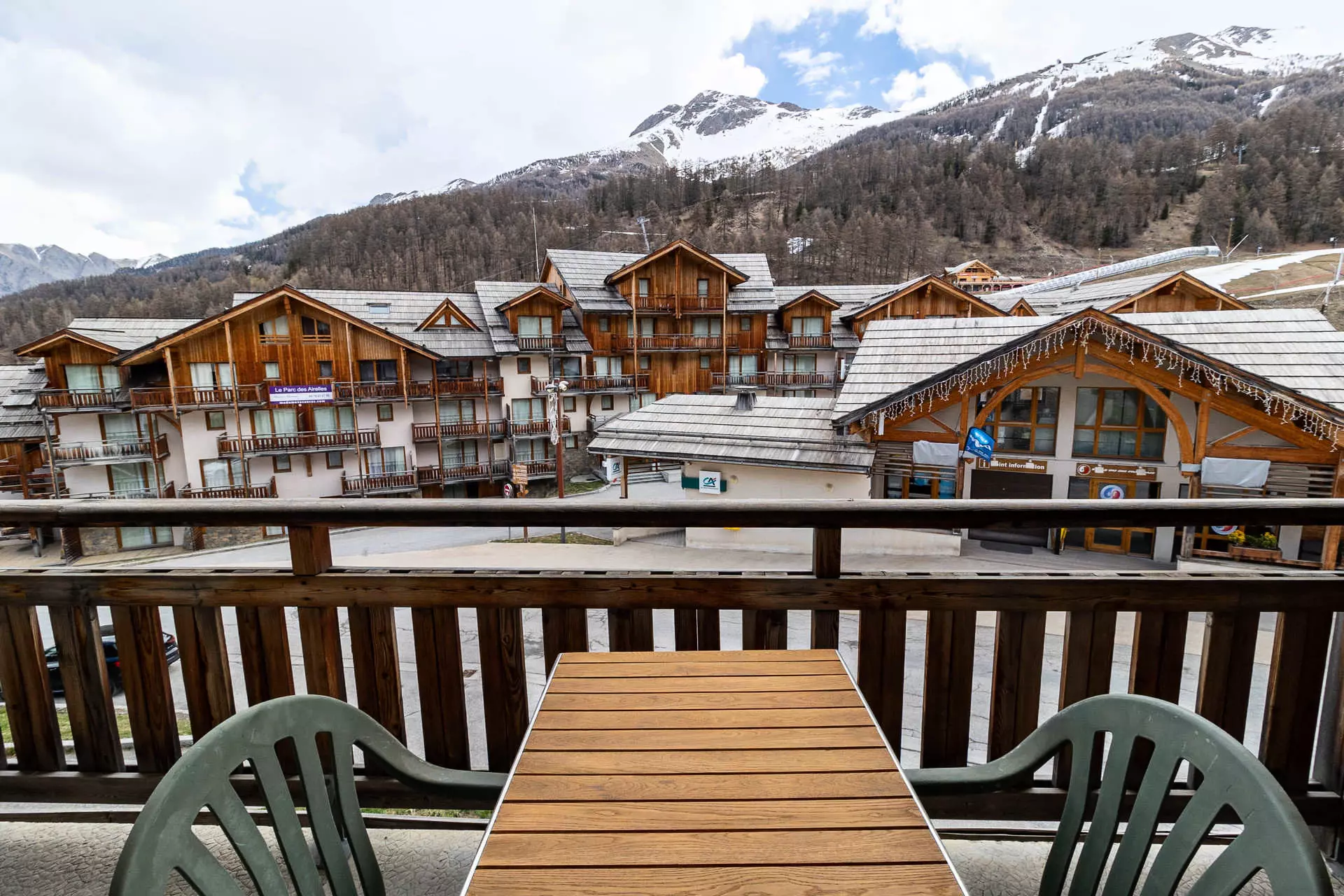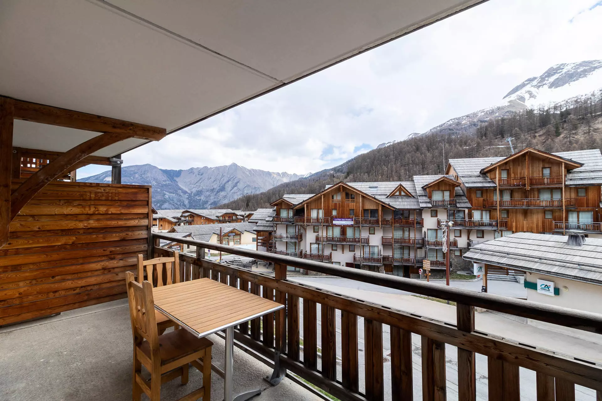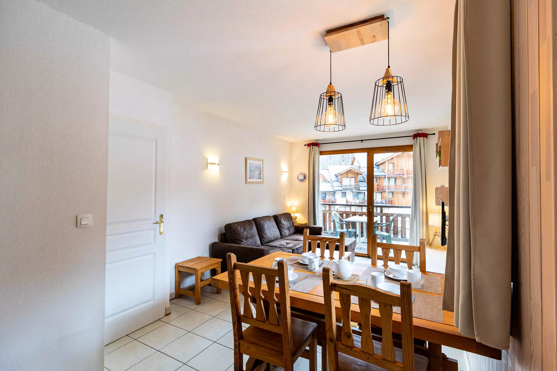 It has an entrance hall with storage, a living room with a sofa bed and television, a dining room - equipped kitchen, a separate bedroom, a bathroom with a bathtub and electric towel dryer as well as a north-east facing balcony with garden furniture and a view of the resort and its peaks.