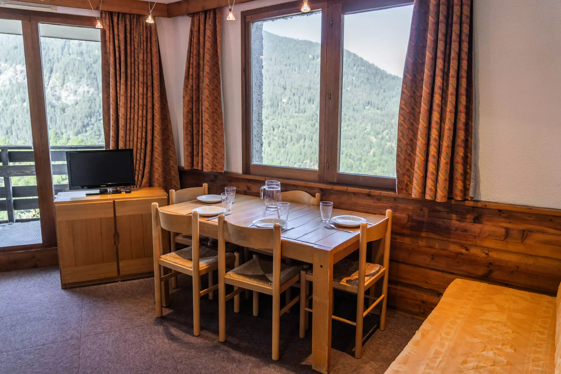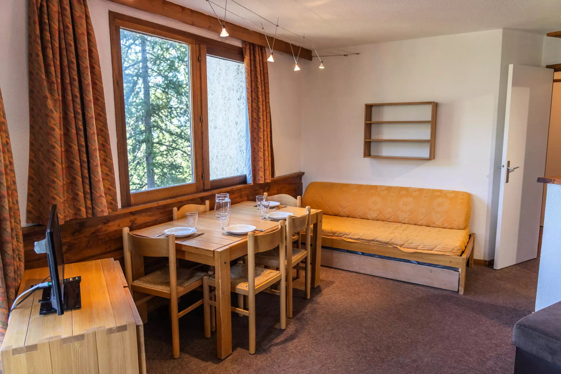 As for sleeping arrangements, you can choose between a bedroom with two twin beds (2x80*190cm) equipped with a TV, or a pull-out sofa bed for two (2x80*190cm) and a single bench seat (80*190cm) in the living room.