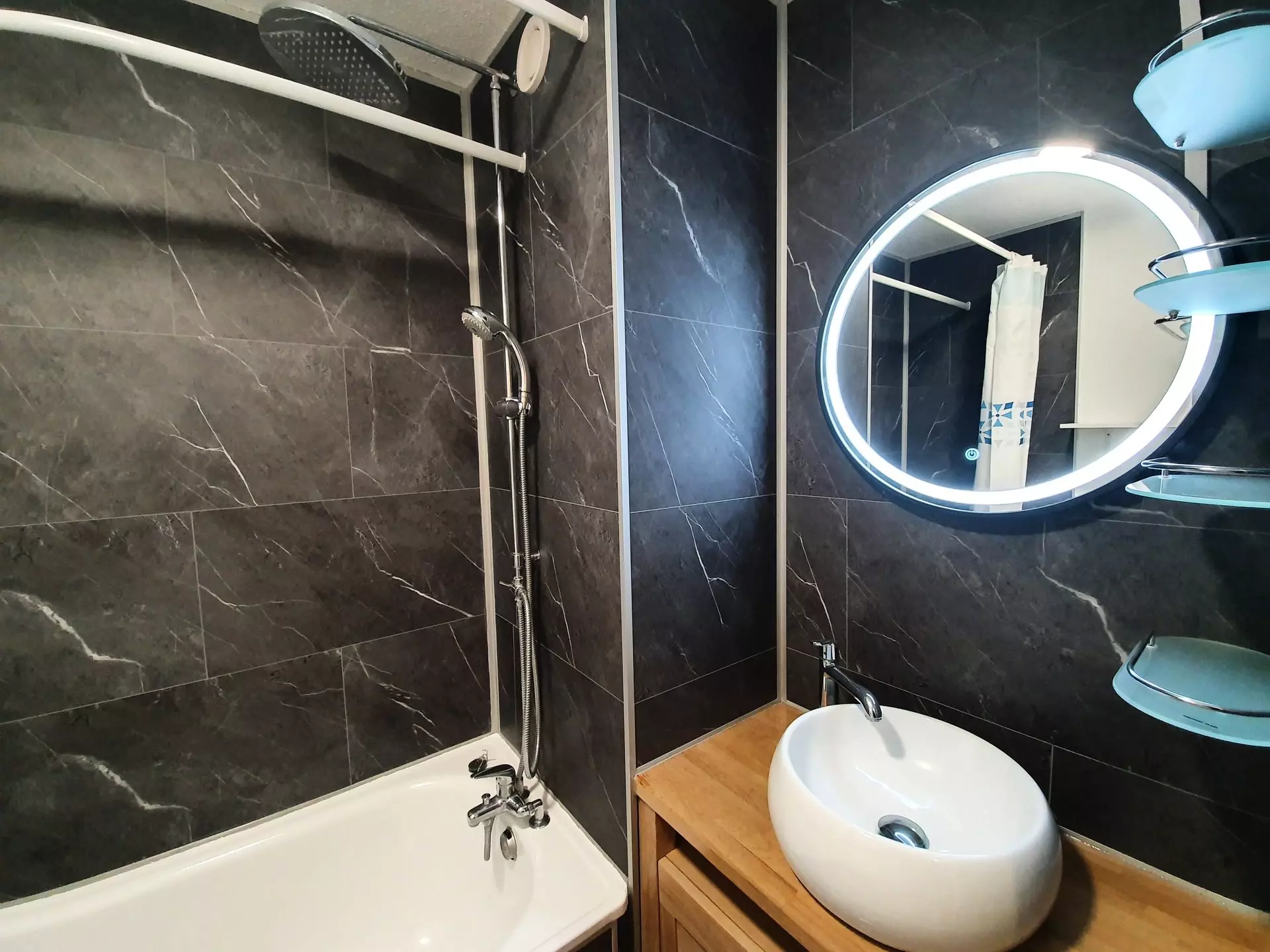 The renovated bathroom also has a bathtub, for a relaxing moment after your favorite activities, but also a washing machine and a hair dryer for added comfort.