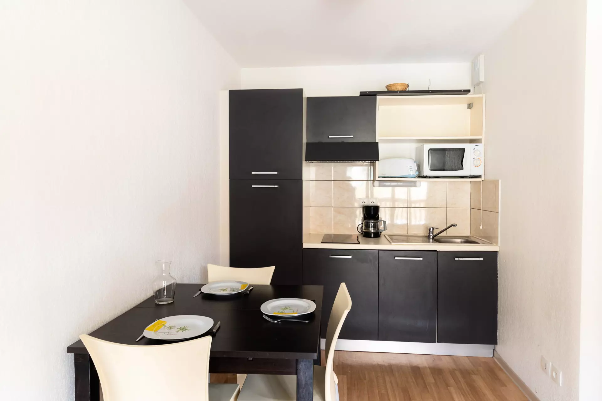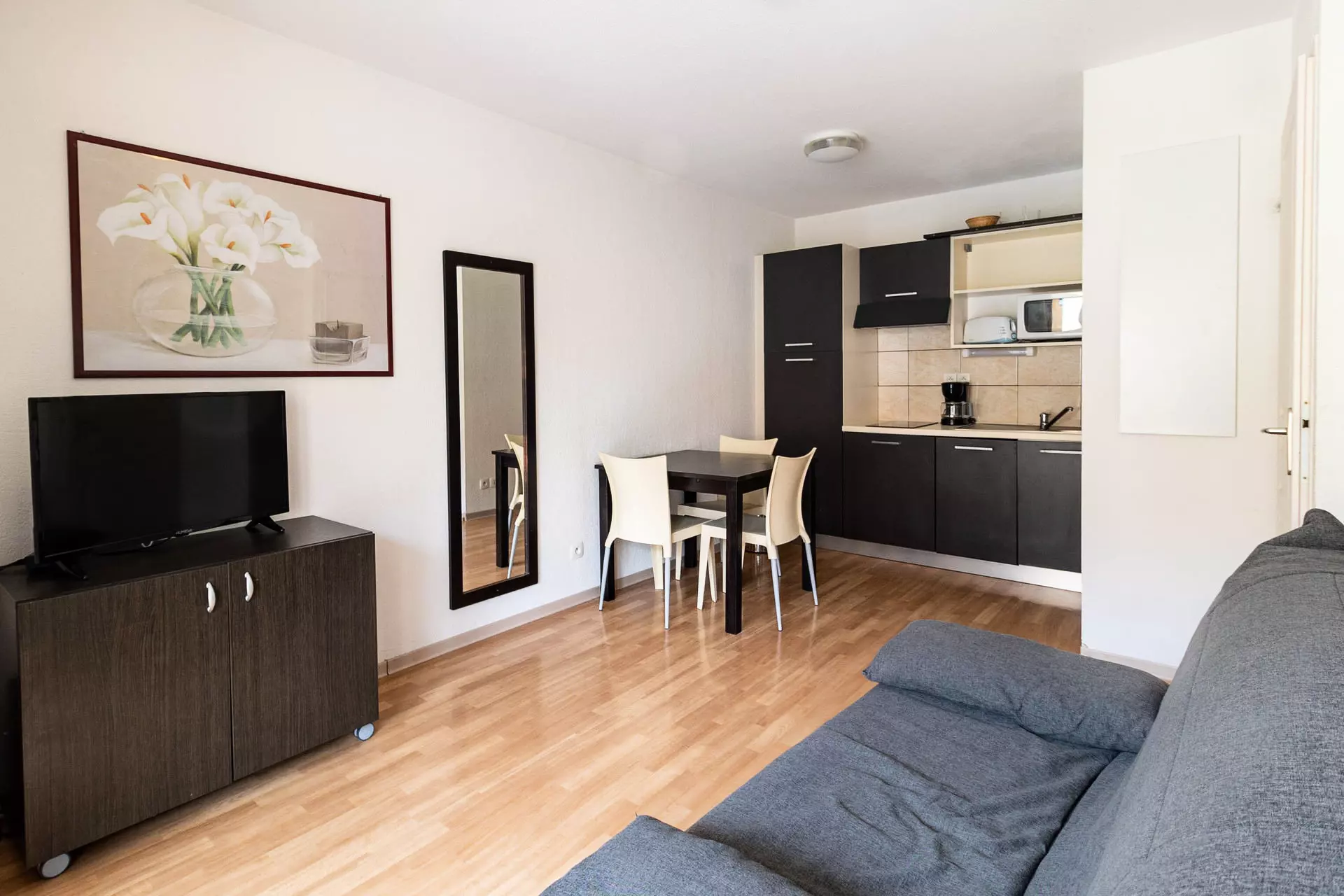 In the living room, you have a lounge area with a comfortable 2-seater convertible sofa bed as well as a kitchen equipped with everything you need to prepare delicious meals just like at home: dishwasher, microwave, Senseo coffee maker, kettle, toaster, etc.