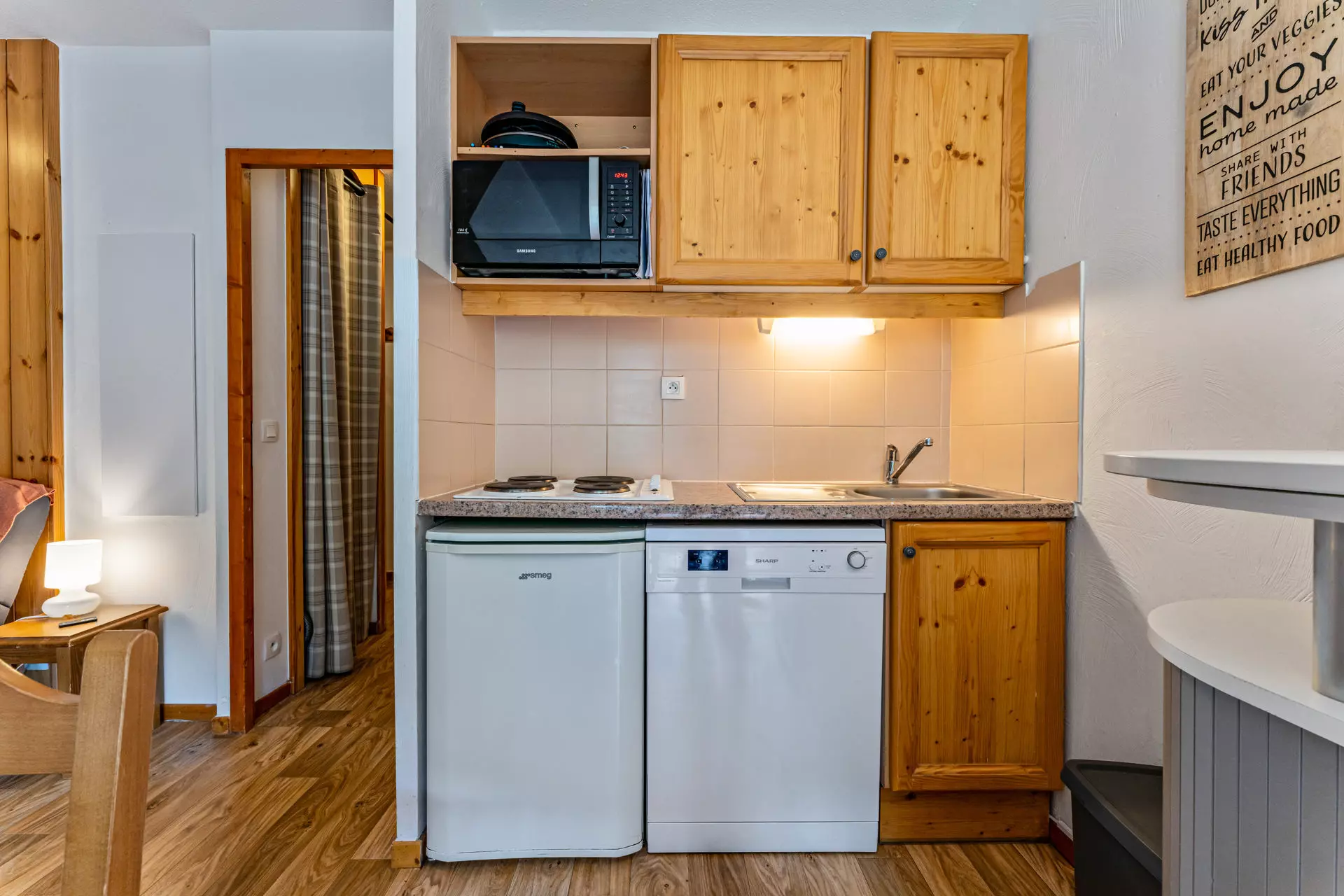 The apartment has an entrance hall with storage space leading to the sleeping area, a bathroom with a bathtub and a separate toilet, a master bedroom, a living room with a sofa and television, and a fully equipped kitchen area: dishwasher, microwave, refrigerator, raclette machine, toaster, kettle, etc.
