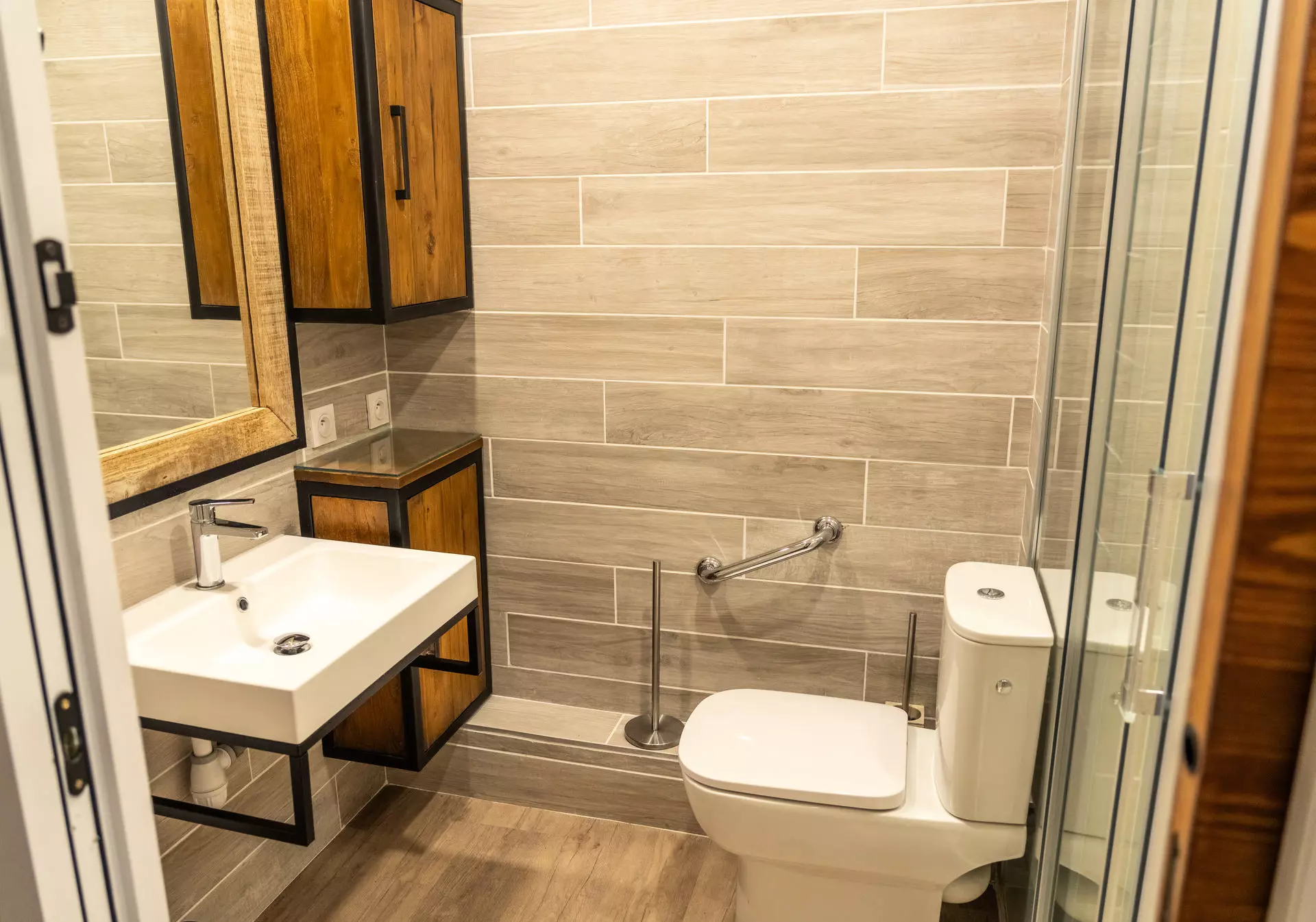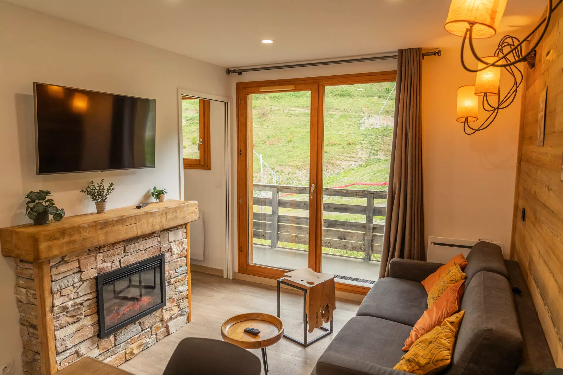 The living area consists of a lounge with a sofa that converts into a double bed, a wall-mounted television, an electric stone and wood fireplace that will create a relaxing atmosphere; and a dining room that can accommodate up to 6 guests for your friendly evenings with family or friends.