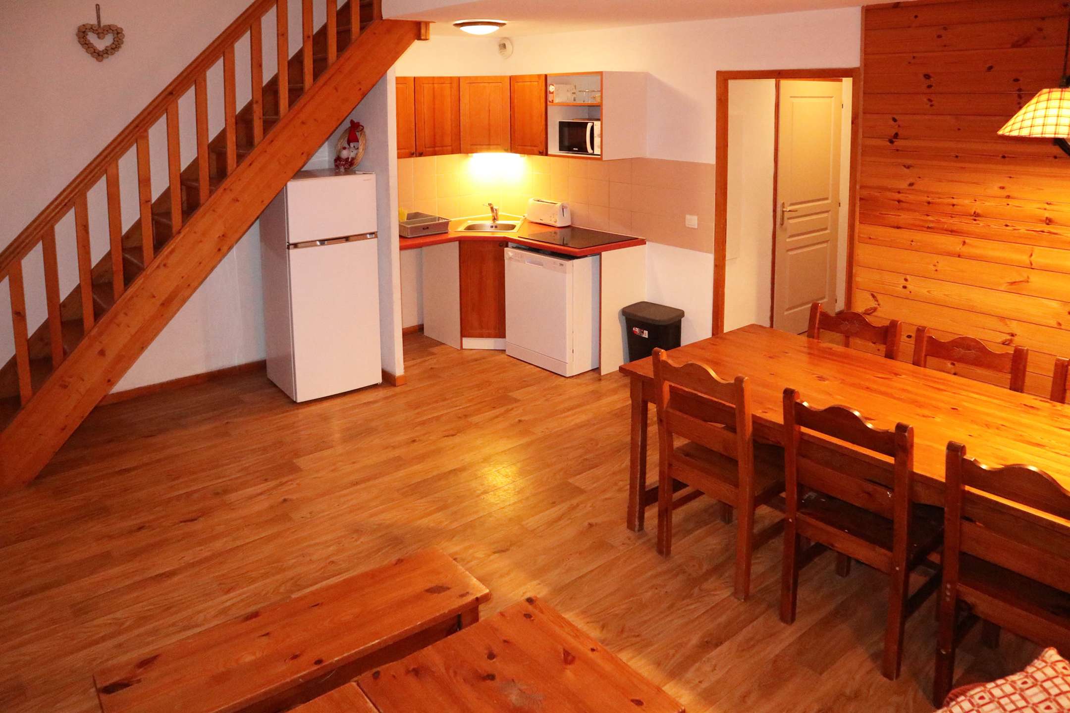 In a recent luxury residence, on the top floor with elevator, very nice duplex apartment with double exposure, very comfortable including: entrance, shower room with WC, bedroom 1 double bed, large living room with 2 single pull-out beds, open kitchen, balcony, wooden stairs leading to the upper floor, mountain corner 2 single bunk beds with window, one bedroom 1 double bed and 1 single bed with balcony, bathroom, WC. Ski box.