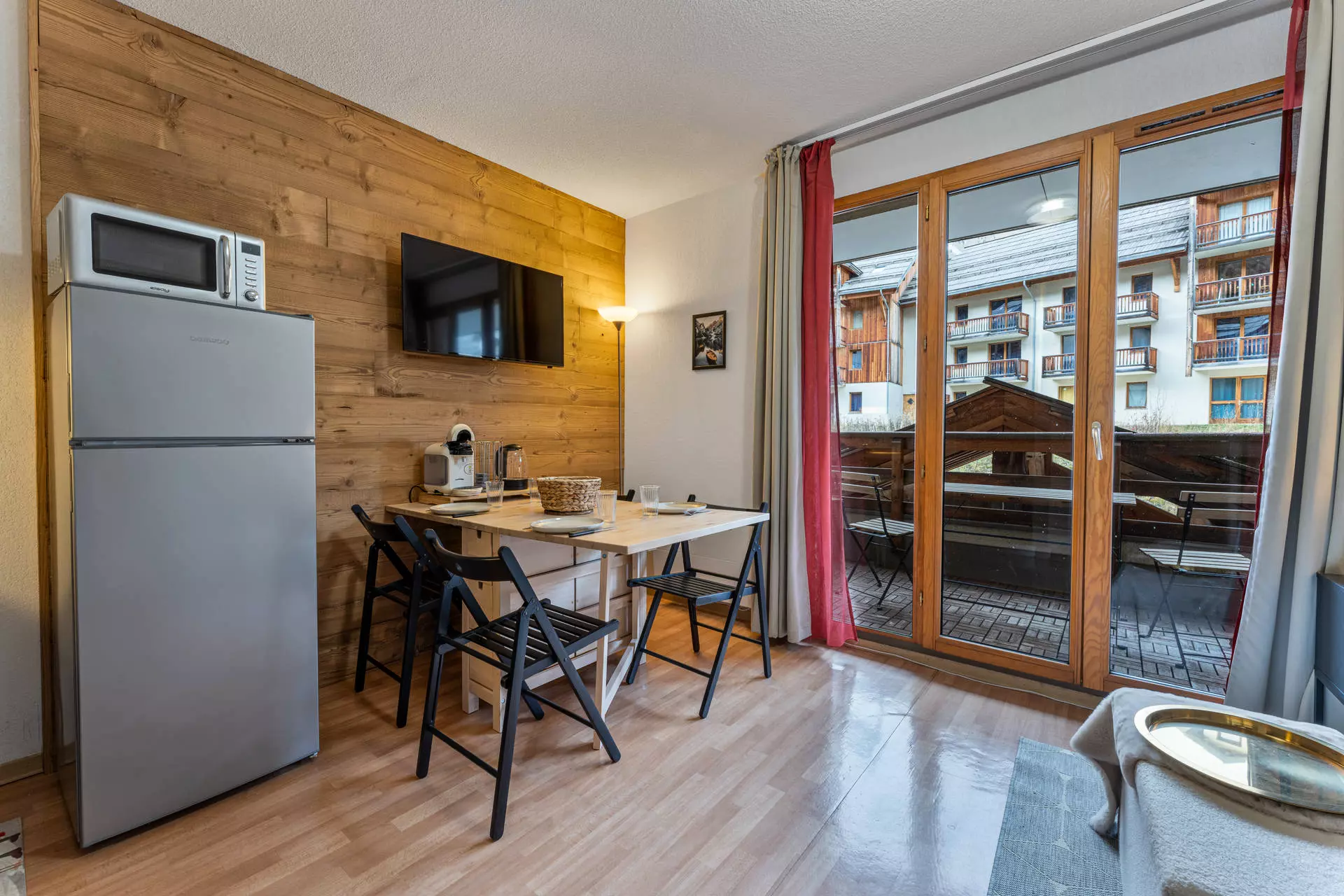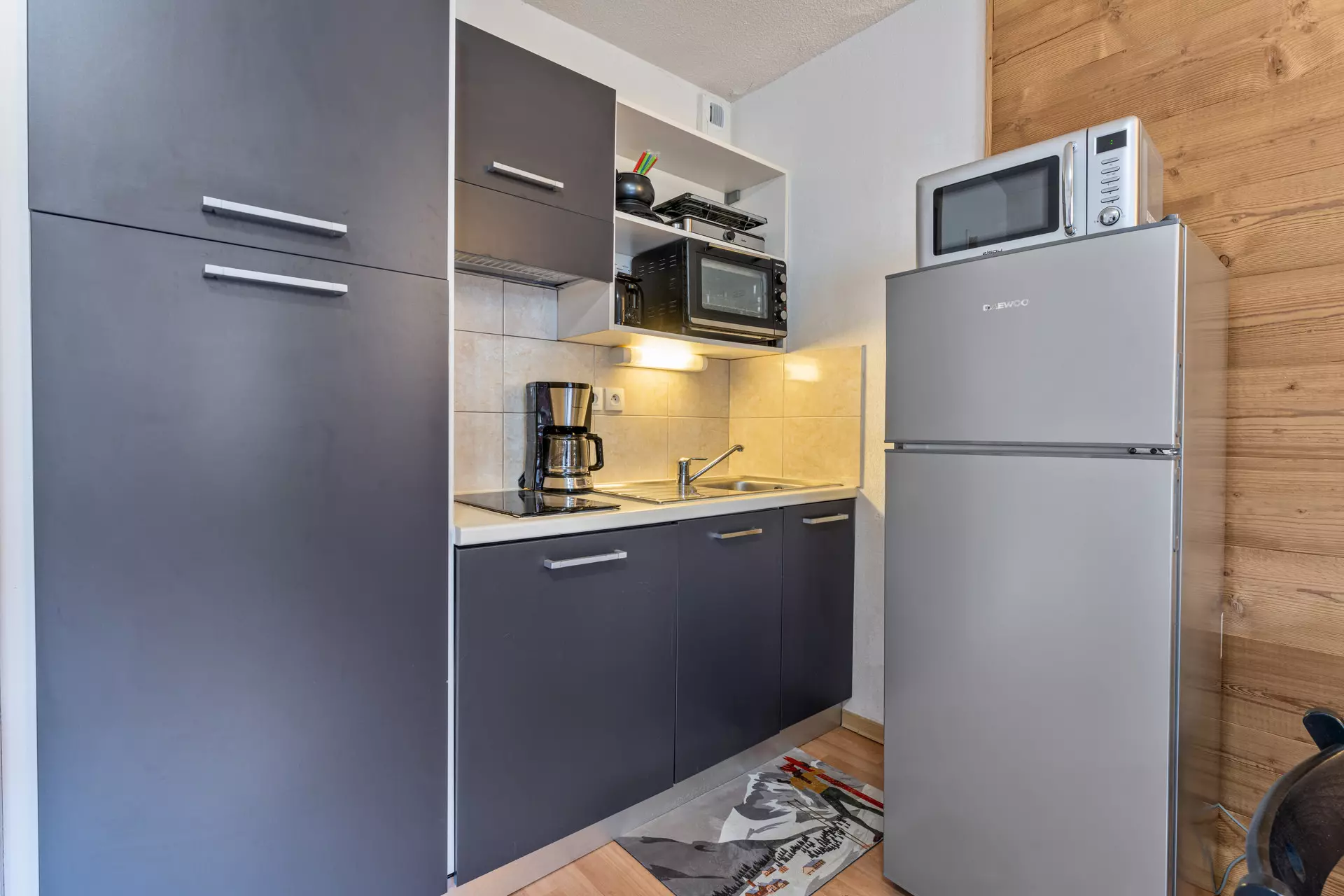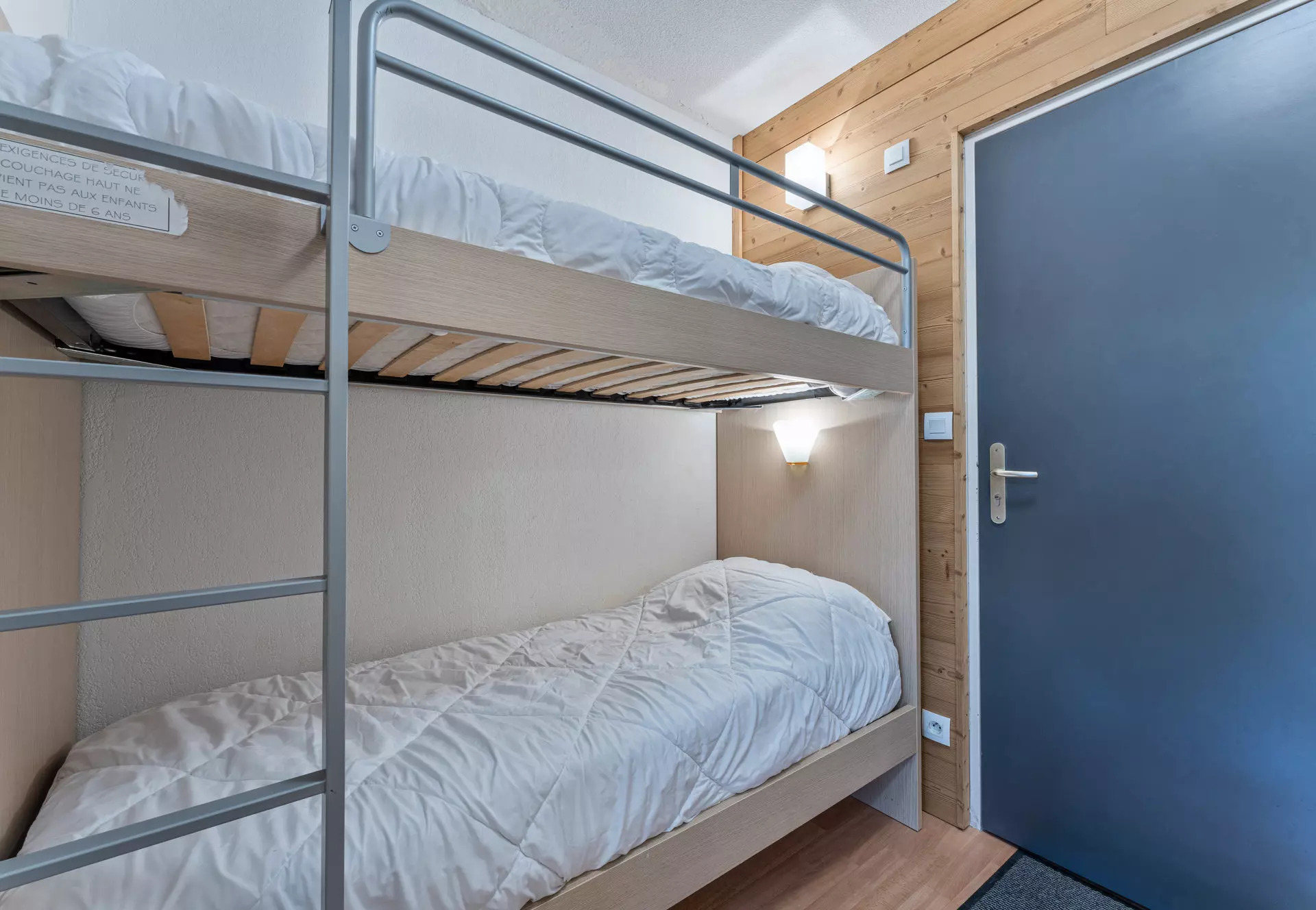 From the floor, this studio consists of an entrance with two single bunk beds (90 x 190 cm), a bathroom with bathtub and WC, and a living room with a sofa bed convertible into 140 x 190 cm, a television and a fully equipped kitchen: dishwasher, ceramic hob, mini-oven, microwave, refrigerator, Tassimo filter and pod coffee machine, a raclette and fondue set... You will appreciate the west-facing balcony offering a view of the resort.