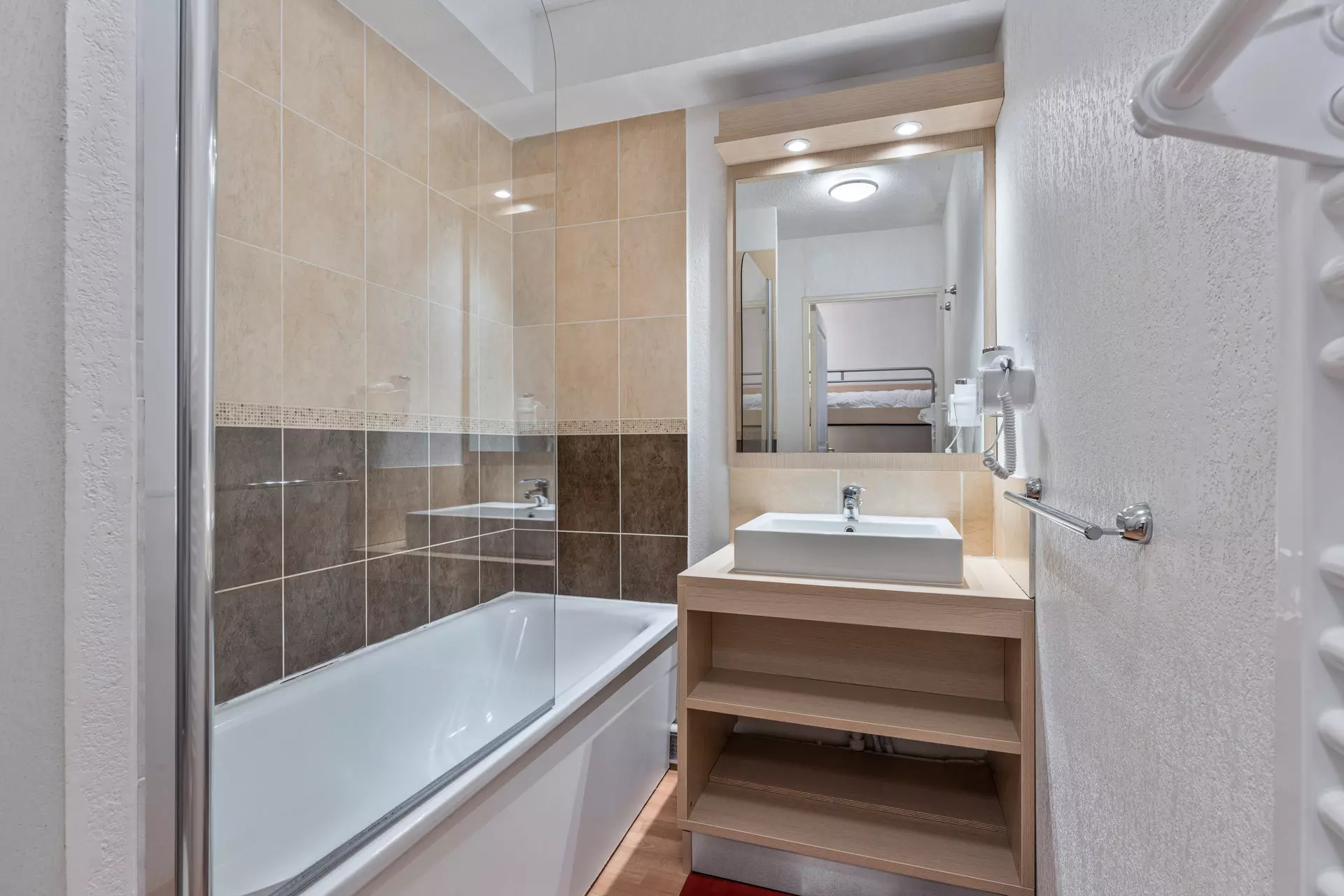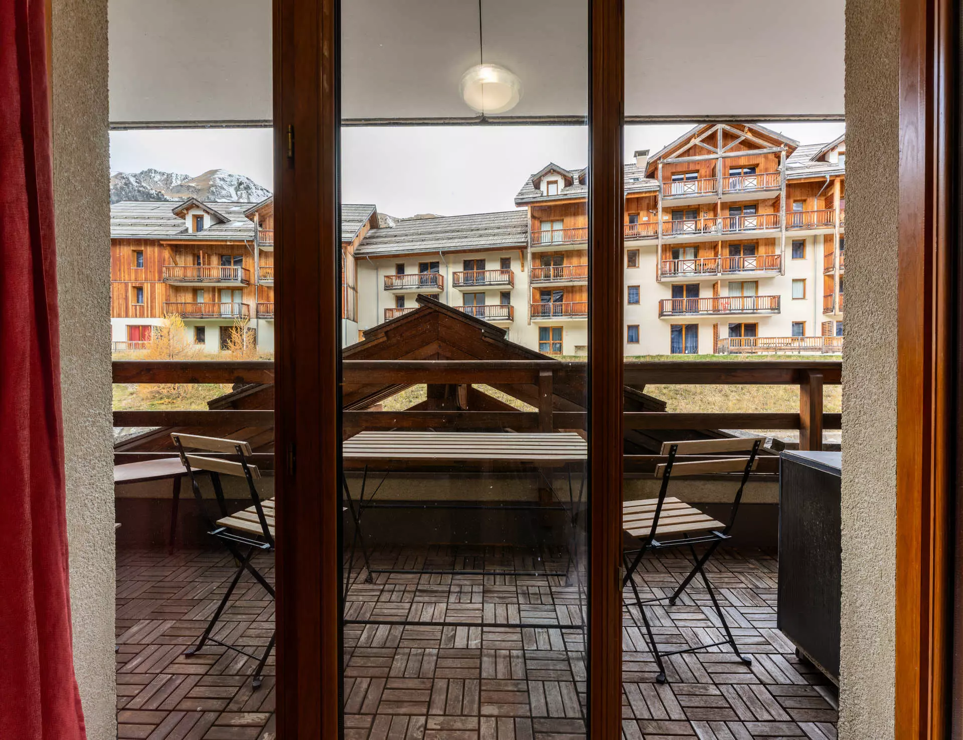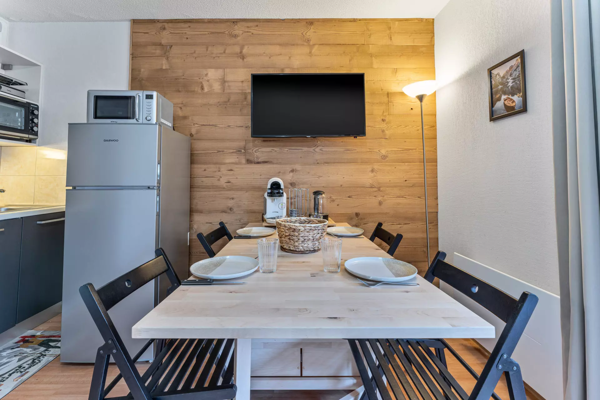 From the floor, this studio consists of an entrance with two single bunk beds (90 x 190 cm), a bathroom with bathtub and WC, and a living room with a sofa bed convertible into 140 x 190 cm, a television and a fully equipped kitchen: dishwasher, ceramic hob, mini-oven, microwave, refrigerator, Tassimo filter and pod coffee machine, a raclette and fondue set... You will appreciate the west-facing balcony offering a view of the resort.