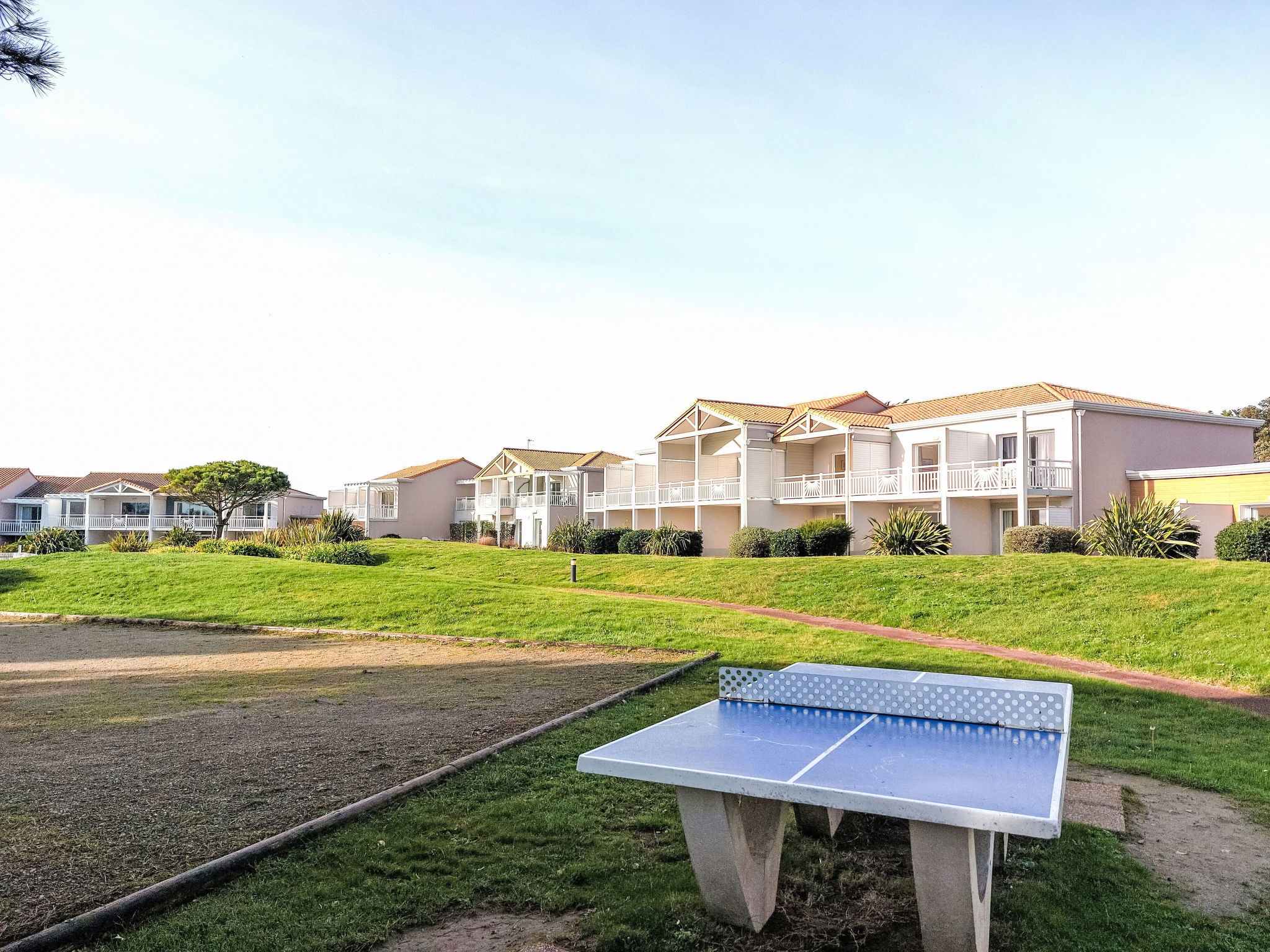 Beautiful residence. 4 km from the centre of Sables d'Olonne, 150 m from the sea, in the countryside. For shared use: property with lawn and plants, beautiful garden to relax, 2 swimming pools heated (12 x 5 m, depth 150 cm, seasonal availability: 01.May. - 30.Sep.). Table tennis, boccia, children's playground. In the complex: reception, washing machine (for shared use, extra). Parking. Grocery 300 m, shopping centre 2 km, bicycle rental, bus stop 300 m, railway station "Les Sables Olonne" 4.5 km, sandy beach "Plage du Tanchet" 1.4 km, thermal baths "Thalassothérapie" 2 km. Sports harbour 5 km, surf school 1.4 km, cycle lane 10 m. Nearby attractions: St Gilles Croix de Vie 30 km, Noirmoutier 65 km, Le Puy du Fou 80 km, Nantes 95 km, La Rochelle 100 km. Hiking paths: GR8 200 m. Residence with electric gates.