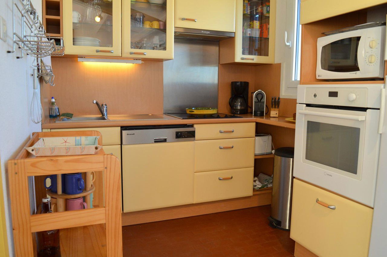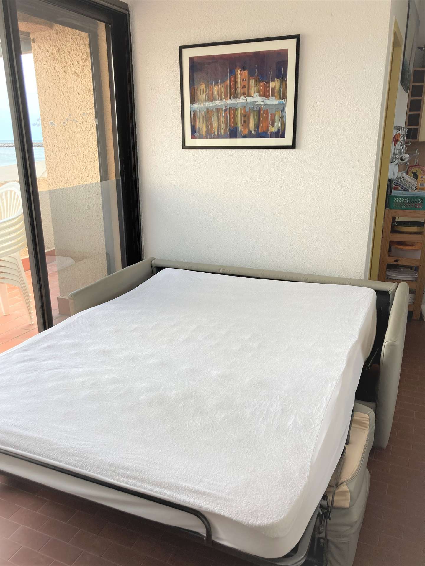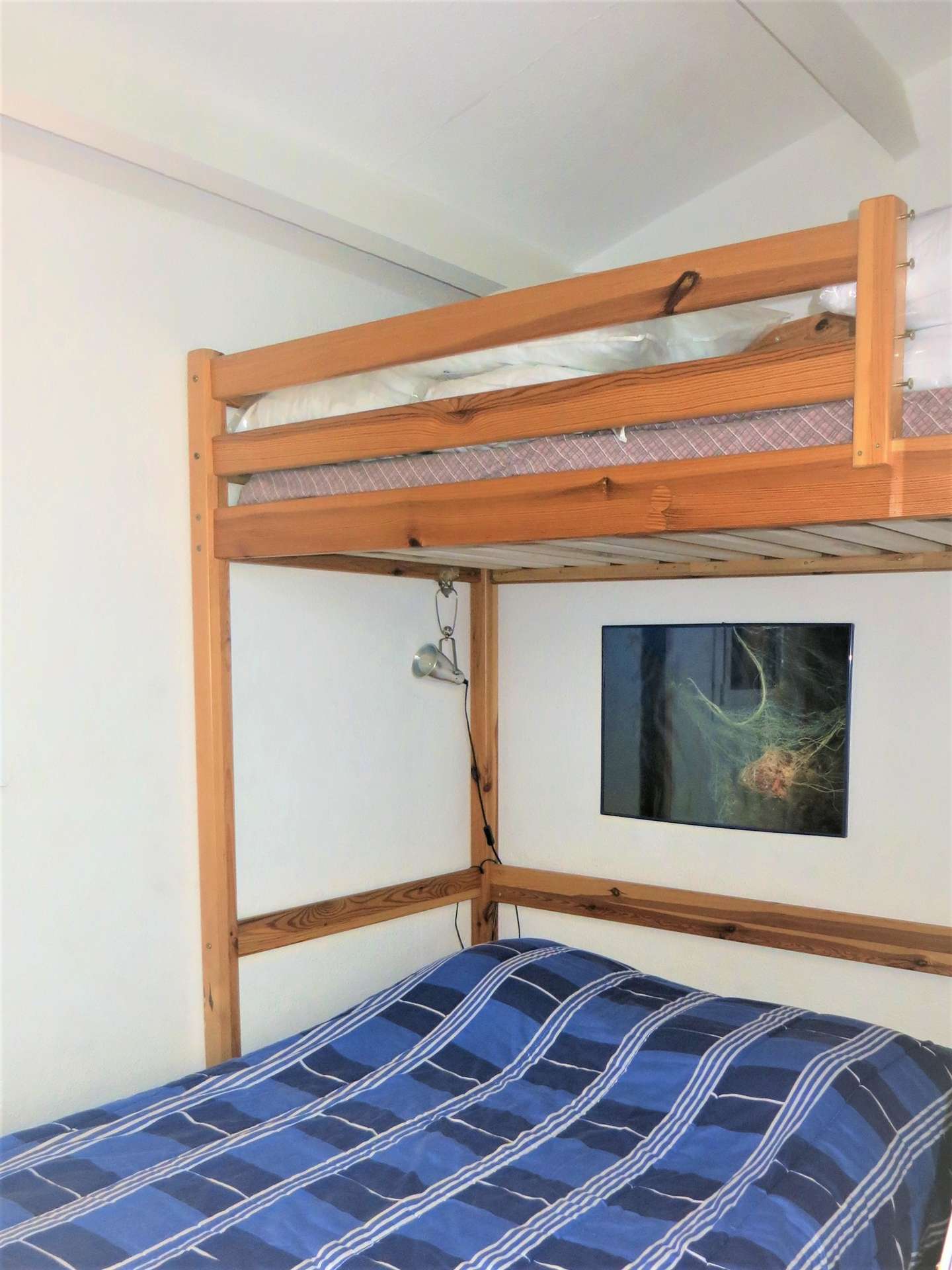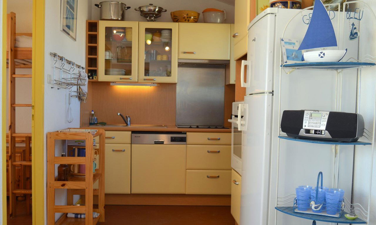 This seaside rental on the 1st floor includes a living room with a sofa bed, a fitted kitchen, a bedroom with a double bed, a bedroom with a sofa bed and a single bunk bed, a bathroom with toilet.