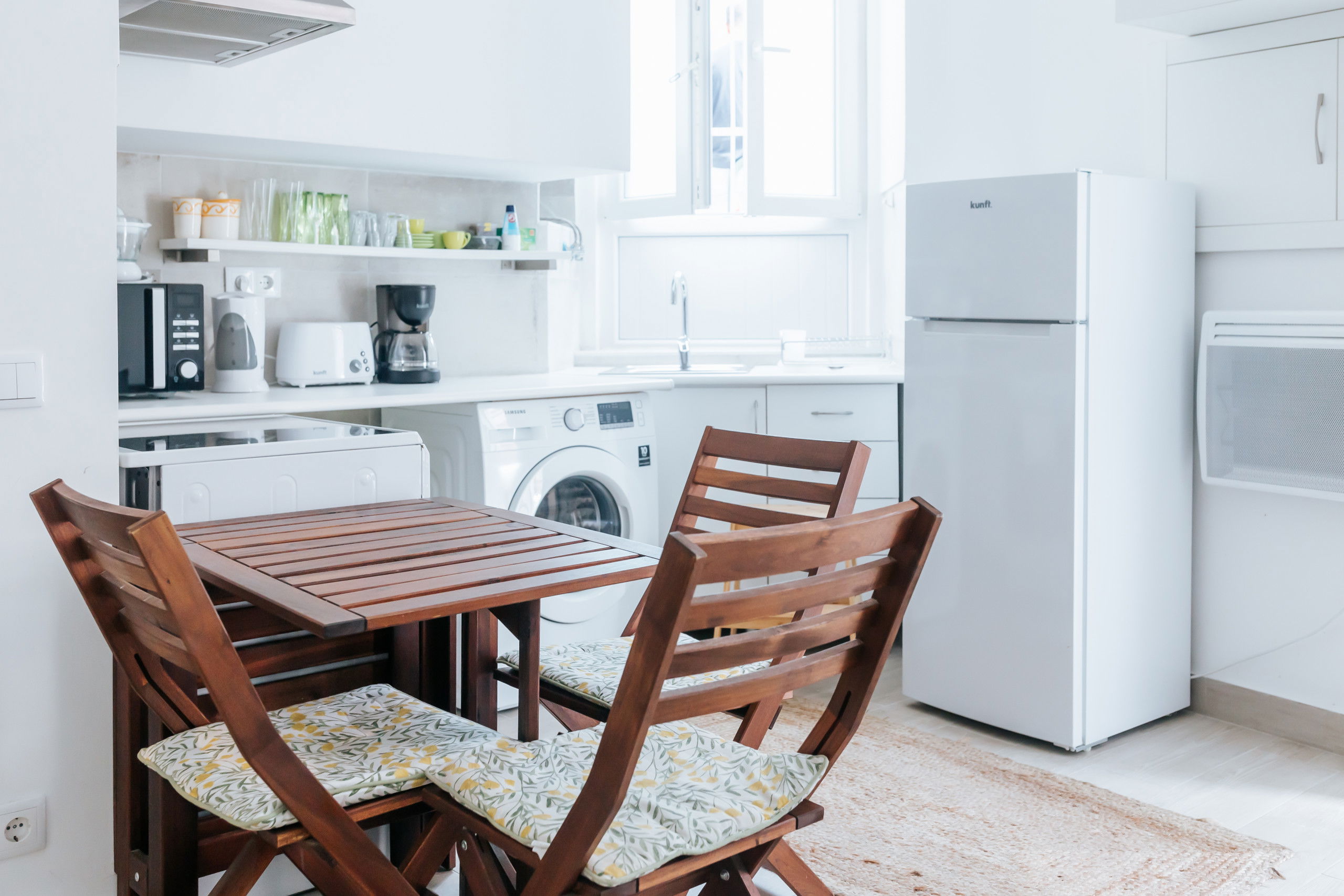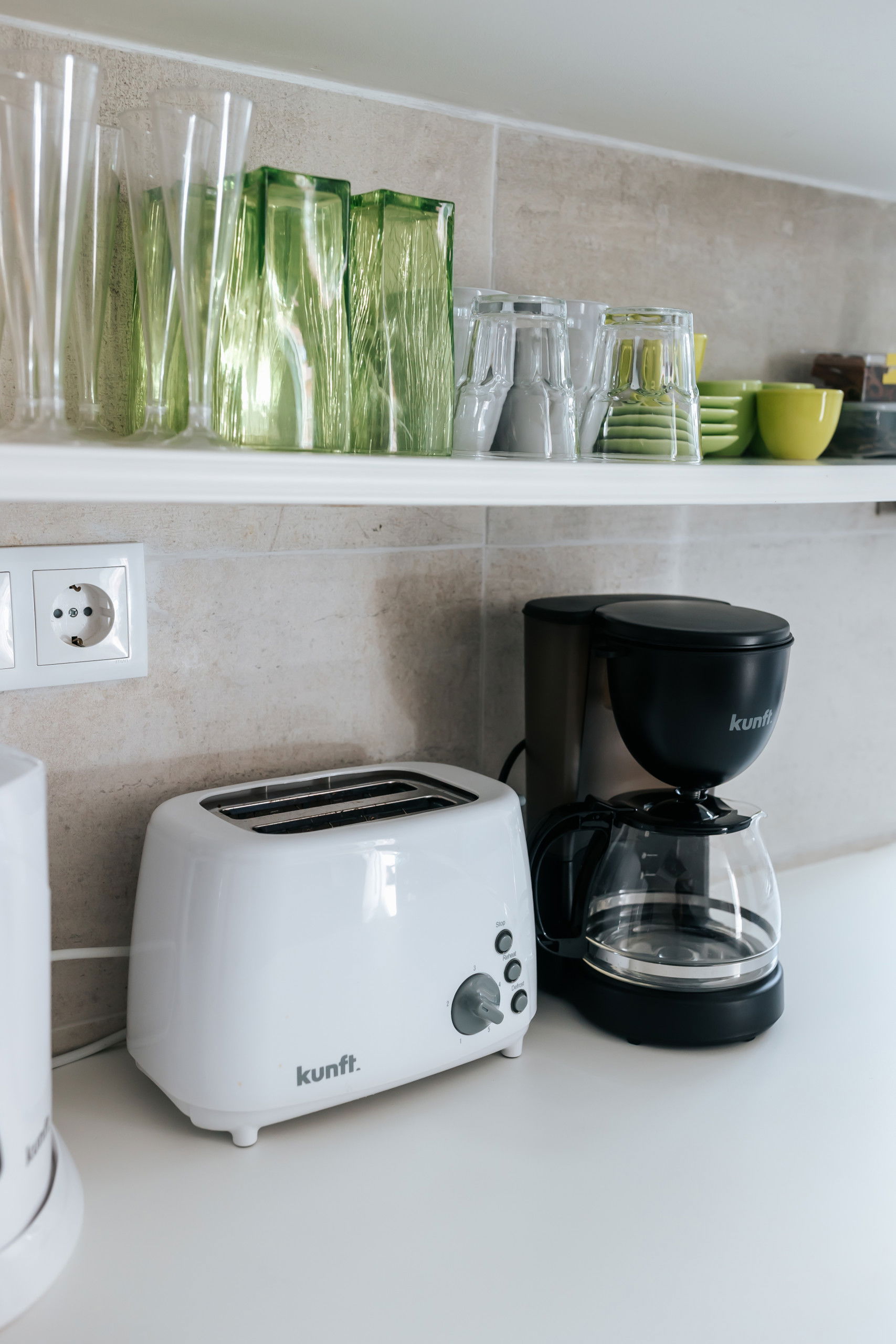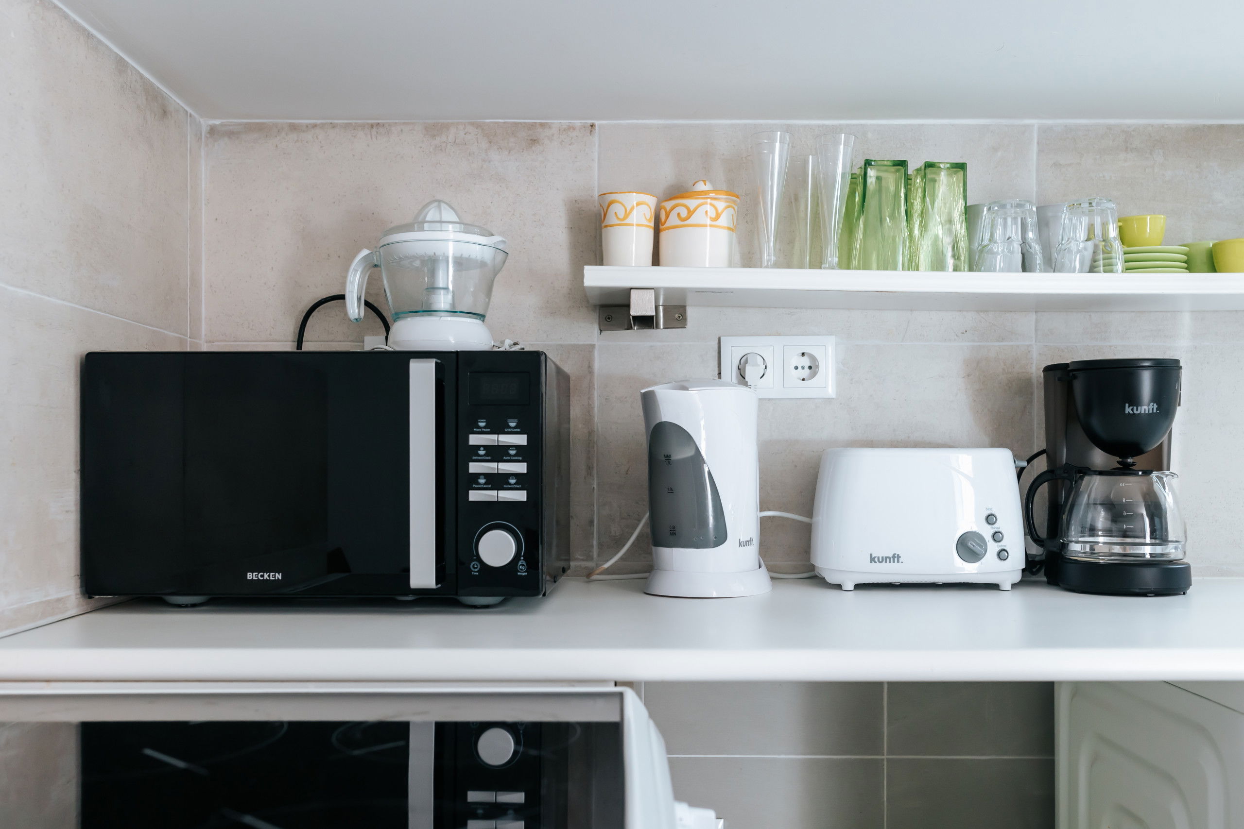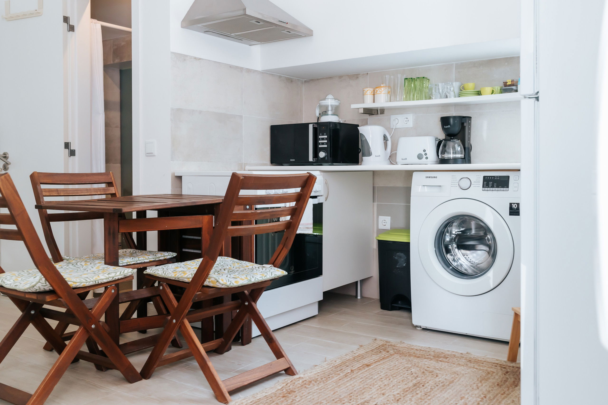 The open plan kitchen, of vitroceramic, is equipped with refrigerator, microwave, oven, freezer, dishes/cutlery, kitchen utensils, coffee machine and toaster.