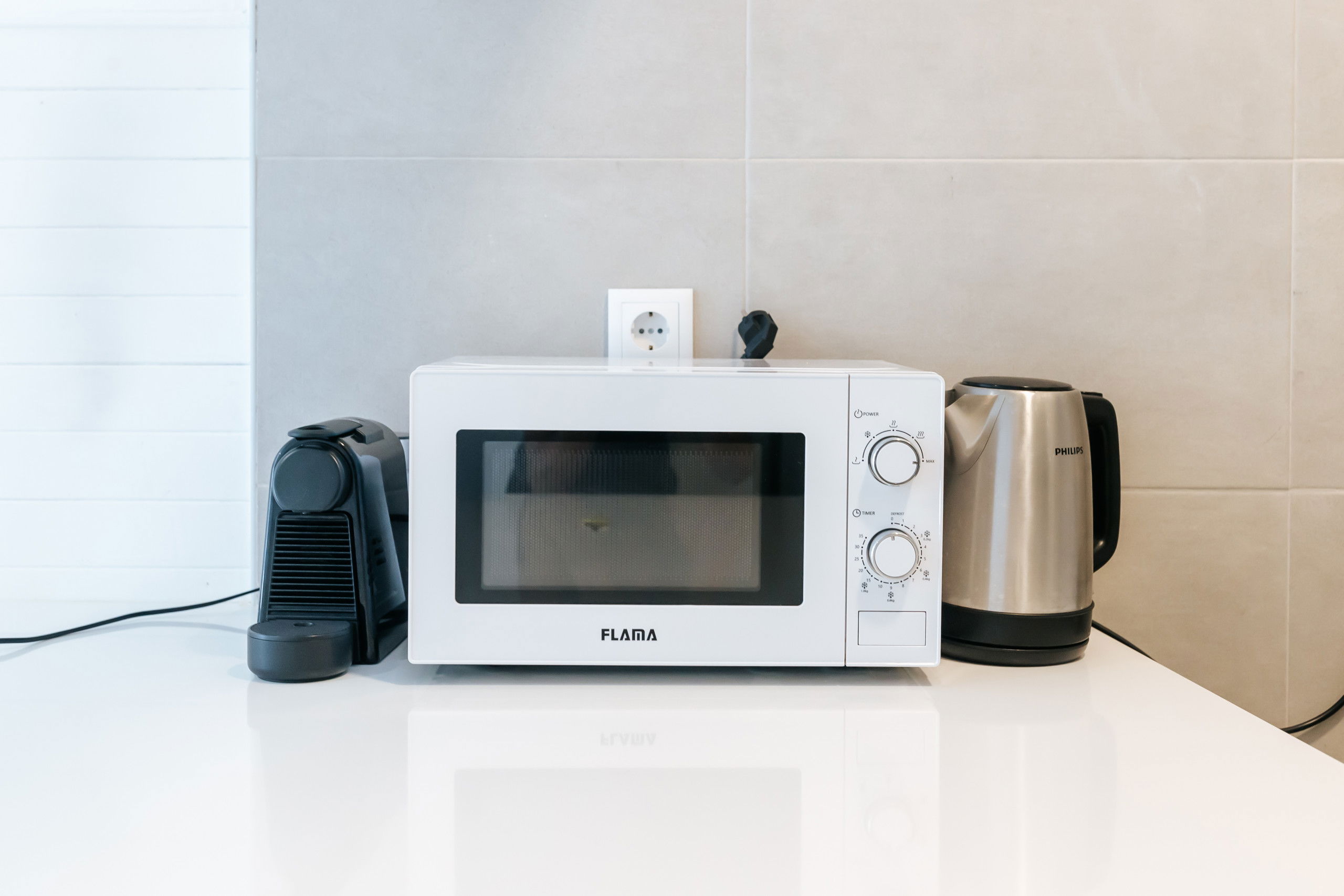 The open plan kitchen, of vitroceramic, is equipped with refrigerator, microwave, oven, freezer, washing machine, dishwasher, dishes/cutlery, kitchen utensils, coffee machine, toaster and kettle.