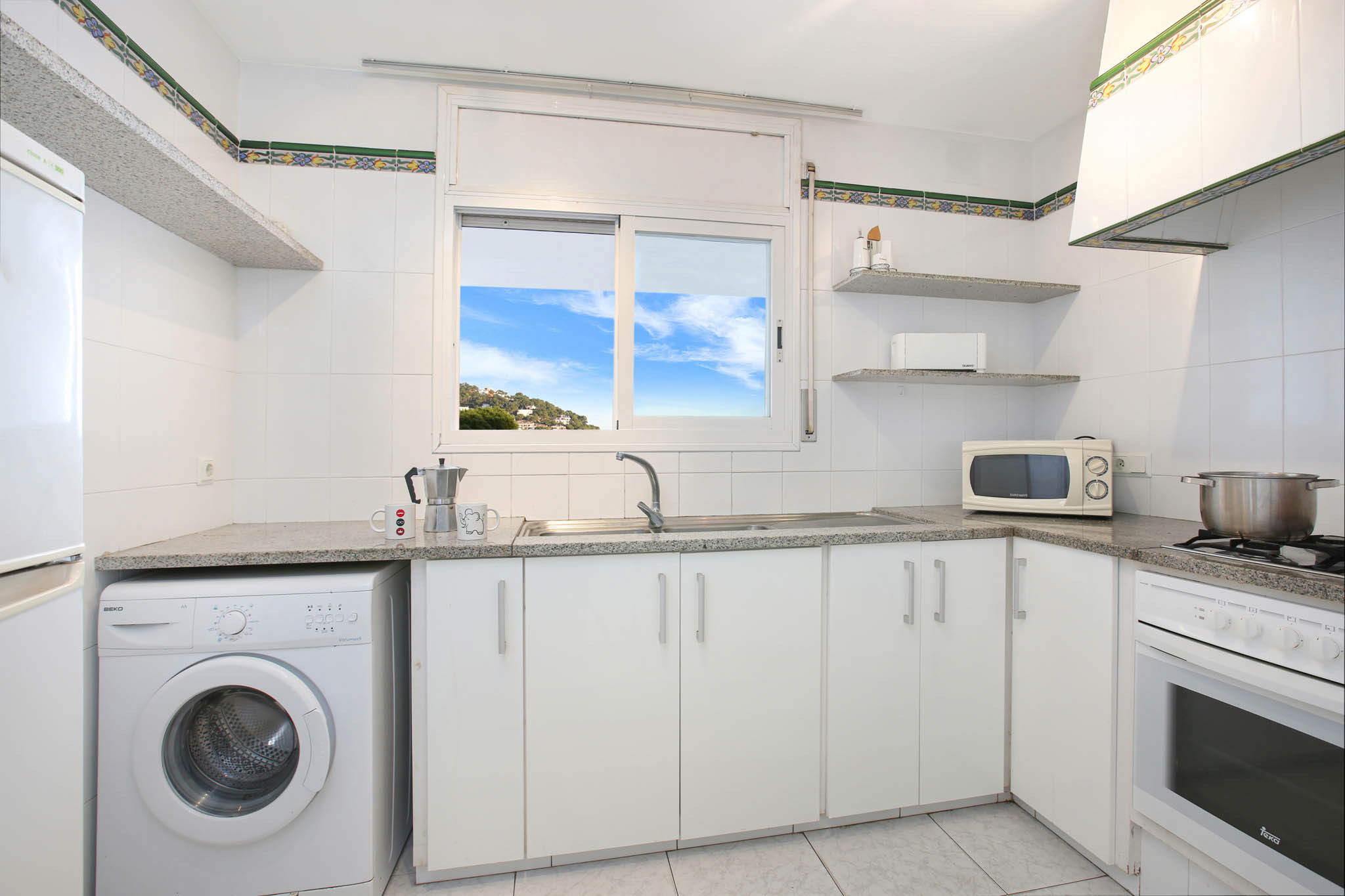 Kitchen equipped with all utensils included: cutlery, pans, fridge, freezer, gas stove, oven, microwave, coffee maker, washing machine and dishwasher.