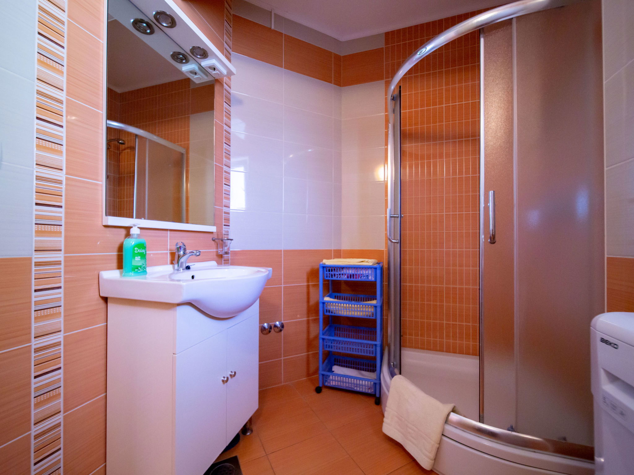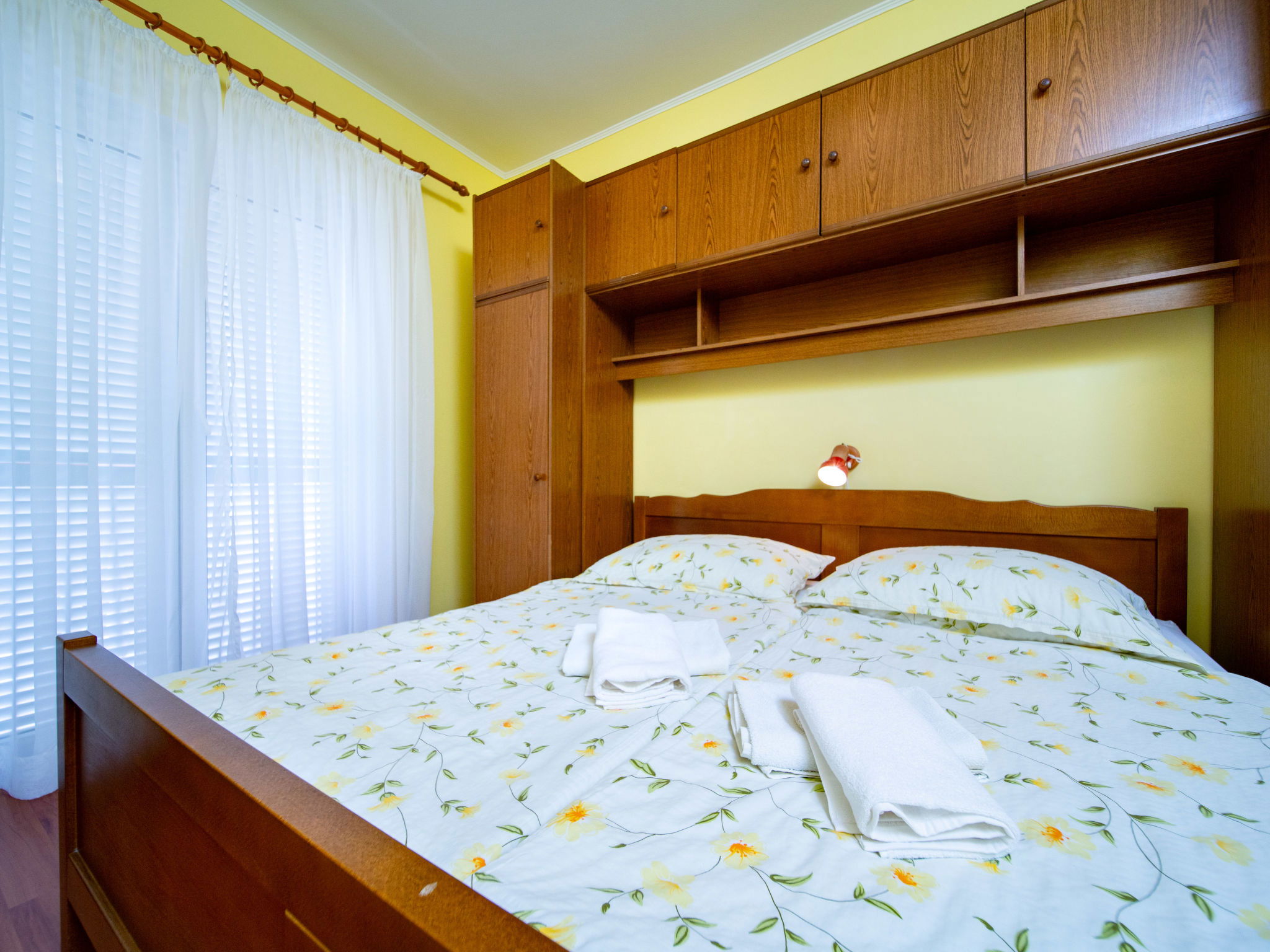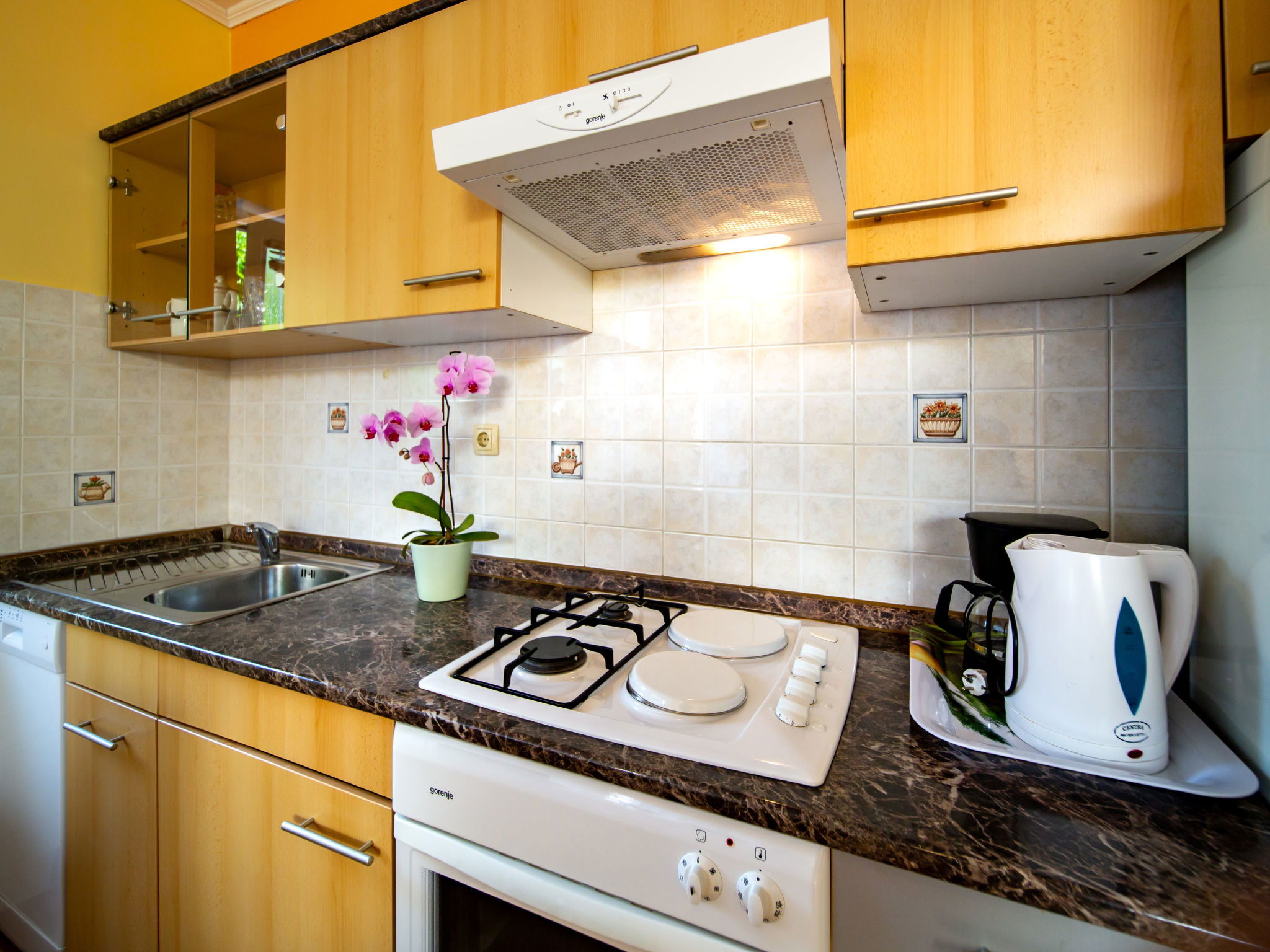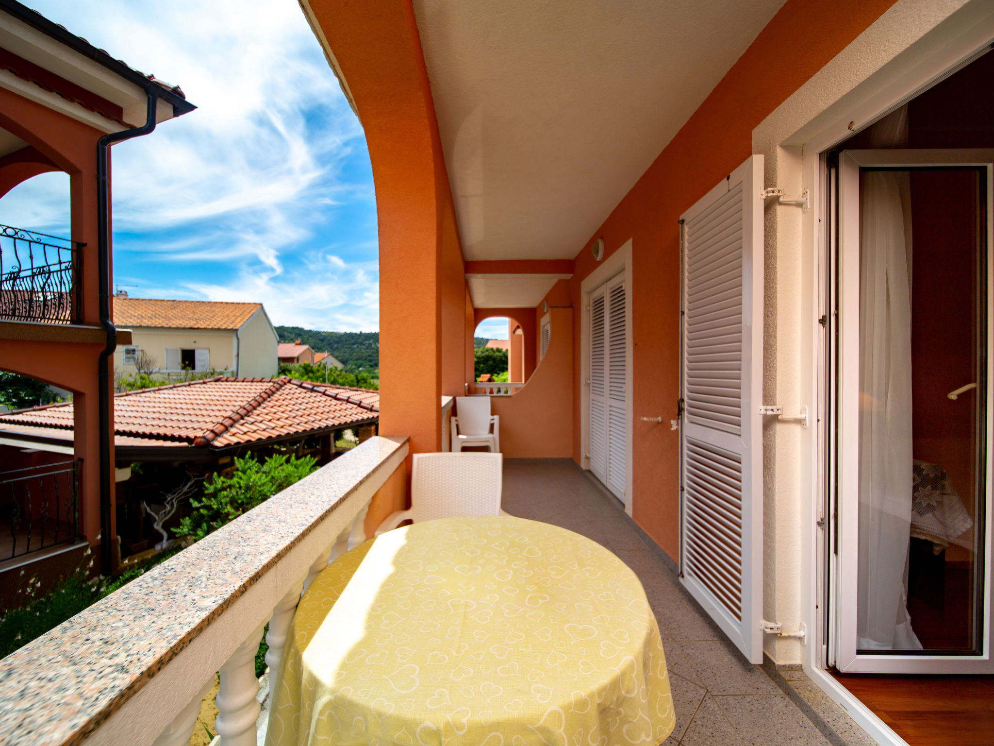 3-room apartment 60 m2, on the ground floor. Living/dining room with satellite TV and air conditioning. 2 rooms, each room with 1 double bed (2 x 80 cm, length 200 cm). Exit to the terrace. Open kitchen (2 hot plates, oven, dishwasher, 2 gas rings, toaster, kettle, microwave, freezer, electric coffee machine) with air conditioning. Exit to the terrace. Shower/WC. No heating option. Terrace 12 m2, roofed. Terrace furniture. Facilities: washing machine, safe, hair dryer. Internet (WiFi, free). Please note: non-smoking house. Maximum 1 pet/ dog allowed.