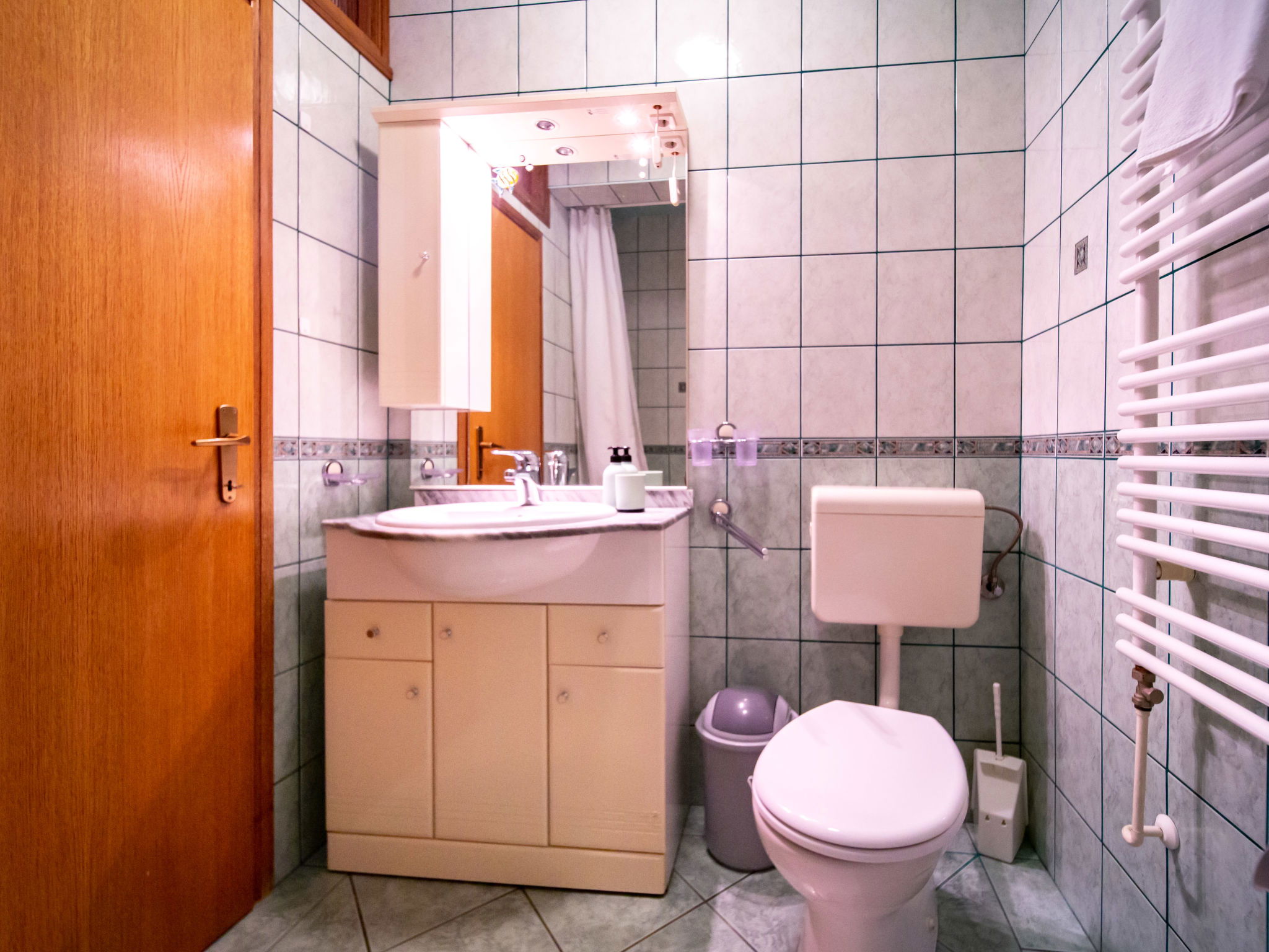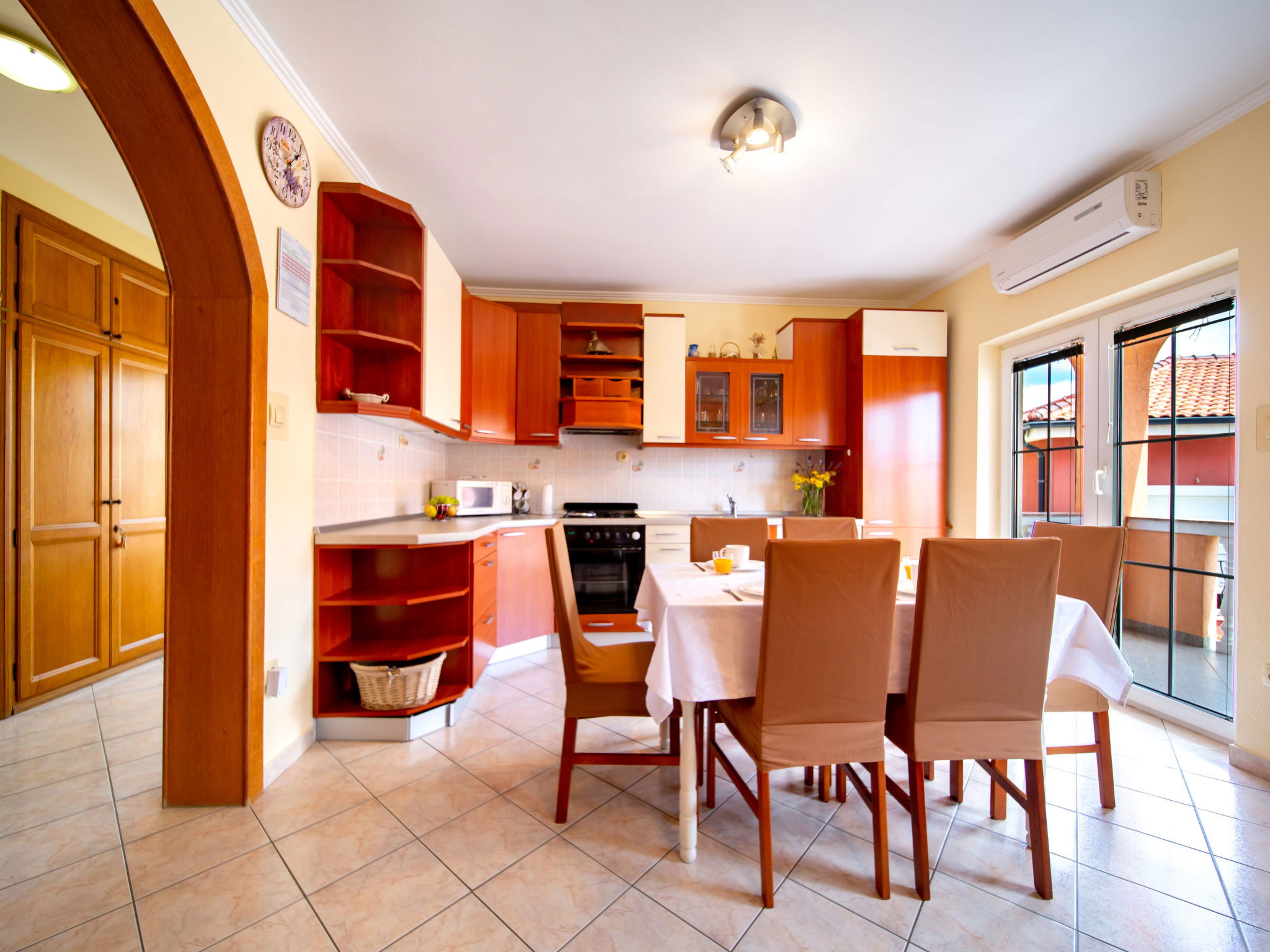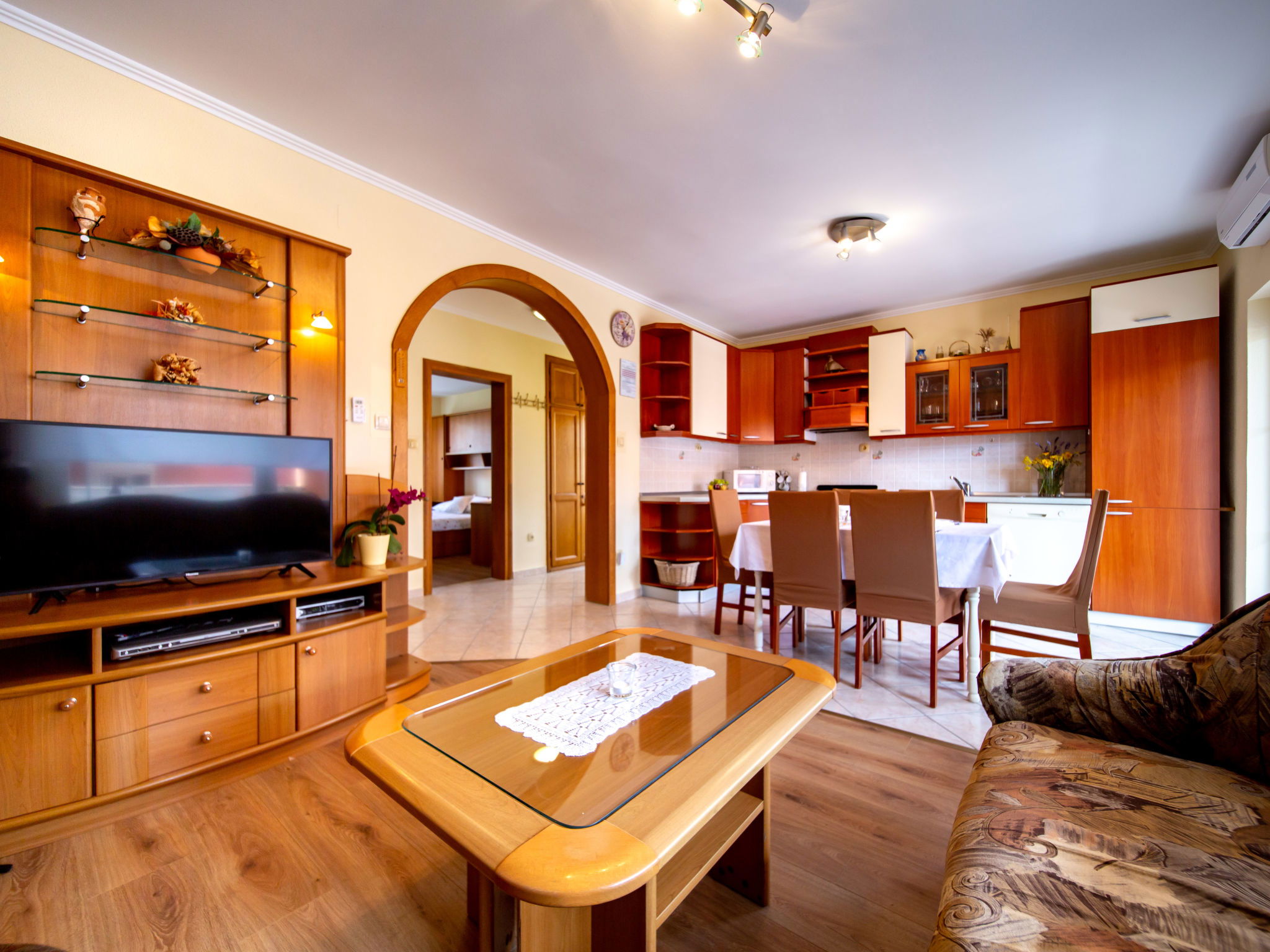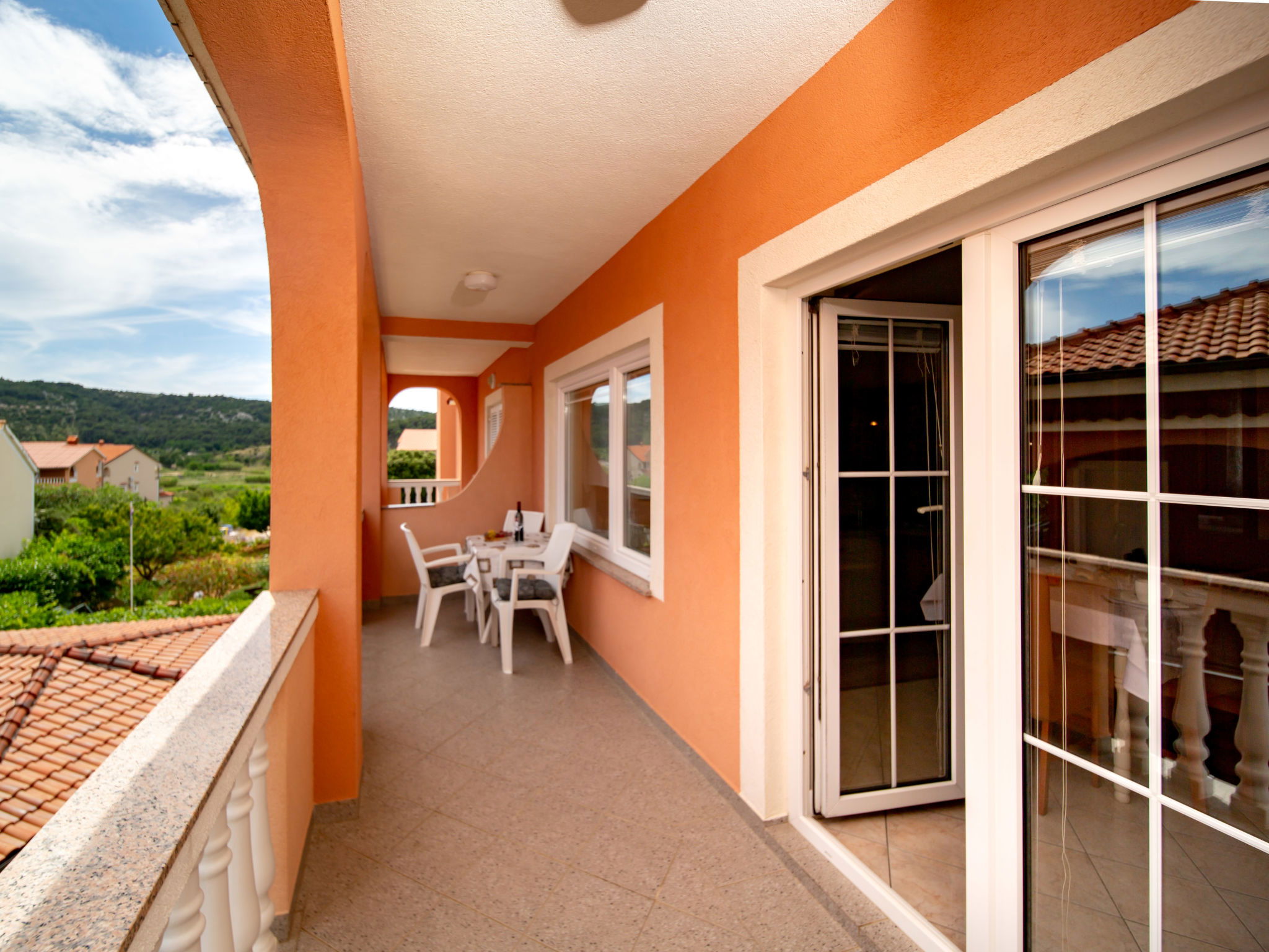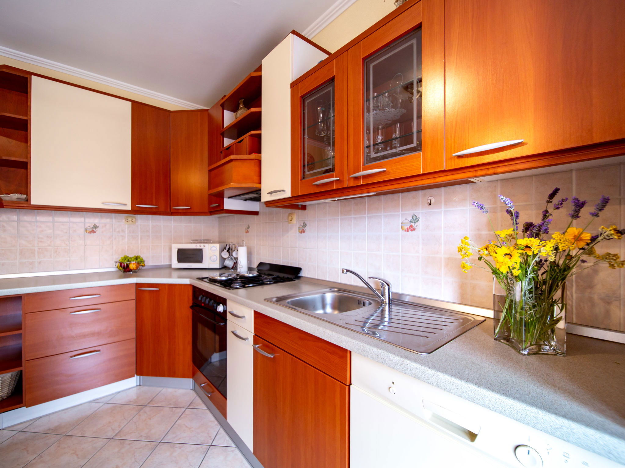3-room apartment 60 m2 on 1st floor. Living/dining room with satellite TV. 2 rooms, each room with 1 double bed (2 x 90 cm, length 200 cm). Open kitchen (2 hot plates, oven, dishwasher, 2 gas rings, toaster, kettle, microwave, freezer, electric coffee machine) with air conditioning. Exit to the terrace. Bath/WC. No heating option. Terrace 12 m2, roofed. Terrace furniture. Facilities: safe, hair dryer. Internet (WiFi, free). Please note: non-smoking house. Maximum 1 pet/ dog allowed.