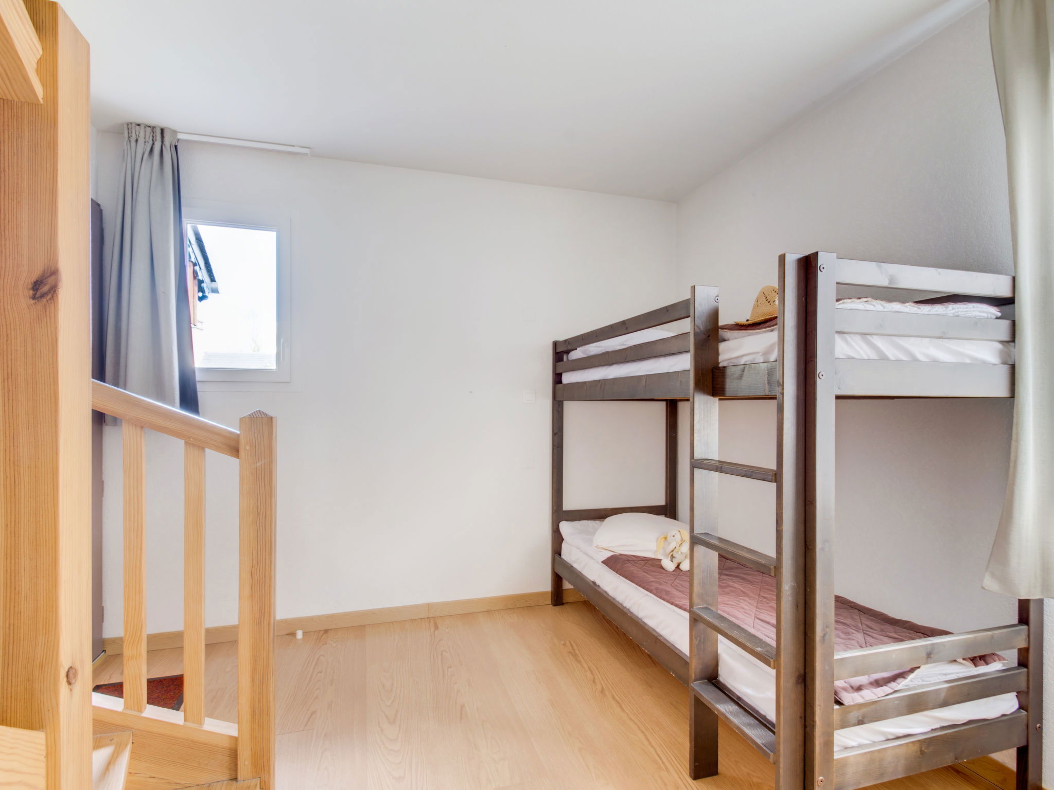 "Jardins de Balnéa 3 pièces 7 pers.", 3-room apartment 44 m2. Practical and comfortable furnishings: living/sleeping room with 1 pull-out bed (2 pers.), TV. 1 room with 1 french bed. 1 room with 1 bed. Alcove with 1 x 2 bunk beds. Kitchenette (dishwasher, 4 ceramic glass hob hotplates, microwave). Bath/shower, 2 sep. WC's. Electric heating. Balcony or terrace. Facilities: Internet (WiFi, free). Maximum 1 pet/ dog allowed. Instead of an enclosed bedroom, some sleeping areas are located in an open-plan area (gallery, alcove, etc.).