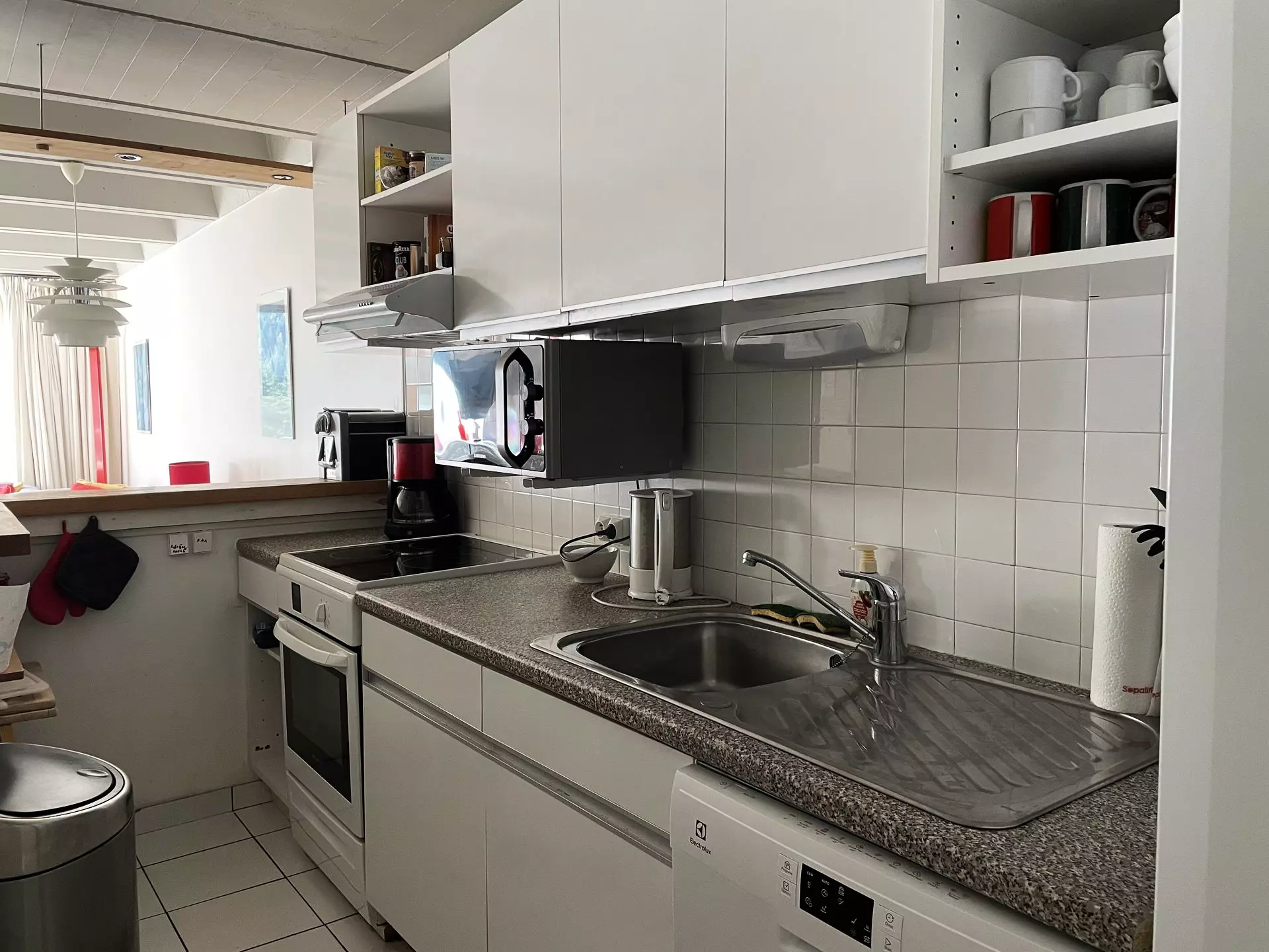 - Kitchen communicating with the living room with induction hob, oven, dishwasher, microwave.