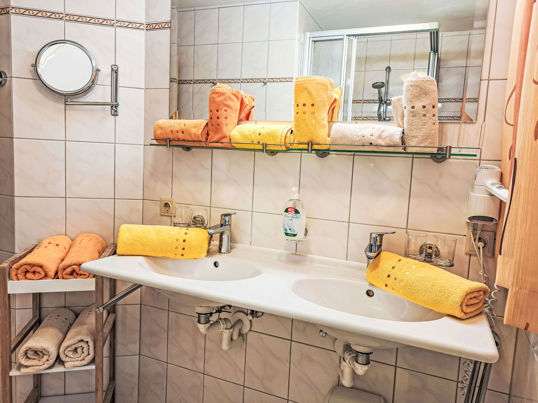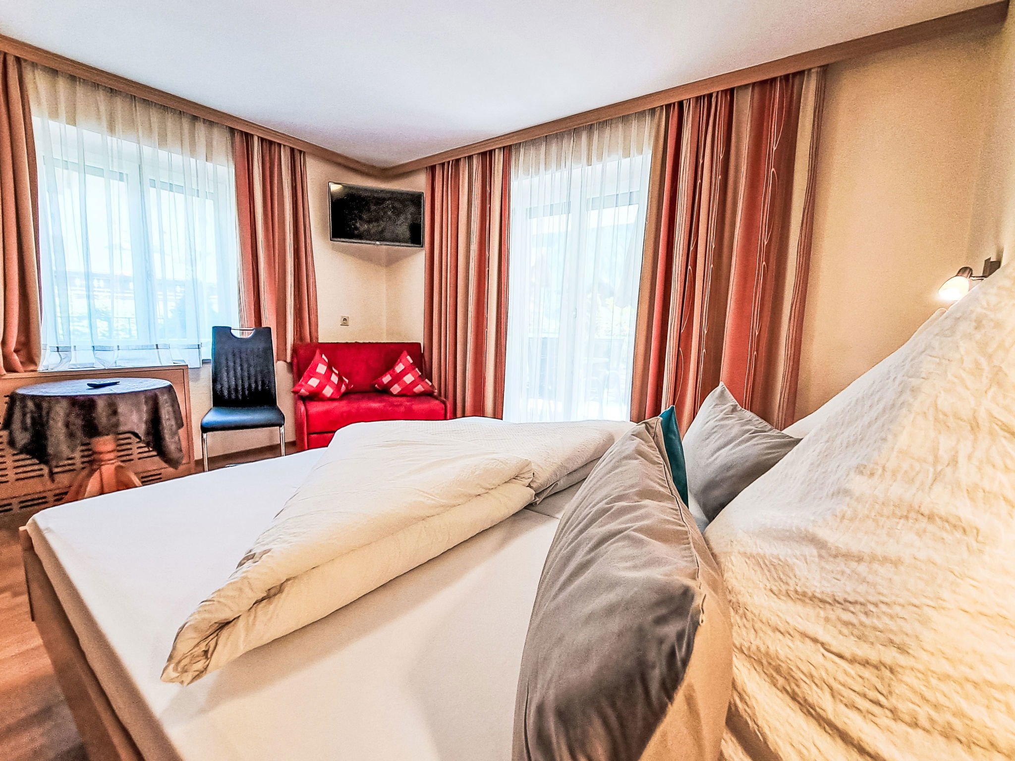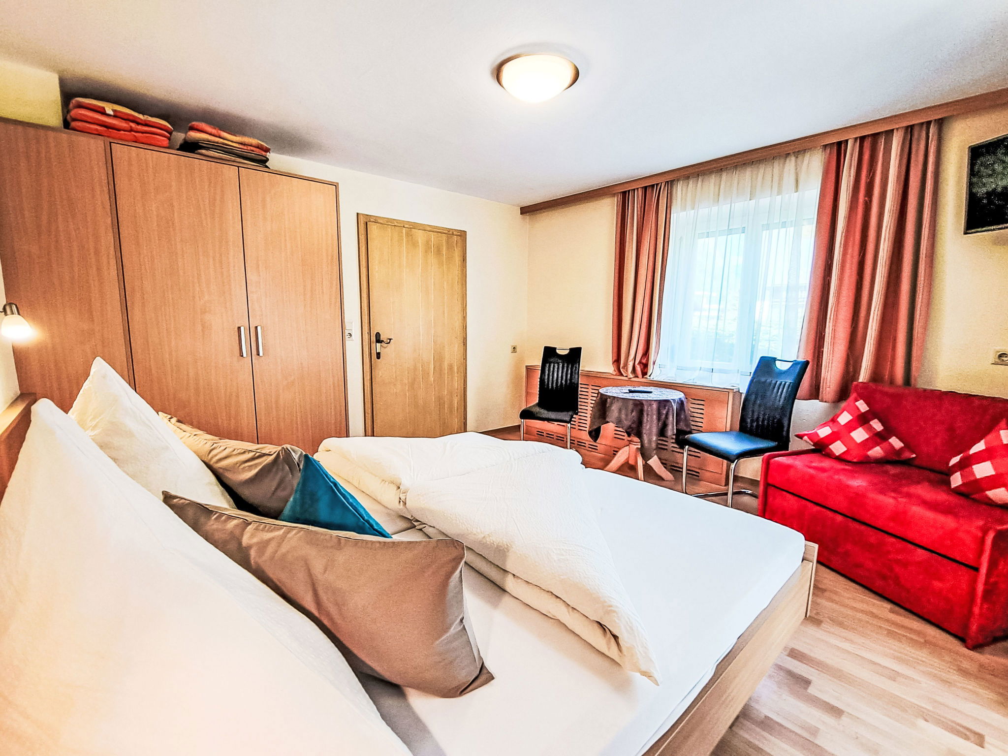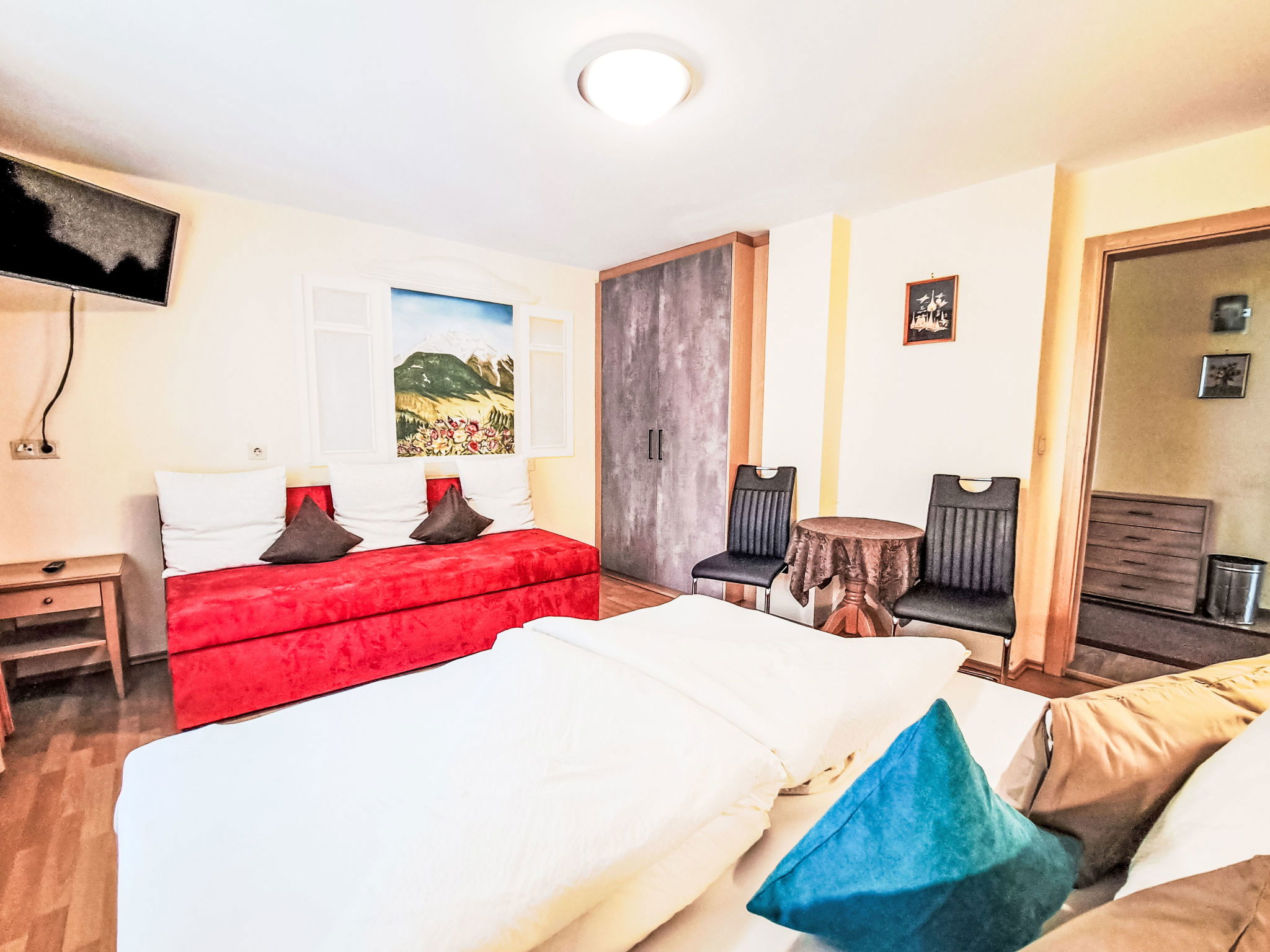 "Rosa", 4-room apartment 60 m2, on the upper ground floor. Object suitable for 6 adults. Bright, cosy furnishings: entrance hall with dining table and satellite TV. Exit to the terrace. 1 double bedroom. 2 double bedrooms. Exit to the terrace. Kitchen (dishwasher, 4 ceramic glass hob hotplates, toaster, kettle, microwave, grill, electric coffee machine). Shower, sep. WC, double hand-basin. Terrace 25 m2 partly roofed. Terrace furniture. View of the mountains. Facilities: safe. Internet (WiFi, free). Please note: non-smokers only. 1 small pet/ dog allowed. Smoke alarm, fire extinguisher.