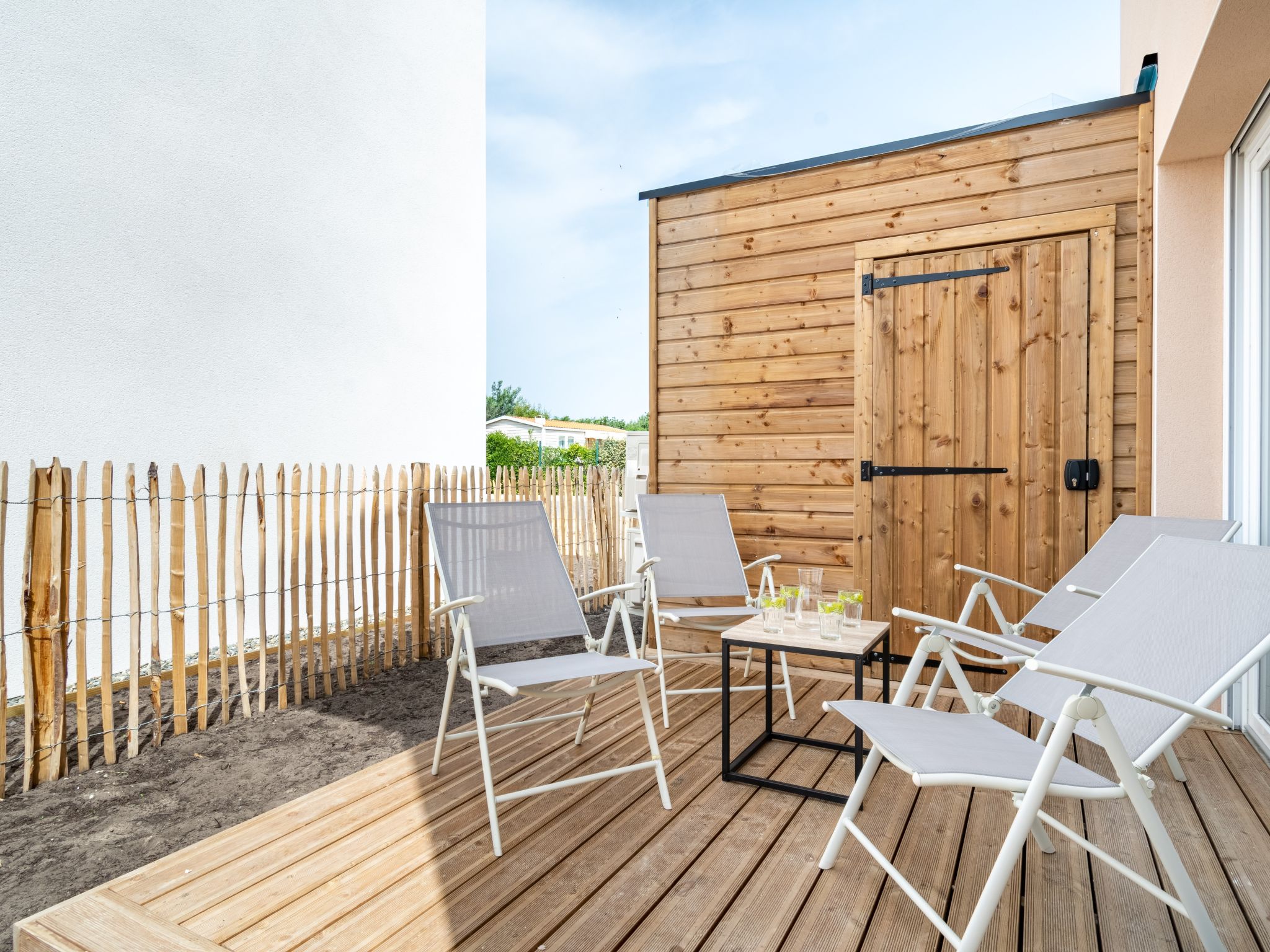 Residence "Soleil couchant". In the resort 900 m from the centre of de Mimizan Plage, 100 m from the edge of the forest, 900 m from the sea, 10 km from the lake, 900 m from the beach. For shared use: swimming pool fenced (4 x 5 m, depth 150 - 160 cm, seasonal availability: 01.Jun. - 30.Sep. pool opening hours: 10:00-21:00). Shop 850 m, grocery, bakery 800 m, pedestrian zone 800 m, bicycle rental 750 m, bus stop "Office du tourisme Mimizan" 700 m, sandy beach "la garluche" 900 m, bathing lake "Aureilhan" 10 km. Golf course (9 hole) 7 km, surf school 900 m, tennis 2.5 km. Nearby attractions: Arcachon 70 km, Biscarrosse 40 km, parcs aventure 7 km, Disc Golf 2 km. Well-known lakes can easily be reached: Aureilhan Mimizan 8 km. All houses/apartments are individually designed/furnished.