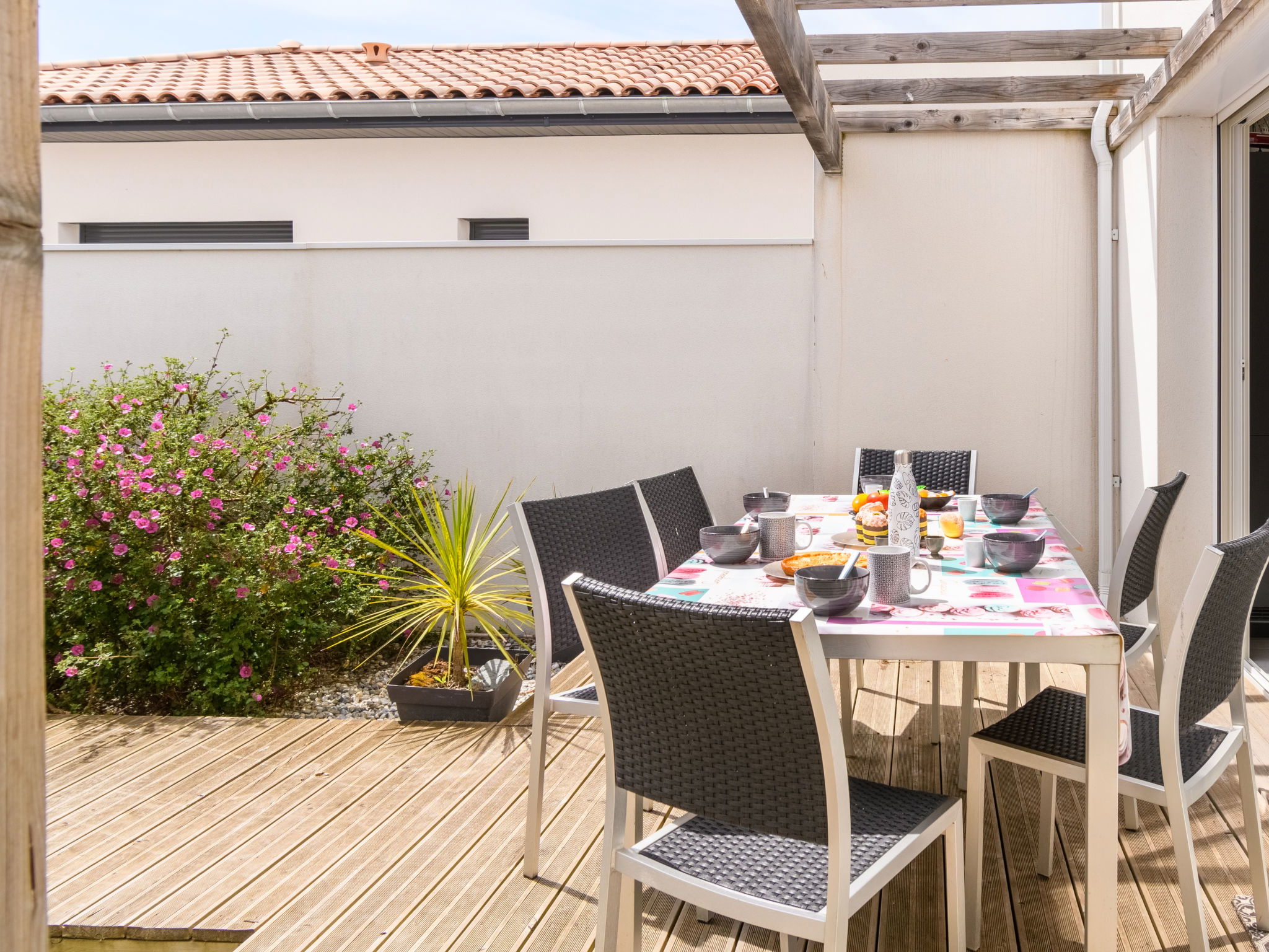Modern residence "Les Patios de Flore", 2 storeys, built in 2018. 12 apartments in the residence. In the resort 800 m from the centre of Mimizan Plage, 1.4 km from the sea, 1.4 km from the beach. In the house: storage room for bicycles (for shared use). Grocery 1.2 km, restaurant 500 m, bar, bakery 1.3 km, bicycle rental 1.2 km, bus stop "Mimiz Bus en haute saison" 10 m, sandy beach "Remember" 1.5 km, indoor swimming pool 6 km, bathing lake "Aureilhan" 9 km. Surf school 1.4 km, riding stable 6 km, cycle lane 500 m. Nearby attractions: Skate Parc 30 m, Camping 200 m. Residence with electric gates.