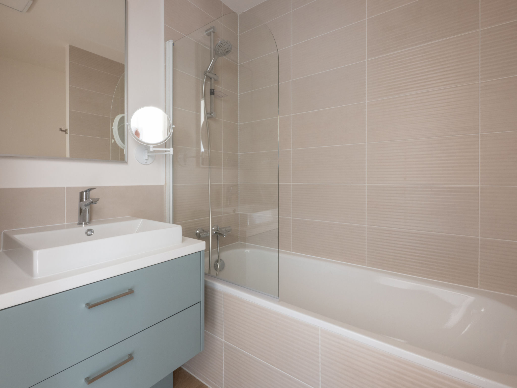 Residence "Bleu Canopée", 3 storeys, built in 2025. 100 apartments in the residence. 5 km from the centre of Mimizan, in the residential district, 650 m from the sea, 650 m from the beach. For shared use: property with lawn, swimming pool fenced (98 m2, depth 80 - 140 cm, seasonal availability: 01.May. - 30.Sep.) with internal staircase. Children's pool. In the complex: reception, WiFi, sauna (extra). Fitness room, washing machine, tumble dryer (for shared use, extra). Parking. Supermarket 1.4 km, restaurant 1 km, bus stop "Office de tourisme Mimizan" 1.3 km, railway station "Labouheyre" 30 km, sandy beach 650 m, park "Landes aventures" 6 km, bathing lake "Aureilhan" 10 km. Golf course (9 hole) 7 km. Nearby attractions: Bassin Arcachon 70 km, Biscarrosse 35 km, Casino Mimizan - Plage 1 km, Centre Nautique 6 km, Bordeaux 110 km. Please note: the photograph shows a typical example.
