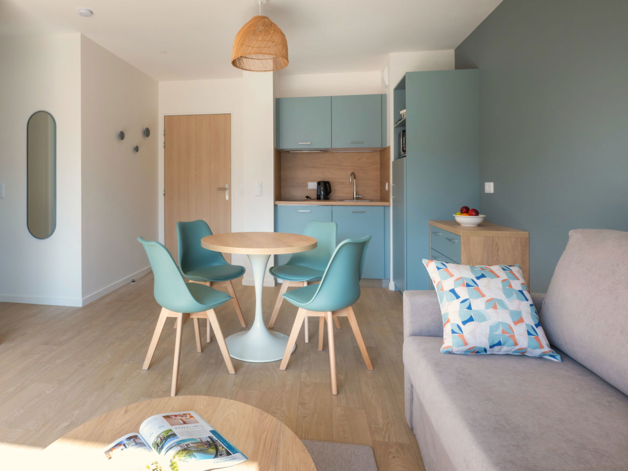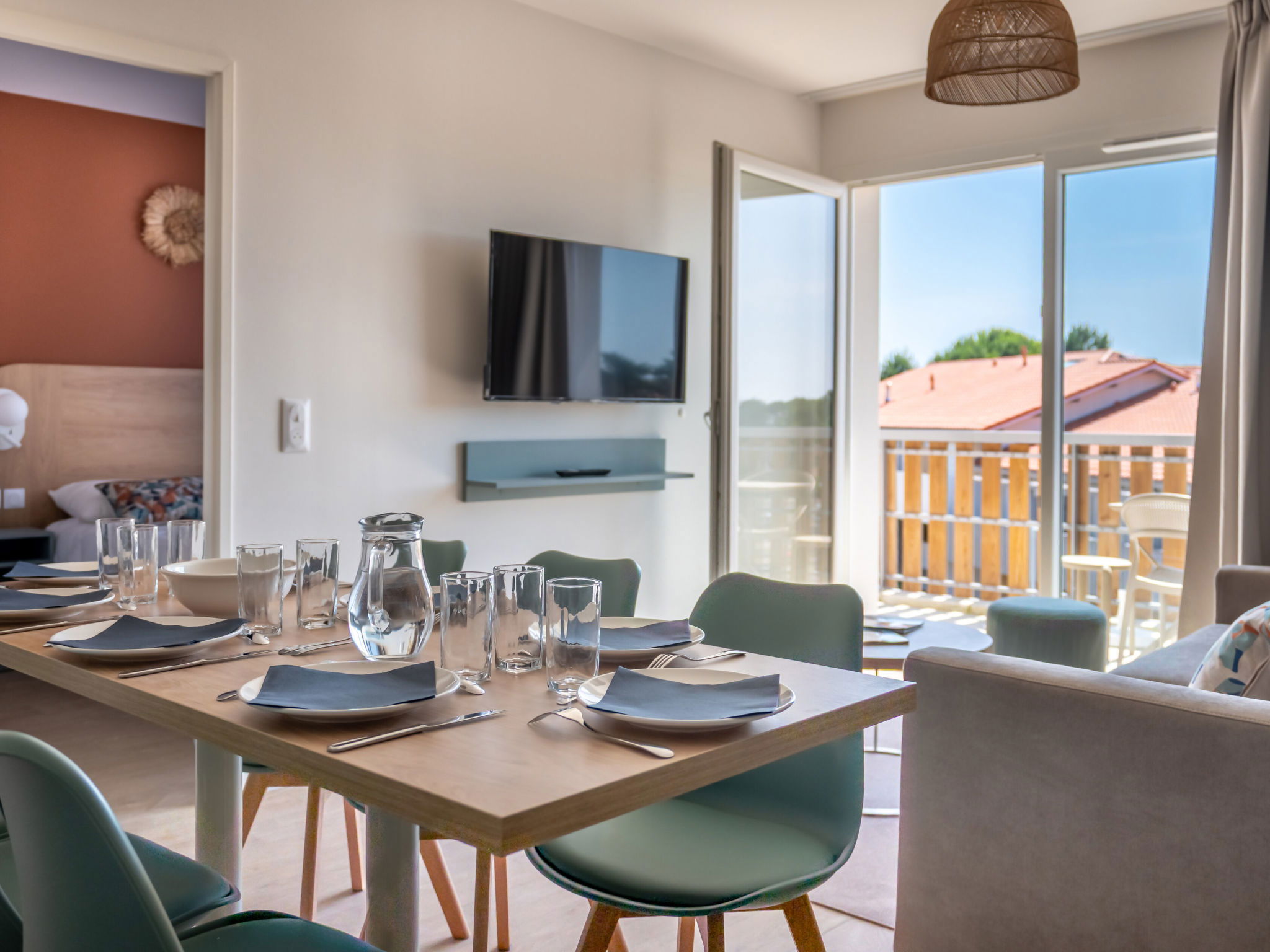 "Bleu Canopée", 3-room apartment 44 m2. Comfortable and beautiful furnishings: living/dining room with 1 sofabed (140 cm, length 90 cm), dining table and TV (flat screen). Exit to the balcony, to the terrace. 1 room with 1 french bed (160 cm, length 200 cm). 1 room with 2 beds (90 cm, length 190 cm). Kitchenette (dishwasher, 4 ceramic glass hob hotplates, toaster, kettle, electric coffee machine, combination microwave). Bath/shower, sep. WC. Electric heating. Small balcony or small terrace. Terrace furniture. Facilities: children's high chair, baby cot (extra), hair dryer. Internet (WiFi, free). Parking. Please note: maximum 2 pets/ dogs allowed. Smoke alarm. The property is one of a type of property or apartment.