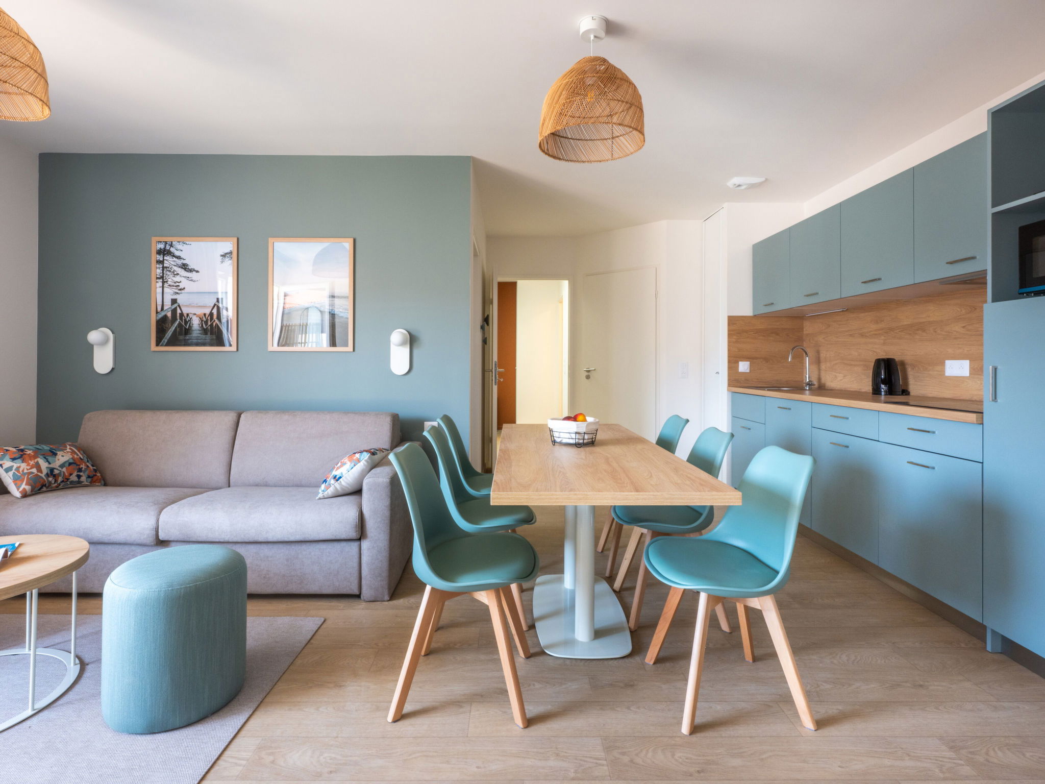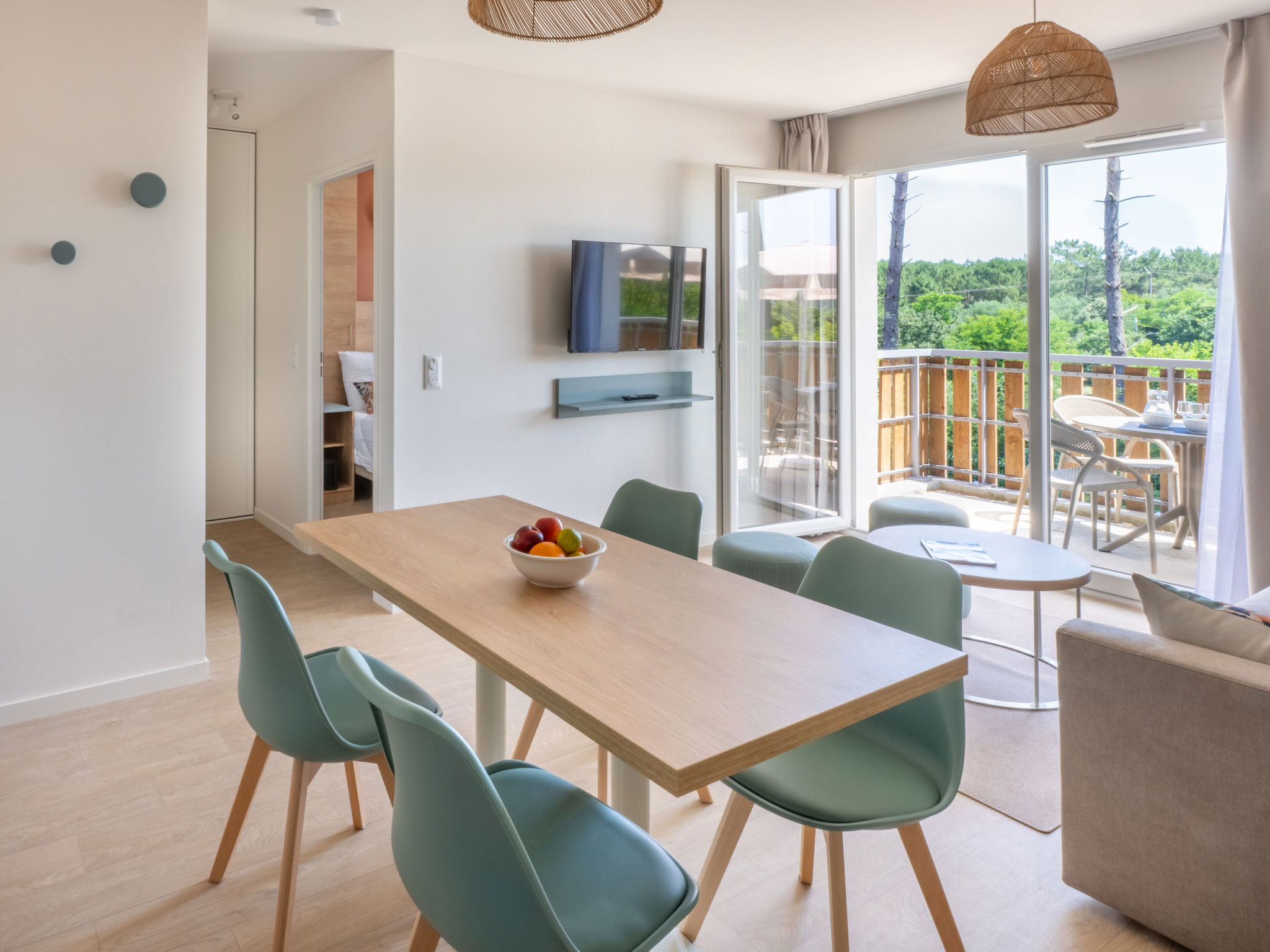 "Bleu Canopée", 4-room apartment 56 m2. Comfortable and beautiful furnishings: living/dining room with 1 sofabed (140 cm, length 90 cm), dining table and TV (flat screen). Exit to the balcony, to the terrace. 1 room with 1 french bed (160 cm, length 200 cm). 2 rooms, each room with 2 beds (90 cm, length 190 cm). Kitchenette (dishwasher, 4 ceramic glass hob hotplates, toaster, kettle, electric coffee machine, combination microwave). Bath/shower, sep. WC. Electric heating. Small balcony or small terrace. Terrace furniture. Facilities: children's high chair, baby cot (extra), hair dryer. Internet (WiFi, free). Please note: maximum 2 pets/ dogs allowed. Smoke alarm. The property is one of a type of property or apartment.