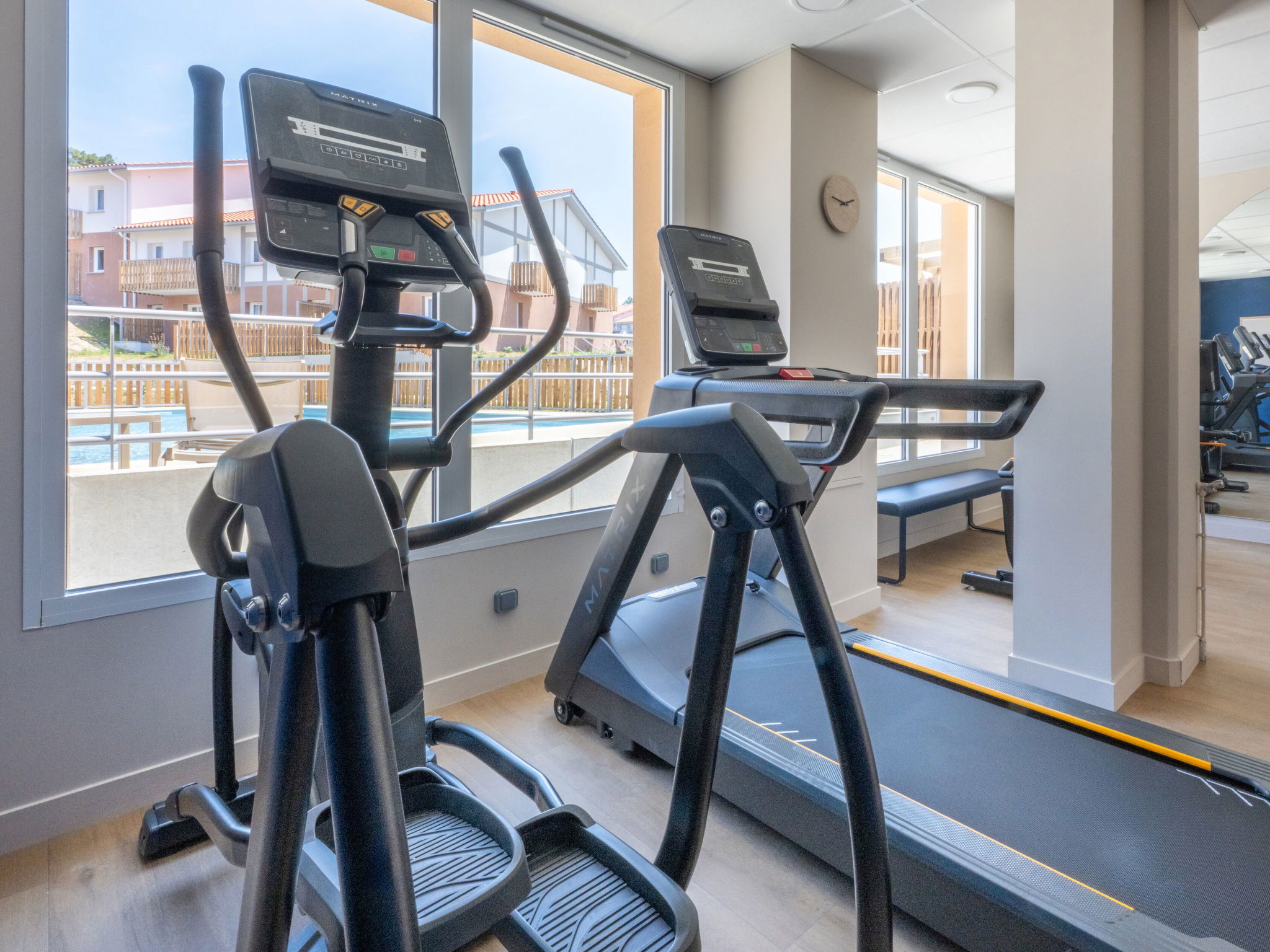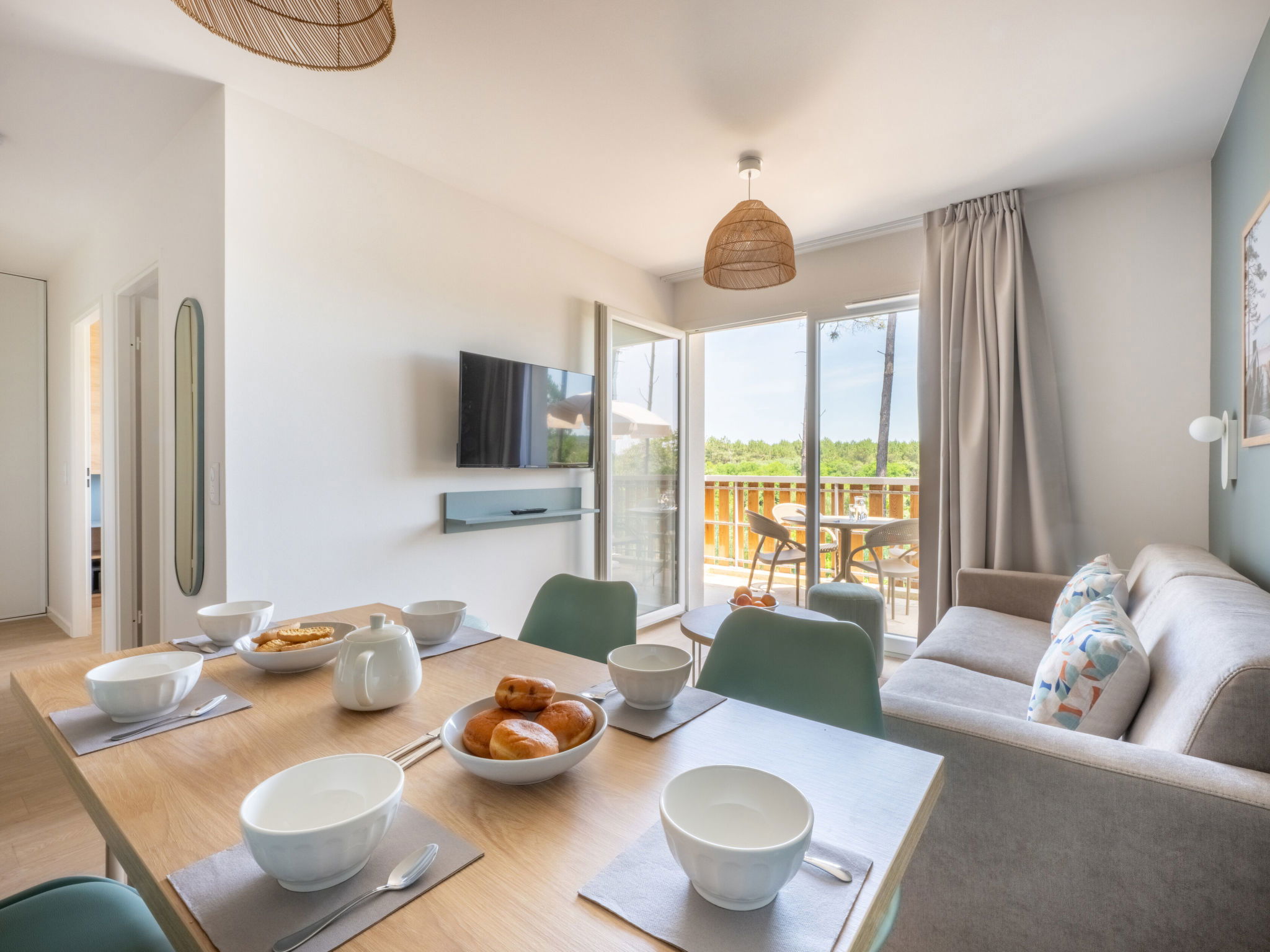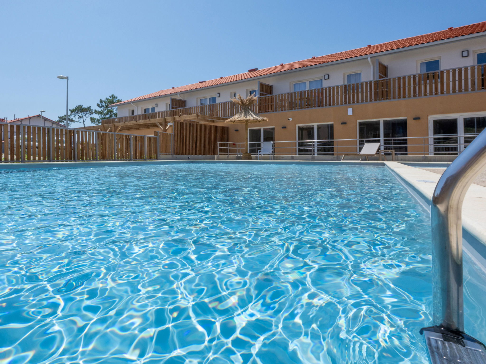 Residence "Bleu Canopée", 3 storeys, built in 2025. 100 apartments in the residence. 5 km from the centre of Mimizan, in the residential district, 650 m from the sea, 650 m from the beach. For shared use: property with lawn, swimming pool fenced (98 m2, depth 80 - 140 cm, seasonal availability: 01.May. - 30.Sep.) with internal staircase. Children's pool. In the complex: reception, WiFi, sauna (extra). Fitness room, washing machine, tumble dryer (for shared use, extra). Parking. Supermarket 1.4 km, restaurant 1 km, bus stop "Office de tourisme Mimizan" 1.3 km, railway station "Labouheyre" 30 km, sandy beach 650 m, park "Landes aventures" 6 km, bathing lake "Aureilhan" 10 km. Golf course (9 hole) 7 km. Nearby attractions: Bassin Arcachon 70 km, Biscarrosse 35 km, Casino Mimizan - Plage 1 km, Centre Nautique 6 km, Bordeaux 110 km. Please note: the photograph shows a typical example.