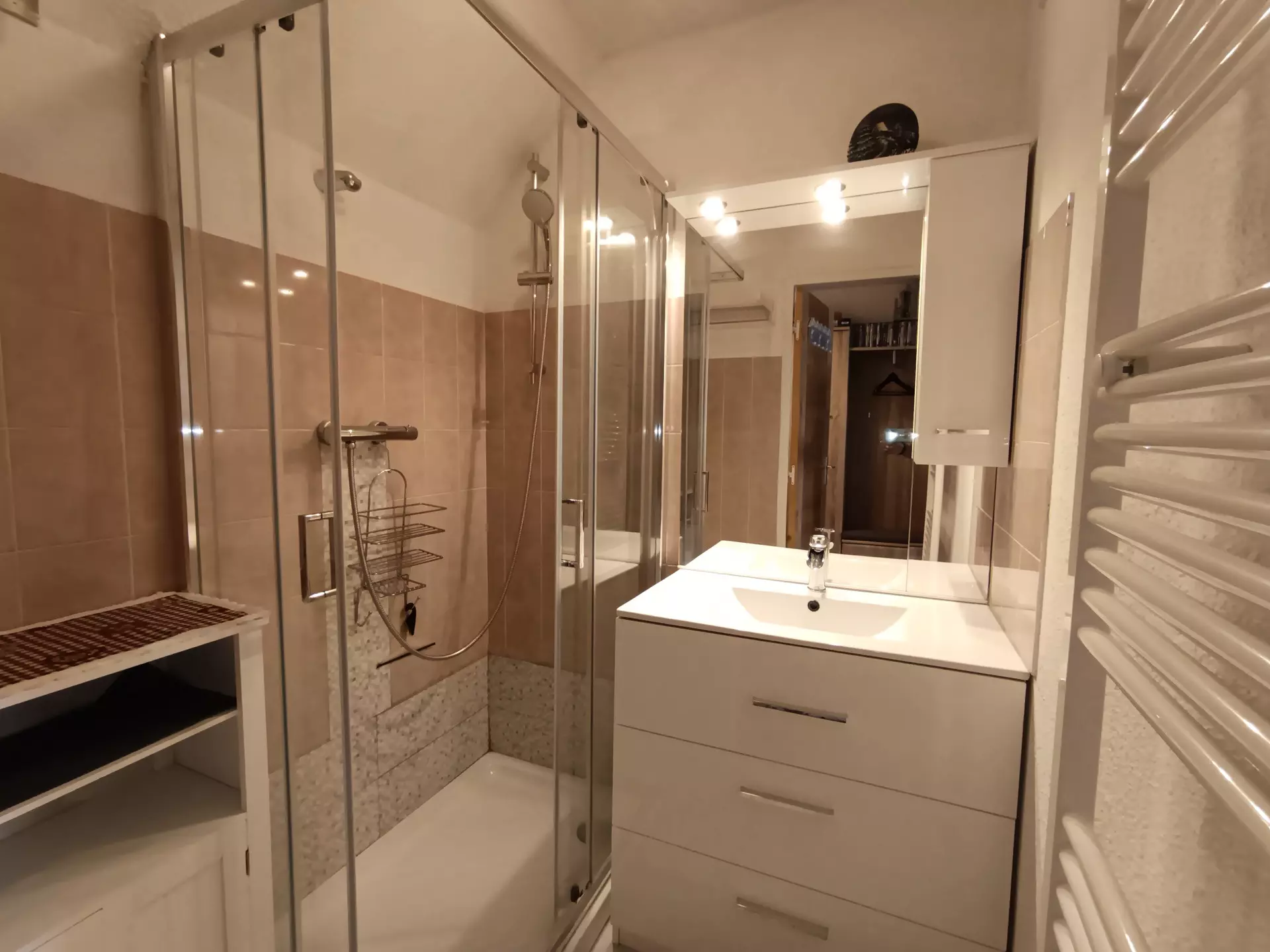 Shower room: Shower cubicle with shower screen, cabinet + drawers with sink, large mirror, wall-mounted electric towel dryer.
