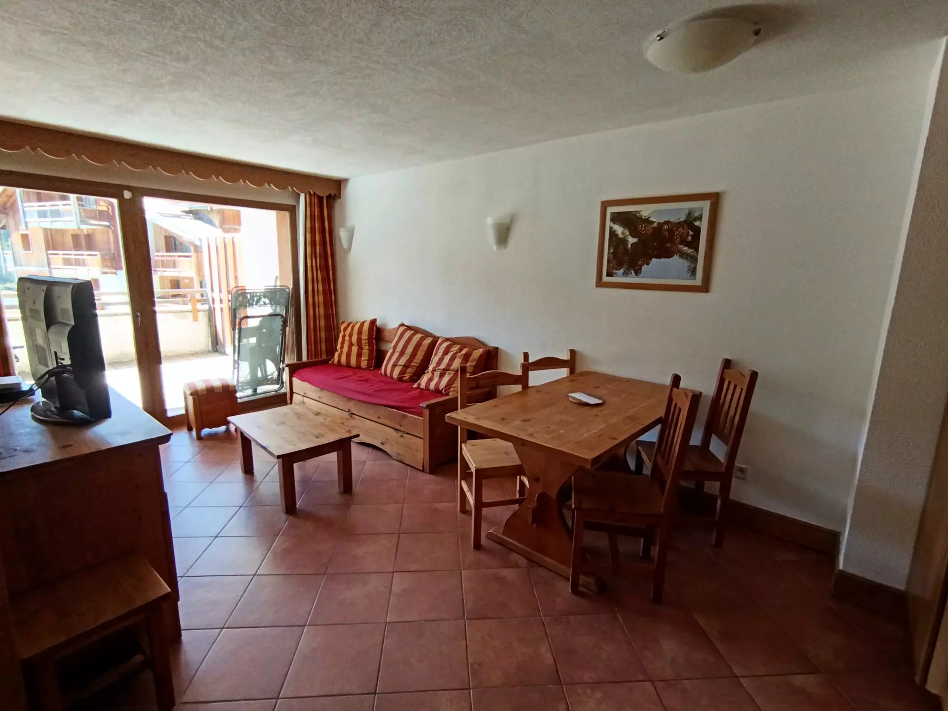 Living room with 3-seater sofa, dining area with table and chairs, television, bay window with direct access to the south-facing terrace.
