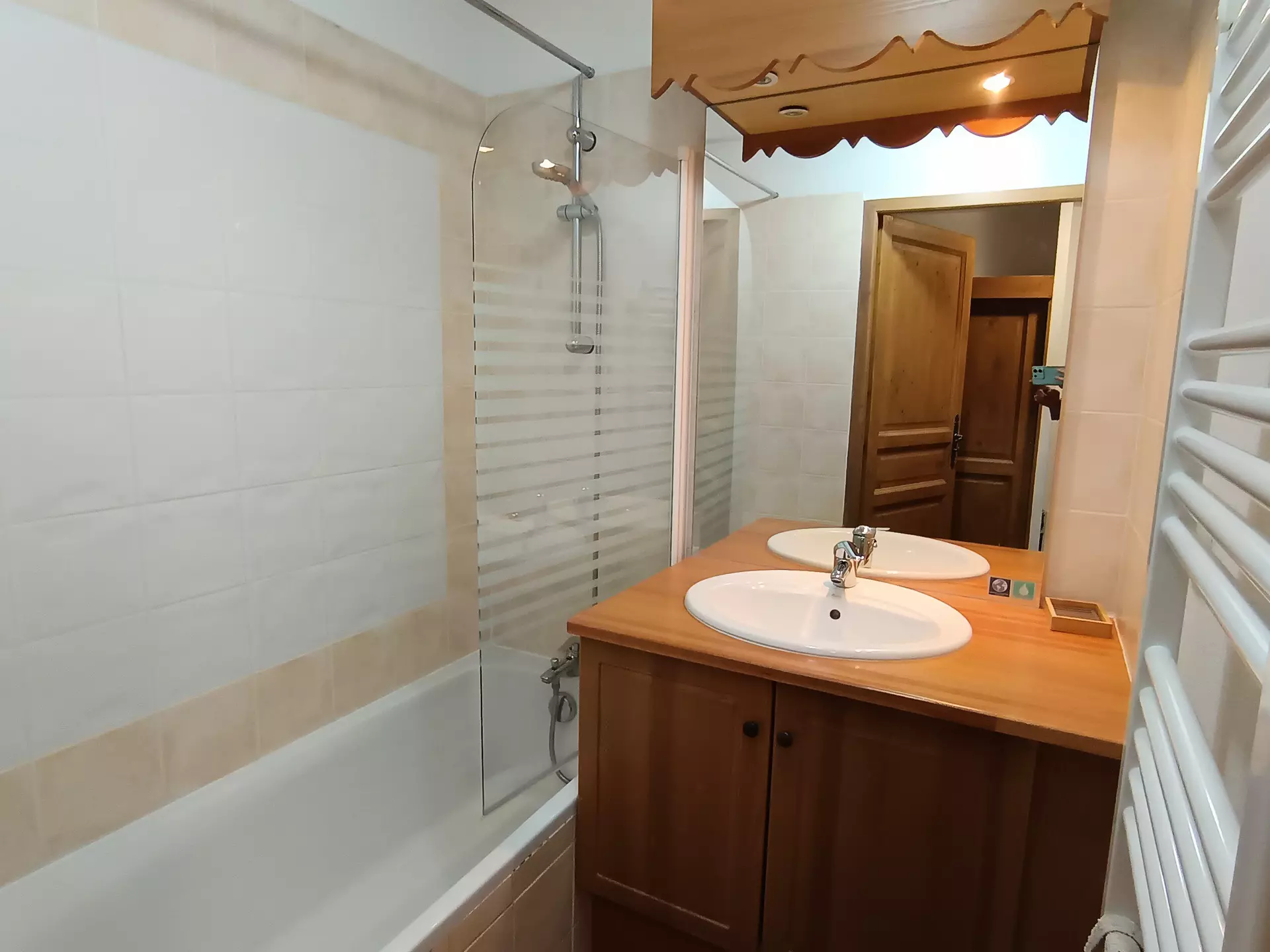 1 bathroom: Bathtub with shower screen, vanity unit with sink, wall-mounted electric towel dryer, large mirror