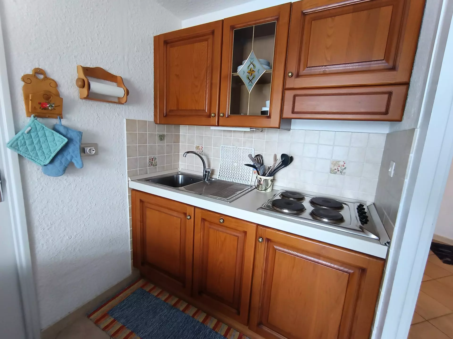 Kitchen area: top refrigerator, 4 electric hotplates, extractor hood, mini-oven, dishwasher