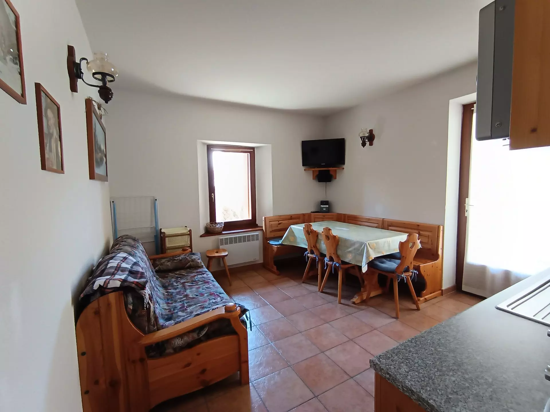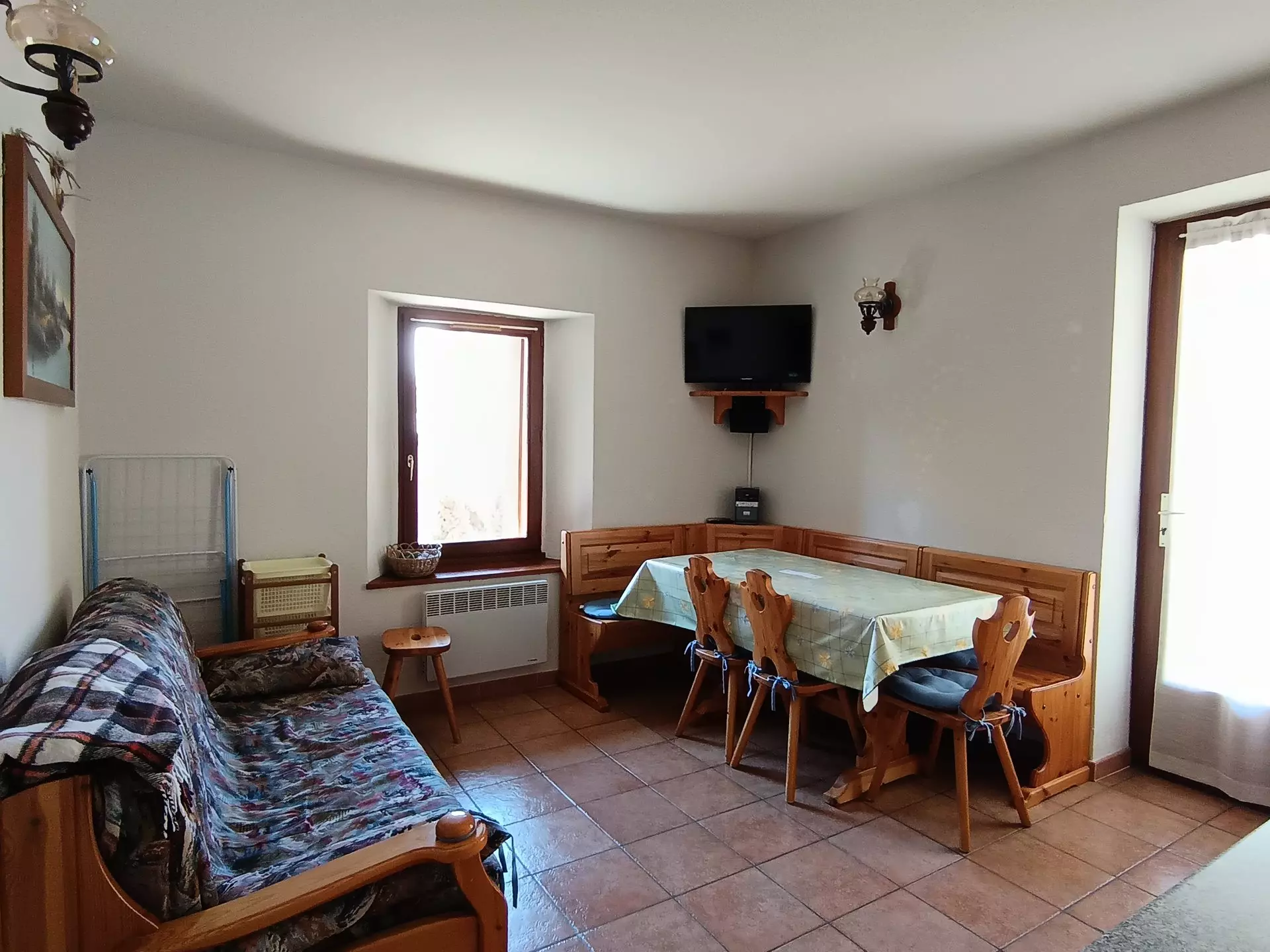 Living room: TV, 3-seater sofa, dining area with table and chairs for 6 people, balcony access with view of the slopes