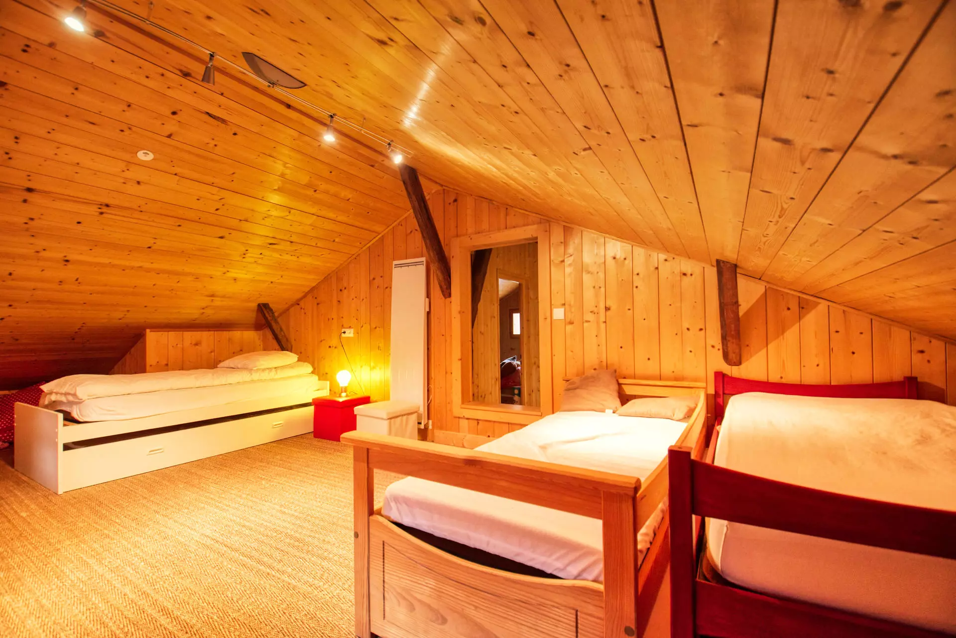 Upstairs, 1 bedroom with 1 140 cm bed and the dormitory with 2 trundle beds (sleeps 4), rush floor