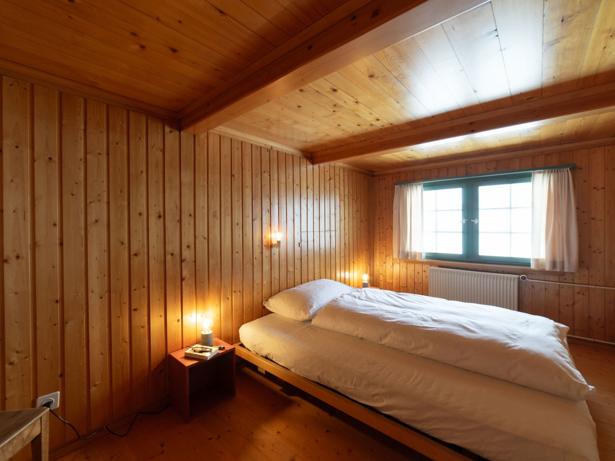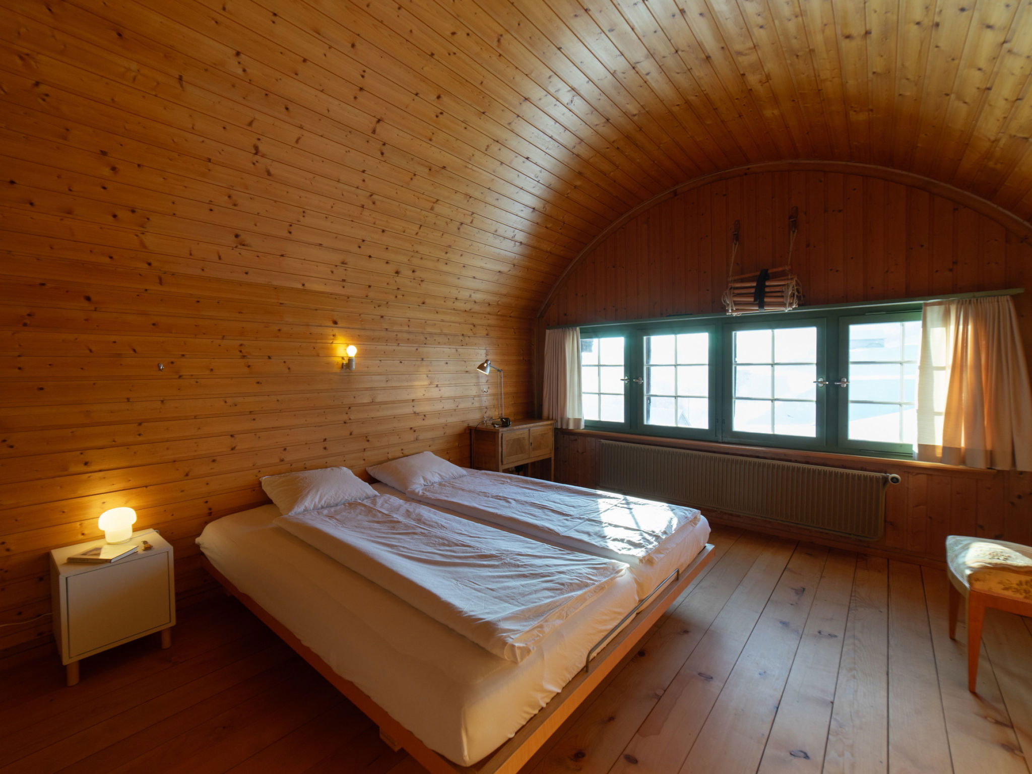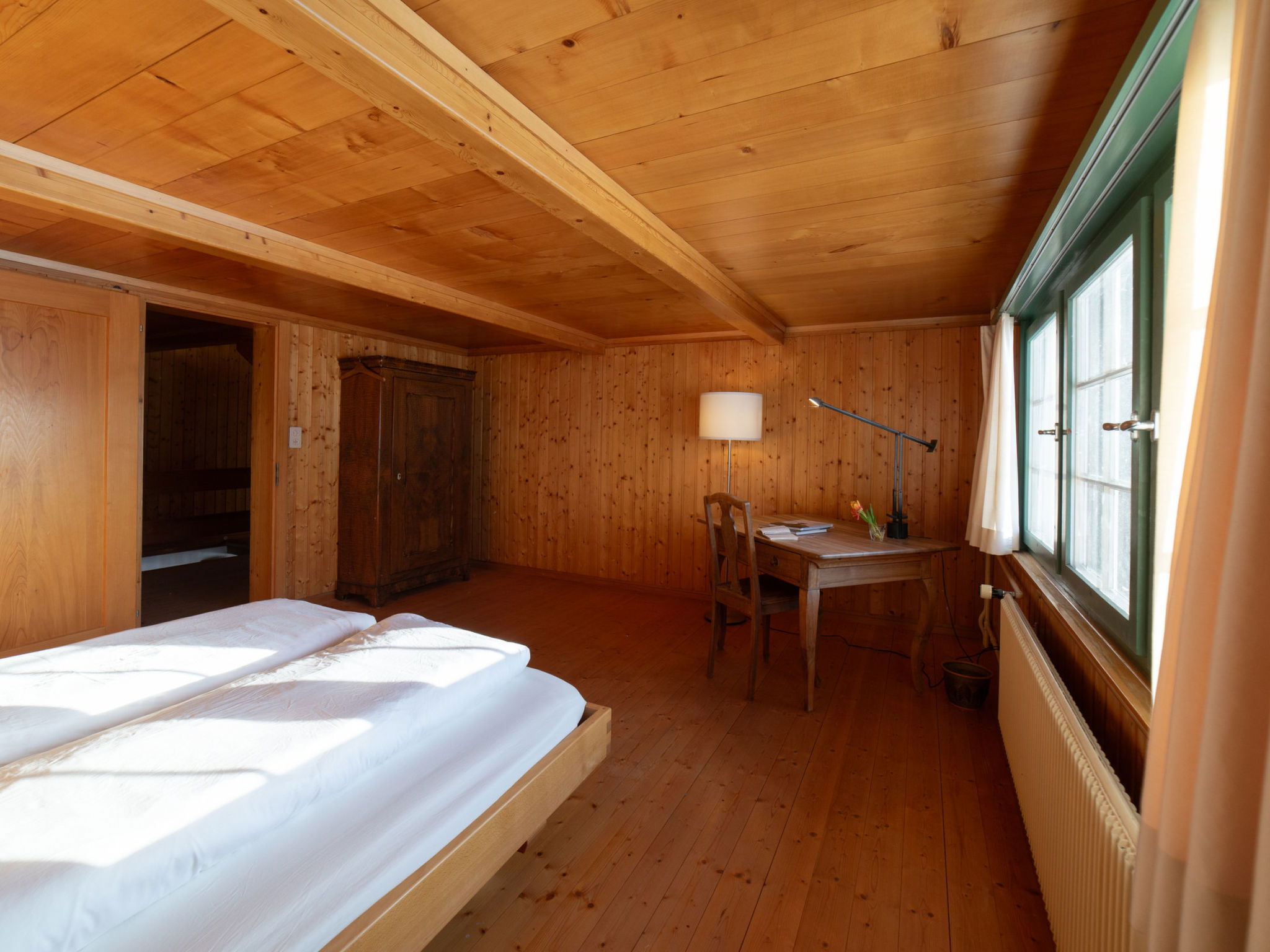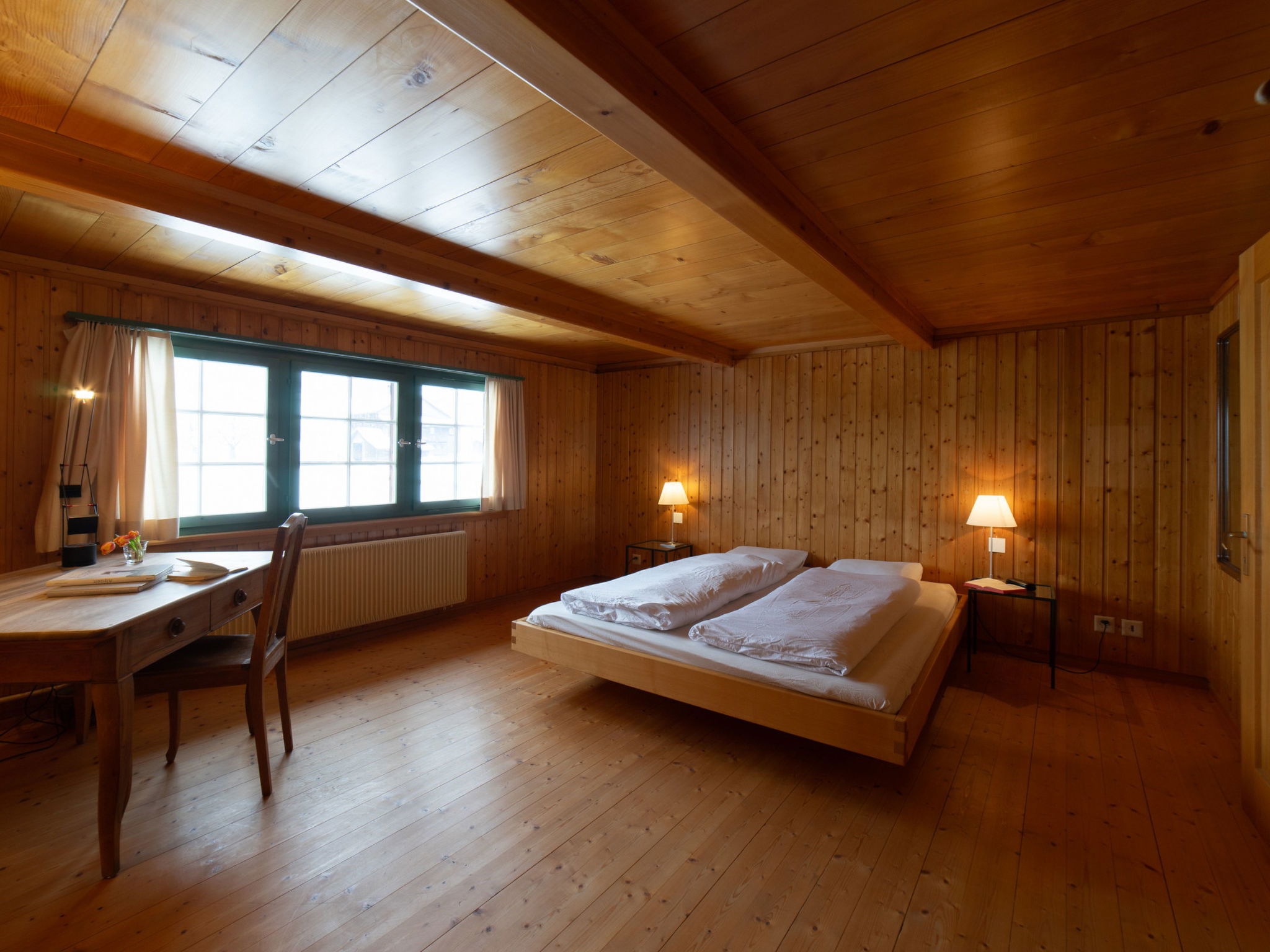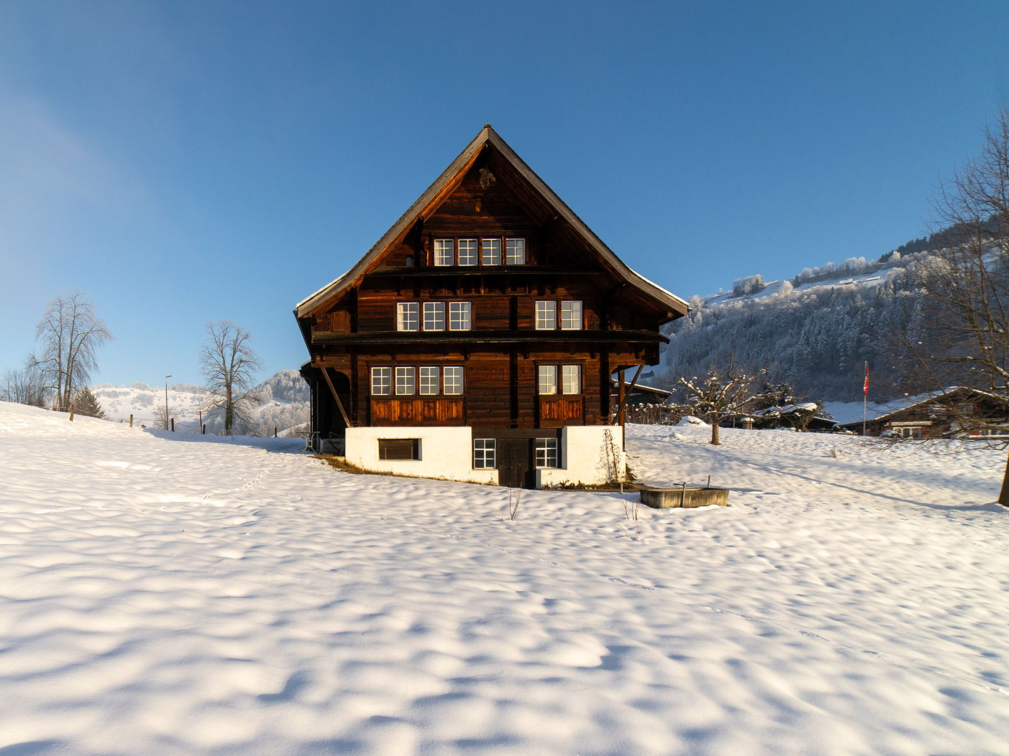 "Chammern", 4-room apartment 230 m2. Object suitable for 7 adults. 1 room with 1 double bed, open-hearth fireplace, TV and DVD. 1 room with 1 bed. 1 room with 1 french bed. 1 room with 1 double bed. Kitchen (oven, dishwasher, 4 ceramic glass hob hotplates, toaster, kettle, freezer, electric coffee machine, raclette grill). Bath/WC, sep. WC. Terrace. Barbecue. View of the mountains, the garden and the river. Facilities: washing machine, hair dryer. Internet (WiFi, free). Parking (2 cars). Please note: non-smokers only. 1 pet/ dog allowed. DescriptionThe spacious 6-room holiday house is located above Krummenau amidst meadows with fantastic views of the Churen. In both winter and summer, the nearby Wolzenalp ski area invites you to various activities such as hiking, sledding, or snowshoeing. The location serves as an ideal starting point for various activities. The Thurweg trail is right outside the door and there is plenty of space around the house for relaxation and play. Various play equipment is available and a ping-pong table can also be set up. The former farmhouse from the 18th century was renovated in the 1960s. An open entrance area with two dining areas and a kitchen provides plenty of space for cooking, dining and playing. On the upper and attic floors, there are four bedrooms and a large living room with fireplace, television and library. The house is perfect for adventurous groups and families. Only small children need to be well supervised due to the open staircase. Pets are welcome.Mandatory or included services:Baby bed : IncludedBaby high chair : IncludedBed linen : CHF 12.00 /personFinal Cleaning : CHF 210.00 /bookingHeating : IncludedInternet Access : IncludedOpen-air parking : IncludedStarter Package : CHF 25.00 /bookingTowels : CHF 8.00 /personOptional services:Pet : CHF 10.00 / dayCheck-in schedule:1.1-31.12 from 00:00 to 23:59, Monday, Tuesday, Wednesday, Thursday, Friday, Saturday, SundayCheck-out schedule: 10:00