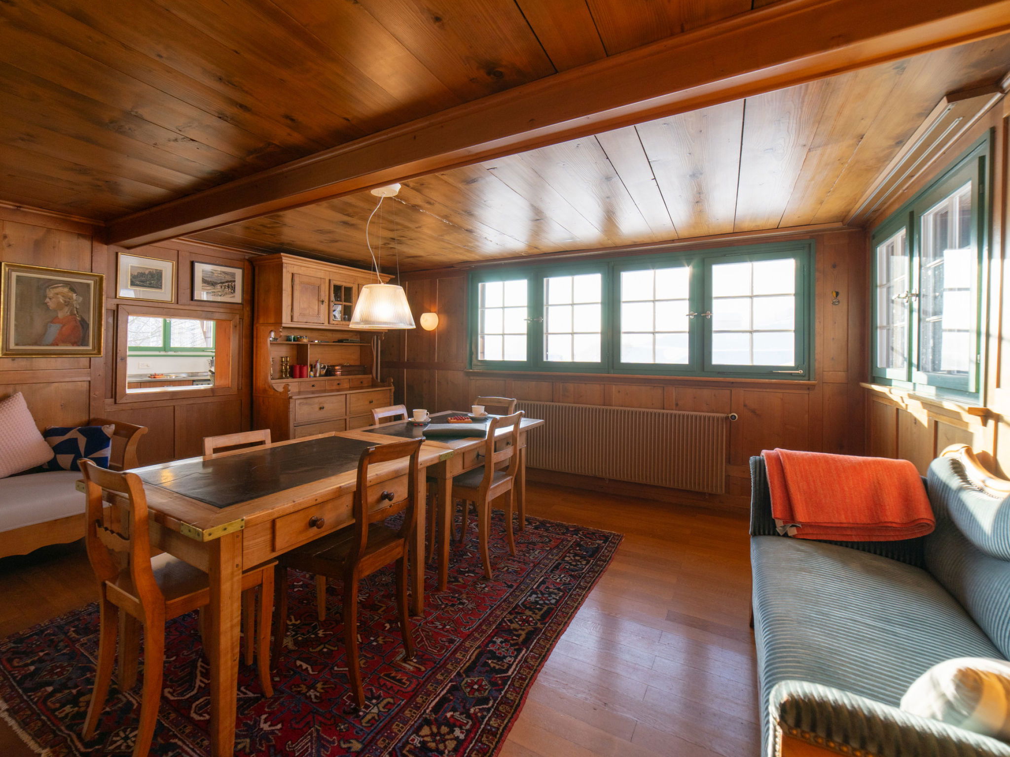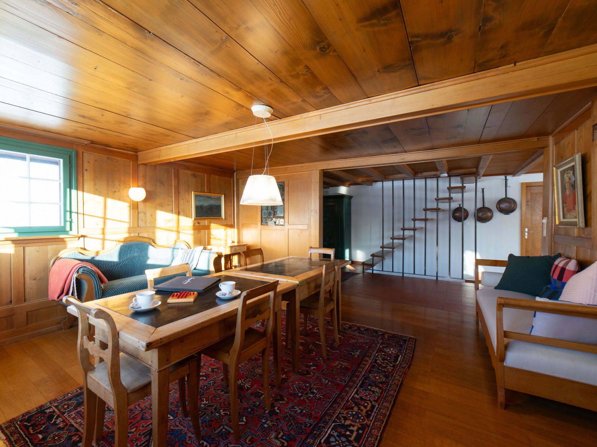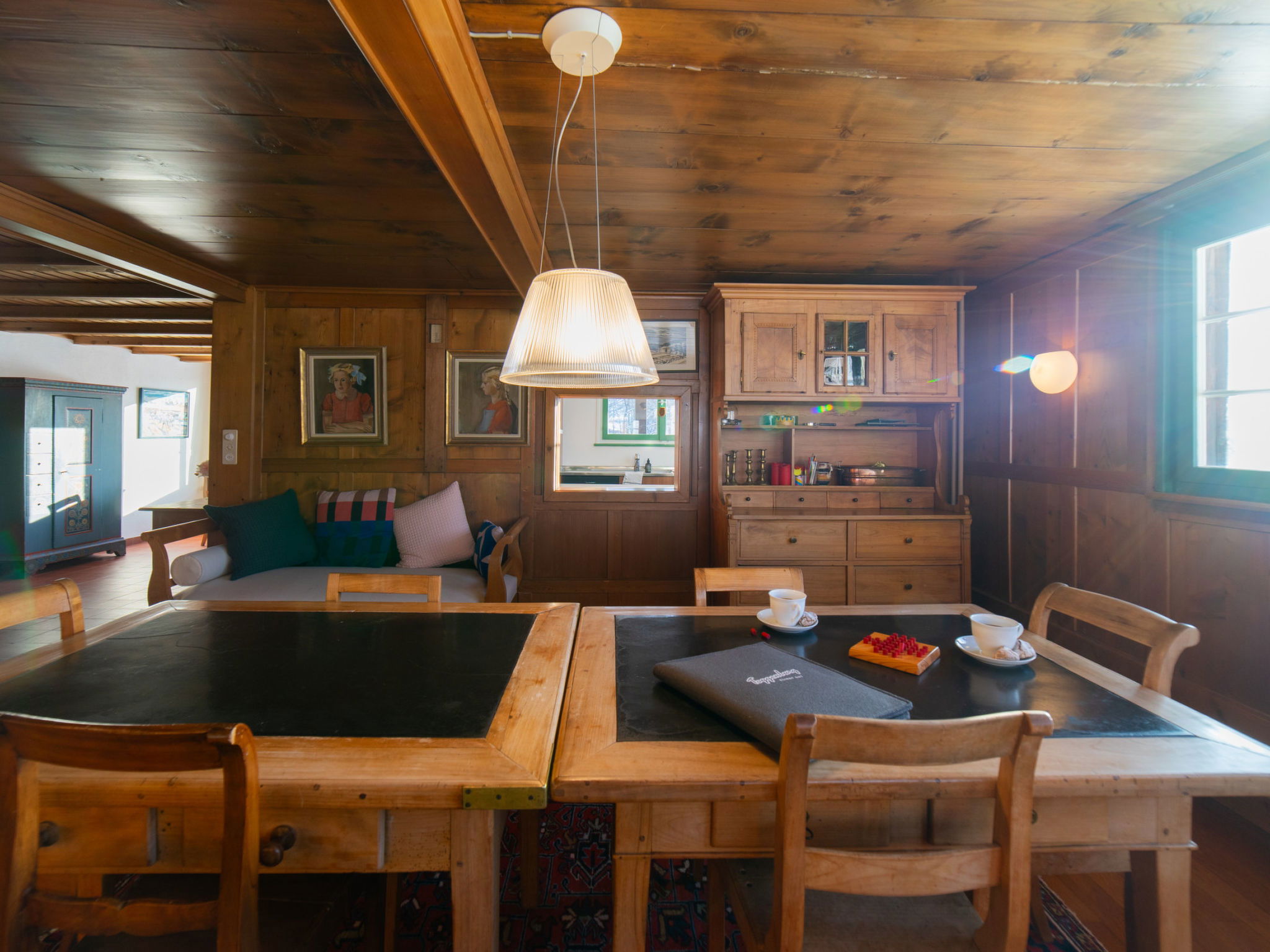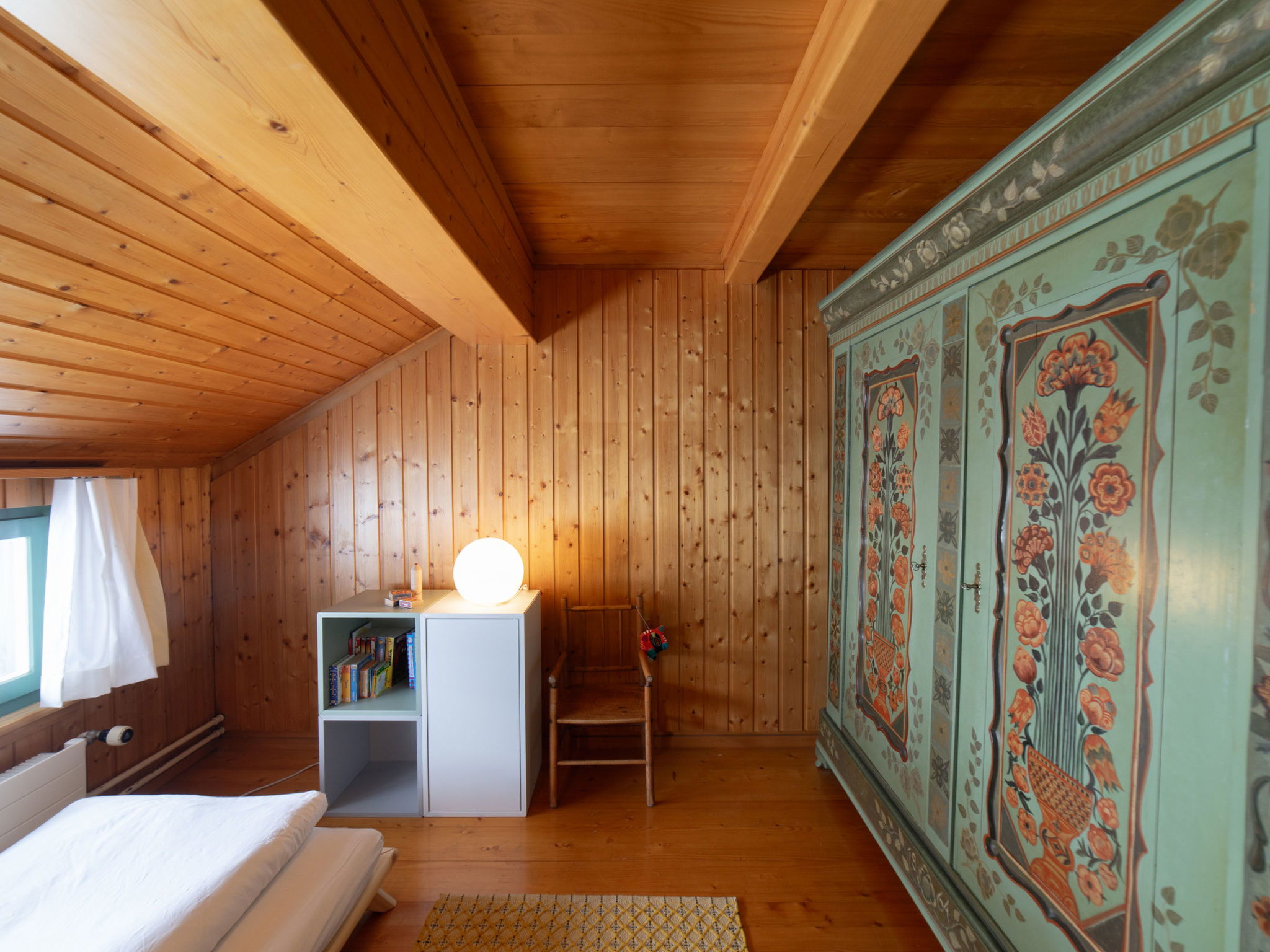 "Chammern", 4-room apartment 230 m2. Object suitable for 7 adults. 1 room with 1 double bed, open-hearth fireplace, TV and DVD. 1 room with 1 bed. 1 room with 1 french bed. 1 room with 1 double bed. Kitchen (oven, dishwasher, 4 ceramic glass hob hotplates, toaster, kettle, freezer, electric coffee machine, raclette grill). Bath/WC, sep. WC. Terrace. Barbecue. View of the mountains, the garden and the river. Facilities: washing machine, hair dryer. Internet (WiFi, free). Parking (2 cars). Please note: non-smokers only. 1 pet/ dog allowed. DescriptionThe spacious 6-room holiday house is located above Krummenau amidst meadows with fantastic views of the Churen. In both winter and summer, the nearby Wolzenalp ski area invites you to various activities such as hiking, sledding, or snowshoeing. The location serves as an ideal starting point for various activities. The Thurweg trail is right outside the door and there is plenty of space around the house for relaxation and play. Various play equipment is available and a ping-pong table can also be set up. The former farmhouse from the 18th century was renovated in the 1960s. An open entrance area with two dining areas and a kitchen provides plenty of space for cooking, dining and playing. On the upper and attic floors, there are four bedrooms and a large living room with fireplace, television and library. The house is perfect for adventurous groups and families. Only small children need to be well supervised due to the open staircase. Pets are welcome.Mandatory or included services:Baby bed : IncludedBaby high chair : IncludedBed linen : CHF 12.00 /personFinal Cleaning : CHF 210.00 /bookingHeating : IncludedInternet Access : IncludedOpen-air parking : IncludedStarter Package : CHF 25.00 /bookingTowels : CHF 8.00 /personOptional services:Pet : CHF 10.00 / dayCheck-in schedule:1.1-31.12 from 00:00 to 23:59, Monday, Tuesday, Wednesday, Thursday, Friday, Saturday, SundayCheck-out schedule: 10:00