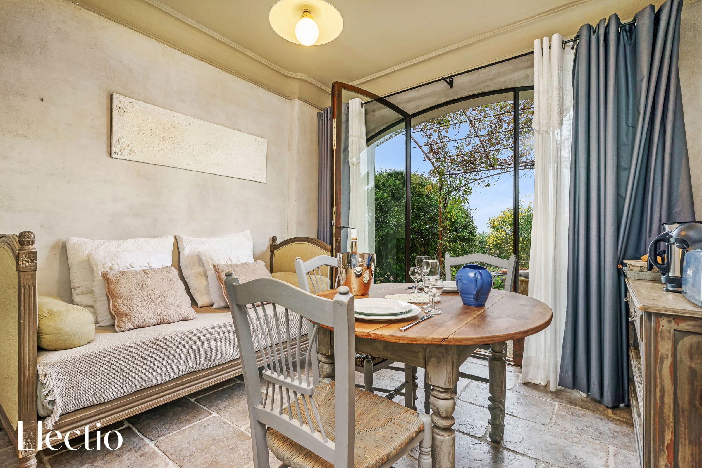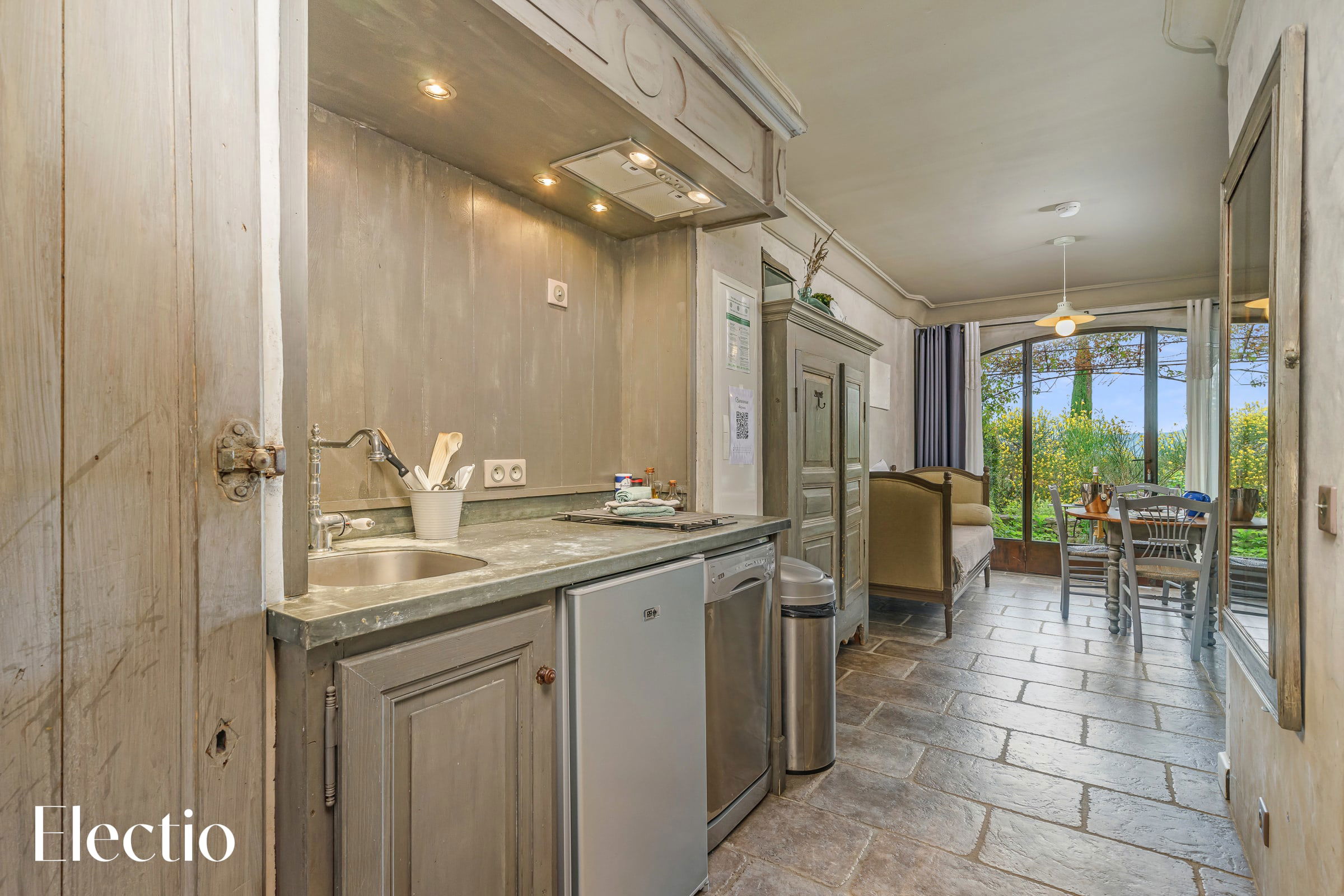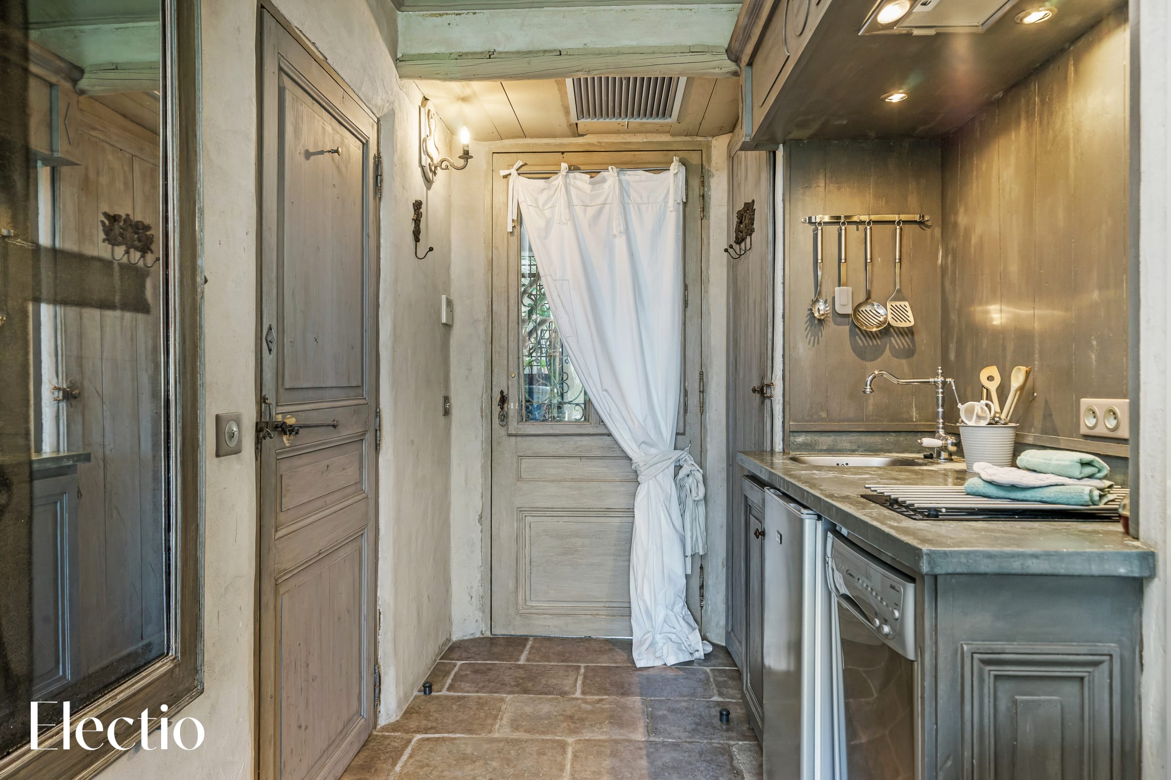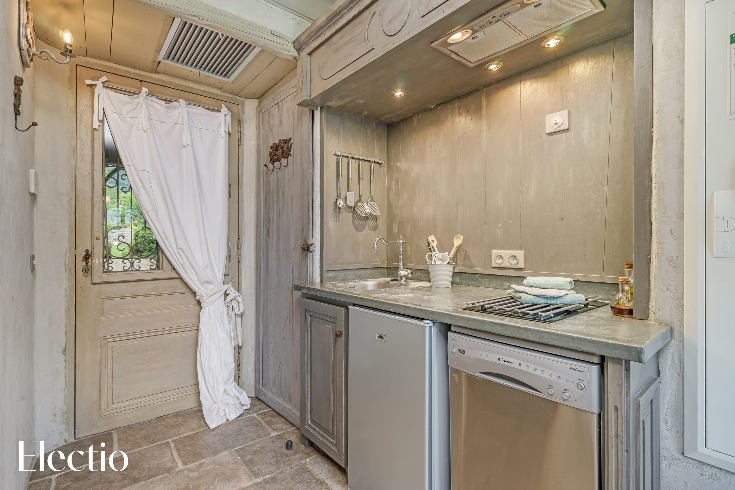 ☀️ The living room and bedroom open onto a terrace paved with clapissette, shaded by a wrought iron arbor covered with Virginia creeper and bordered by broom, creating an intimate and peaceful space. The bedroom is equipped with a 160 cm bed with a canopy and linen curtains, adding a touch of elegance. The Burgundy stone floor enhances the character of the space.