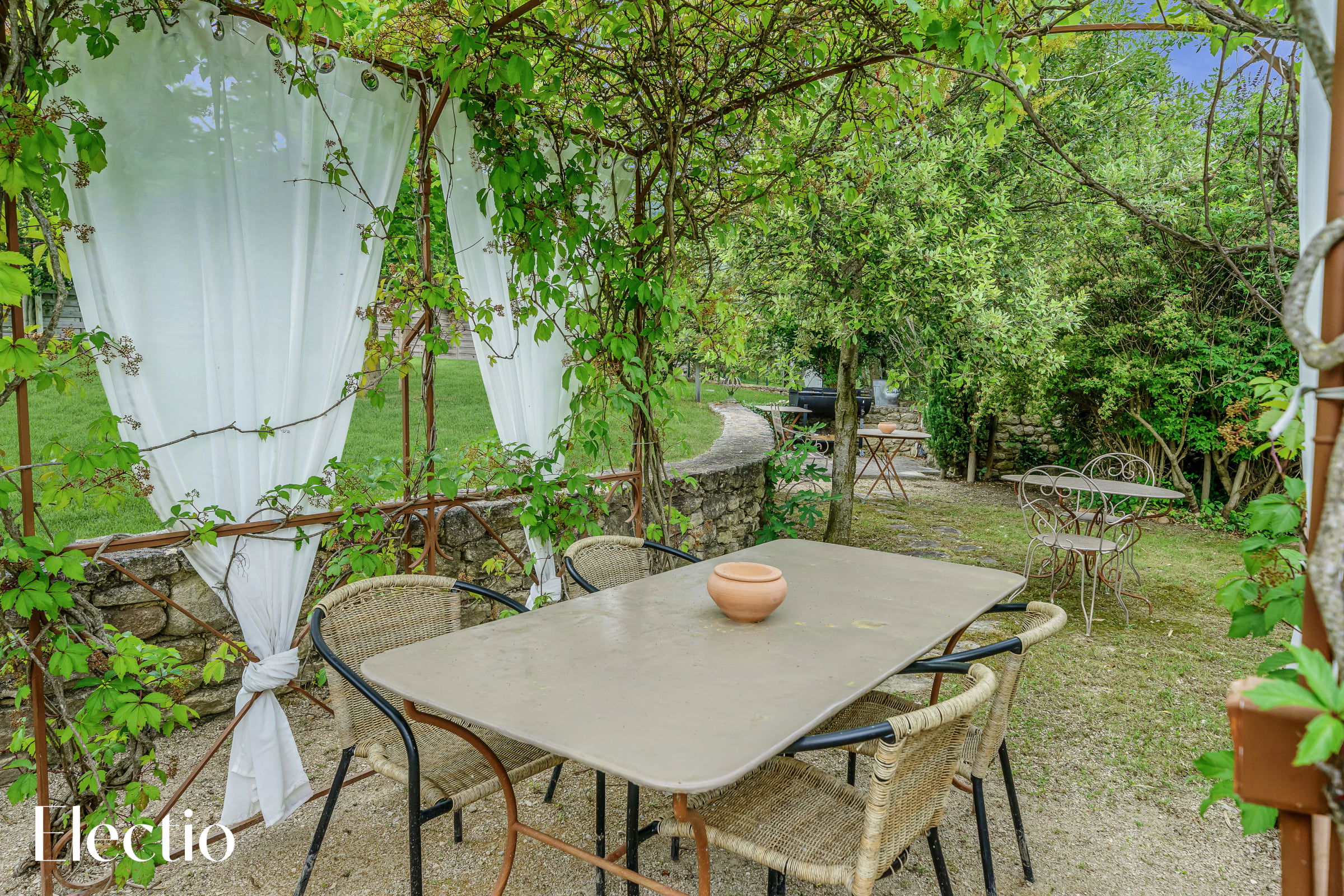 The residence's outdoor spaces are beautifully landscaped to offer you an authentic Provençal experience. You’ll find shaded areas with pergolas, white curtains, plane trees, and stone benches for relaxing. A charcoal barbecue is available for your use, with charcoal easily found in a nearby supermarket. The typical Provençal vegetation – century-old olive trees, broom, oleanders, and lavender – creates an enchanting atmosphere. A fountain and a bell tower add even more charm to the setting.